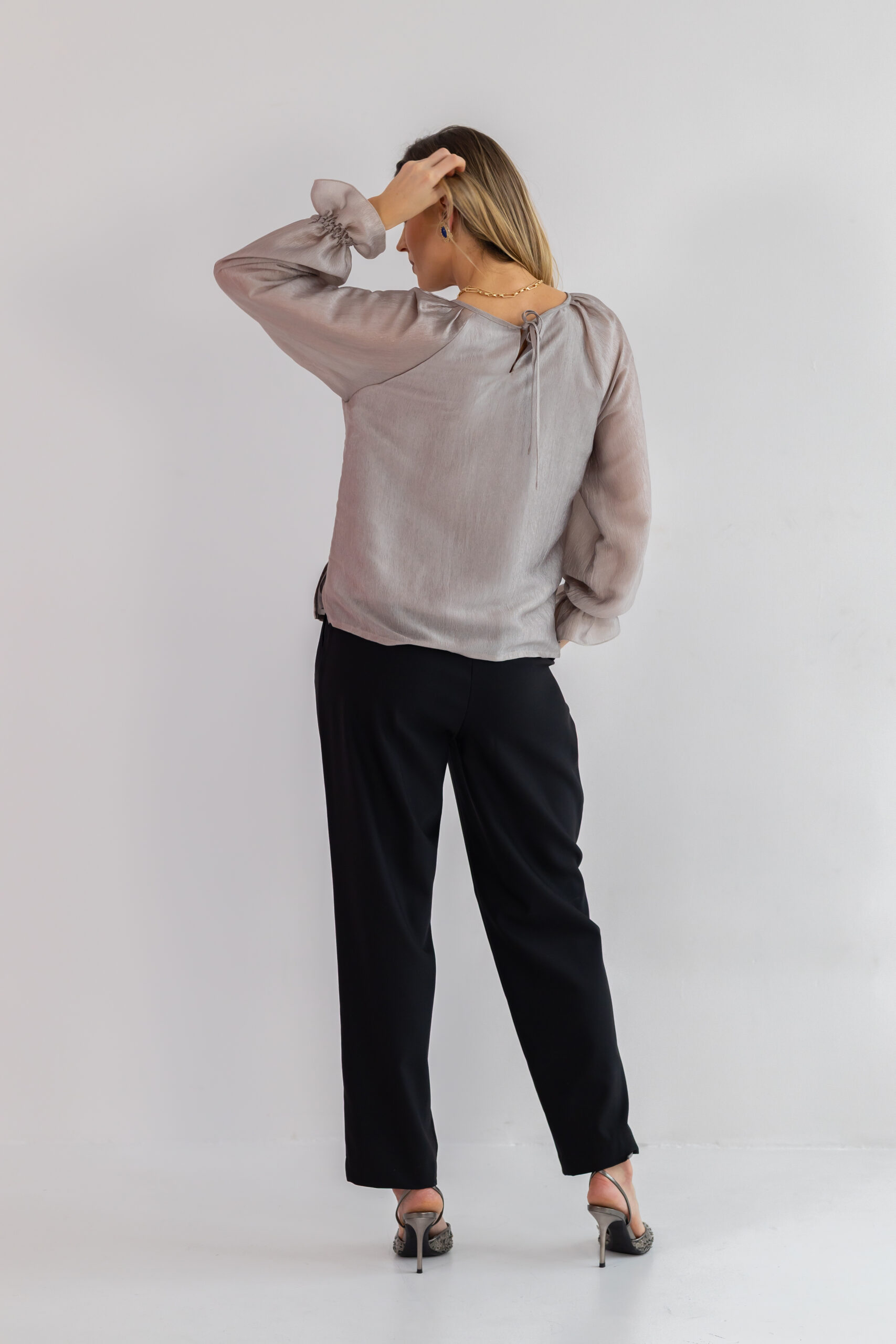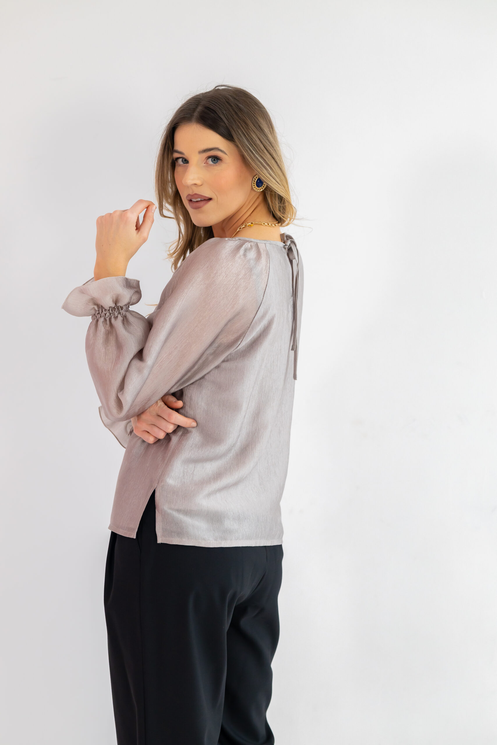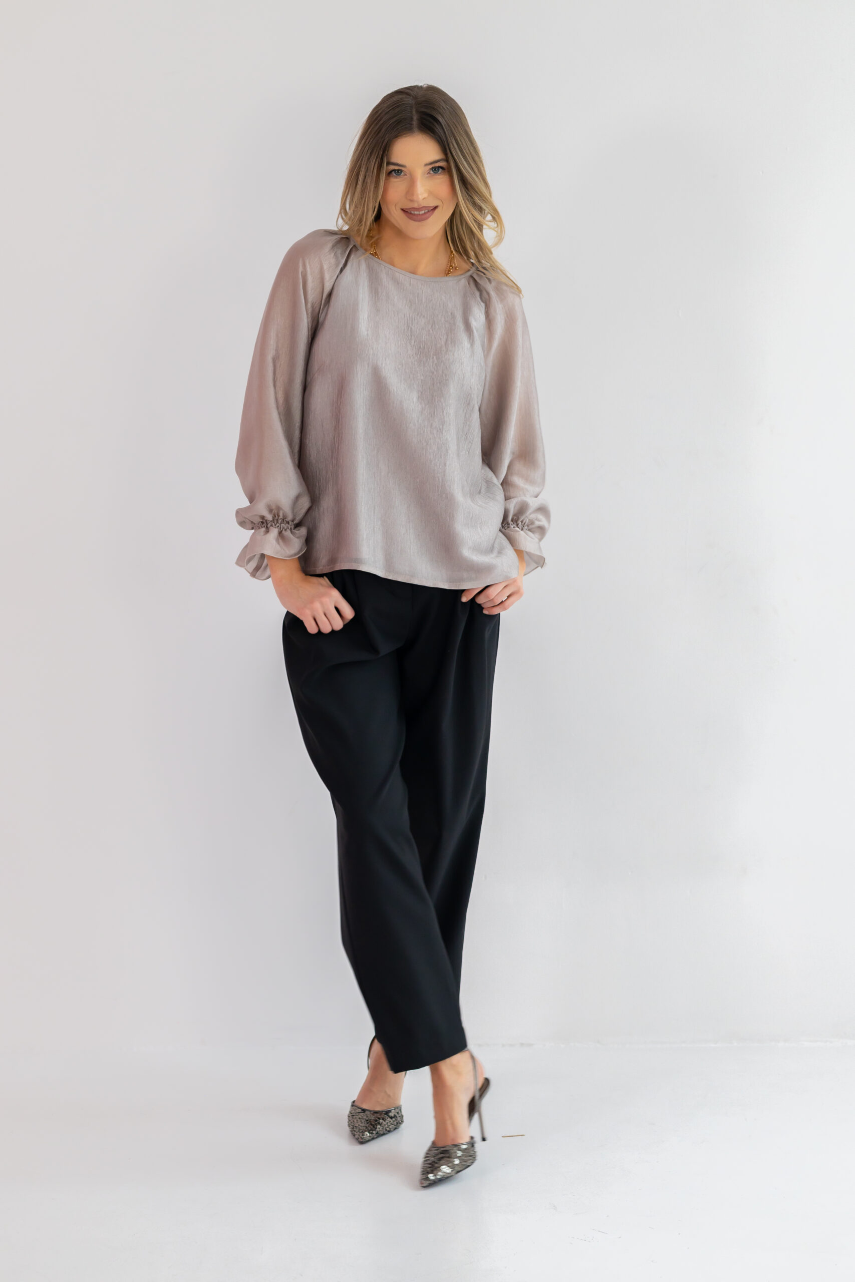Okrągły dekolt z tyłu wiązany na troczki dodaje wdzięku i pozwala regulować styl bluzki — od bardziej swobodnego, po lekko elegancki. Długi rękaw typu raglan nie ogranicza ruchów, a falbanka i drobne gumeczki przy mankietach podkreślają kobiecy, romantyczny charakter. Subtelne zakładki na ramionach dodają struktury i lekko unoszą linię ramion. Prosty dół z rozcięciami po bokach zapewnia wygodę i sprawia, że bluzka świetnie prezentuje się zarówno wpuszczona, jak i noszona luźno.