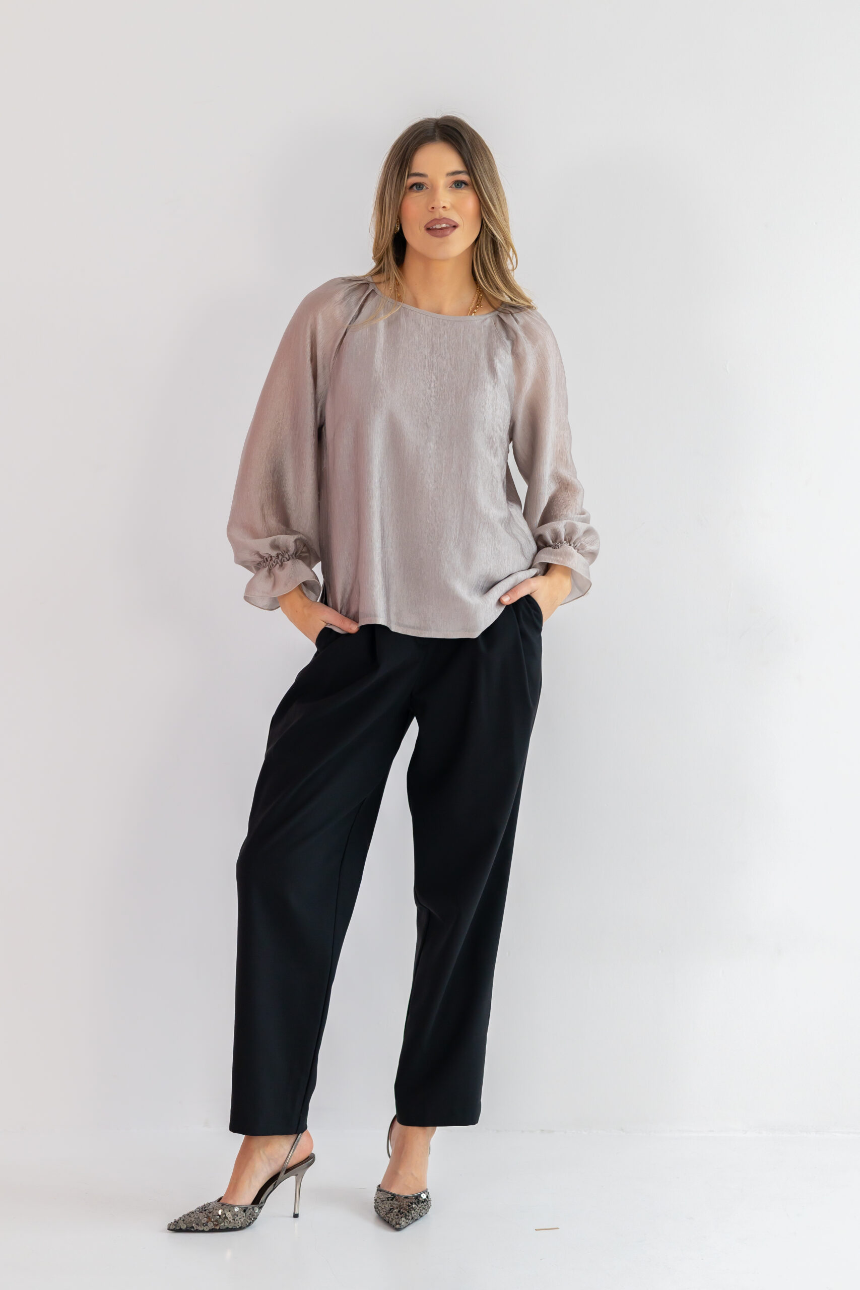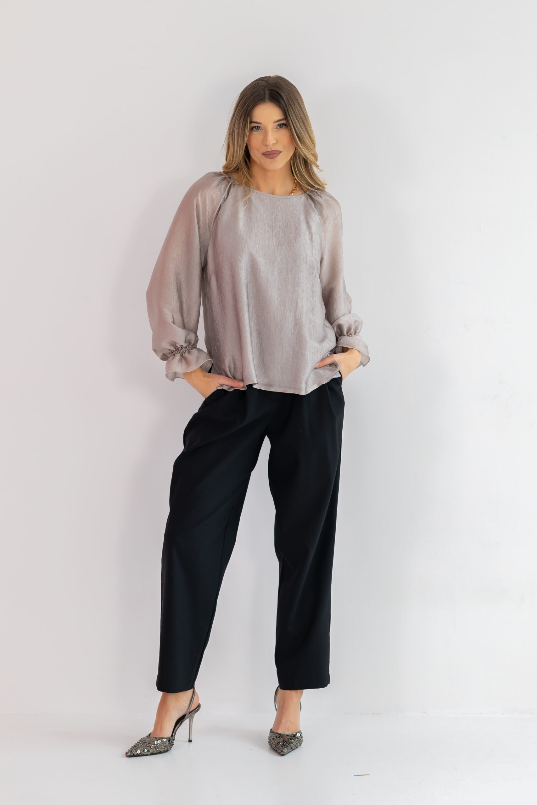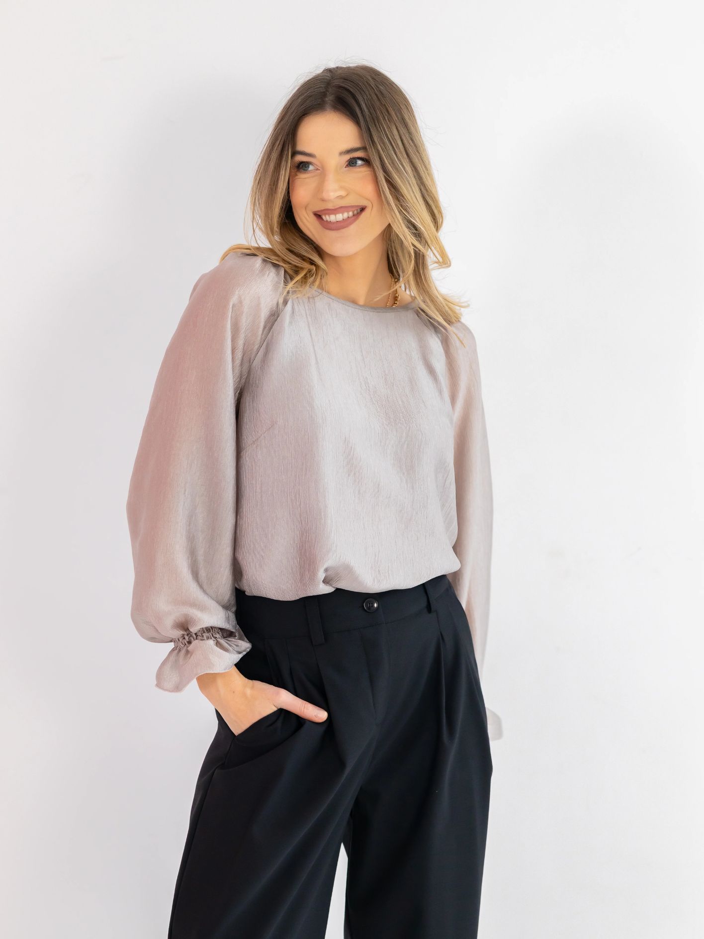 Okrągły dekolt z tyłu wiązany na troczki dodaje wdzięku i pozwala regulować styl bluzki — od bardziej swobodnego, po lekko elegancki. Długi rękaw typu raglan nie ogranicza ruchów, a falbanka i drobne gumeczki przy mankietach podkreślają kobiecy, romantyczny charakter. Subtelne zakładki na ramionach dodają struktury i lekko unoszą linię ramion. Prosty dół z rozcięciami po bokach zapewnia wygodę i sprawia, że bluzka świetnie prezentuje się zarówno wpuszczona, jak i noszona luźno.