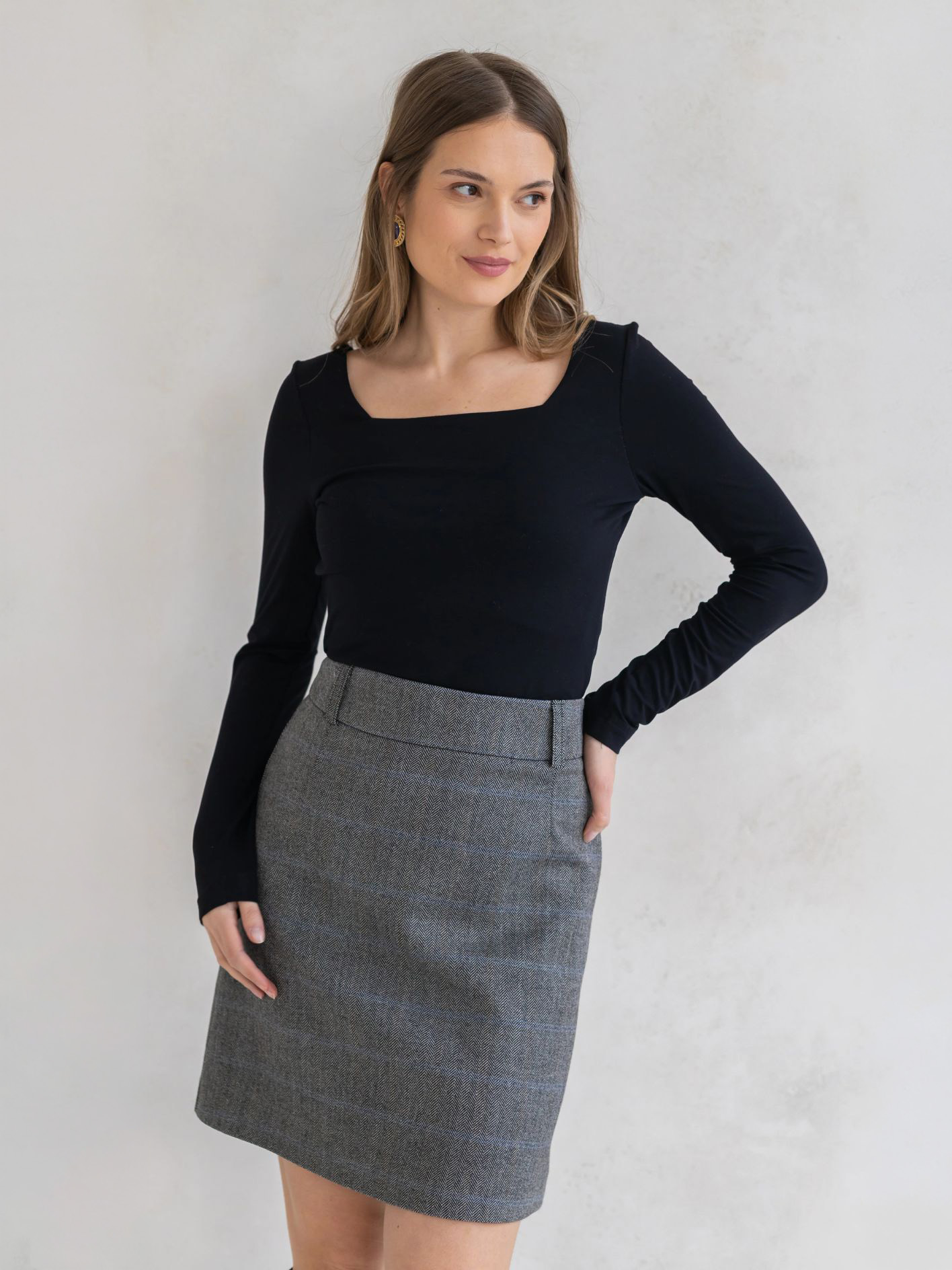 Charakterystyczny dekolt karo subtelnie podkreśla linię obojczyków i dodaje sylwetce elegancji, nadając całości bardziej wyrafinowany charakter niż klasyczny okrągły dekolt. To detal, który sprawia, że nawet najprostsza stylizacja zyskuje wyjątkowy akcent.
