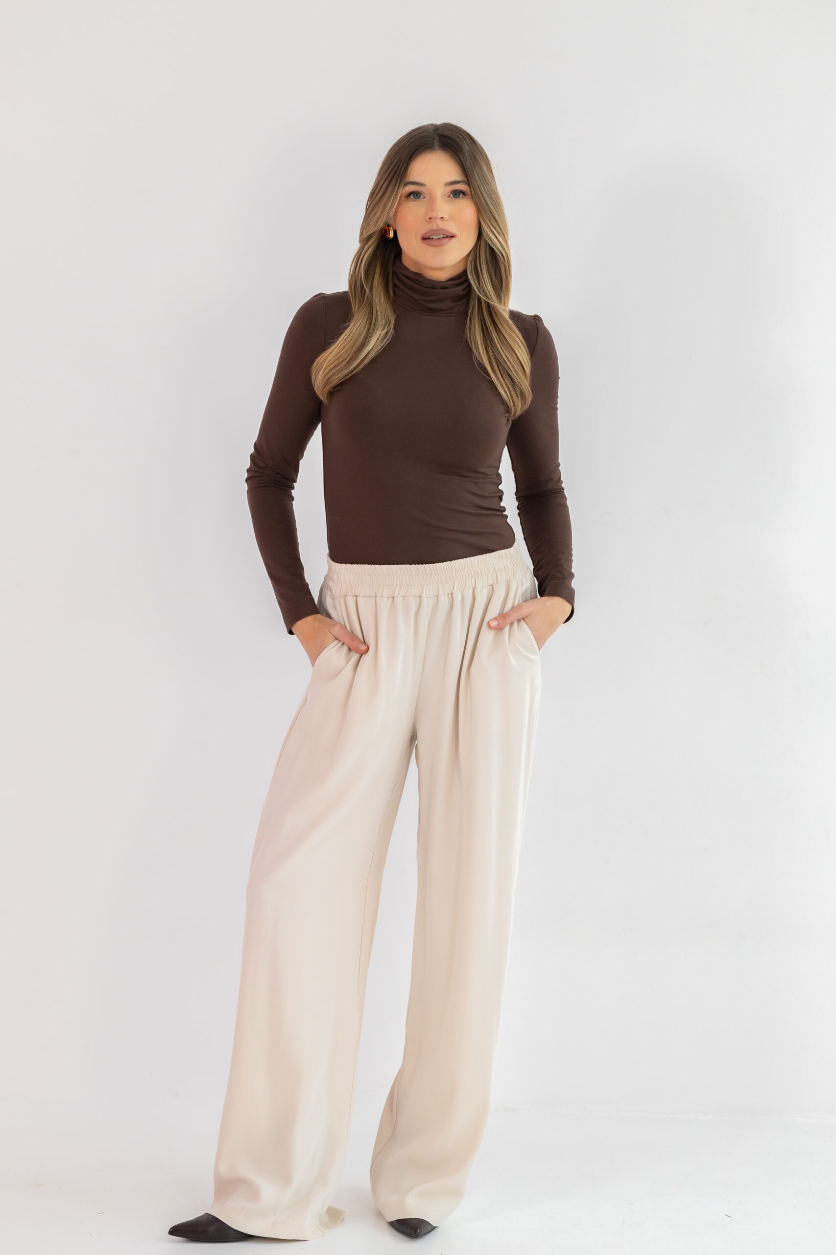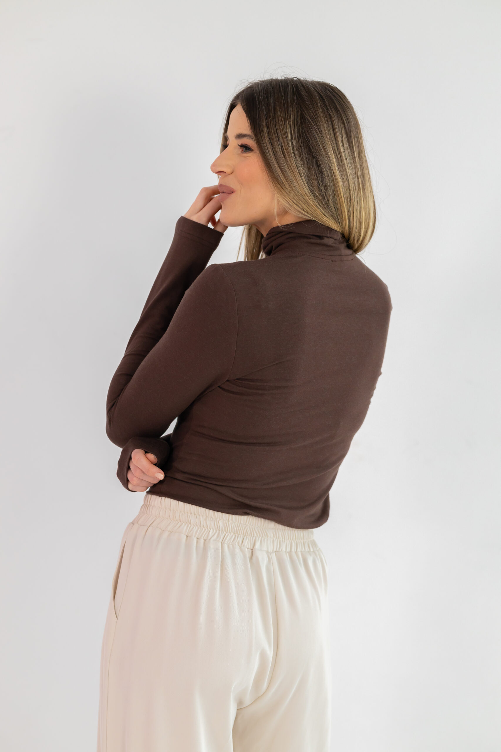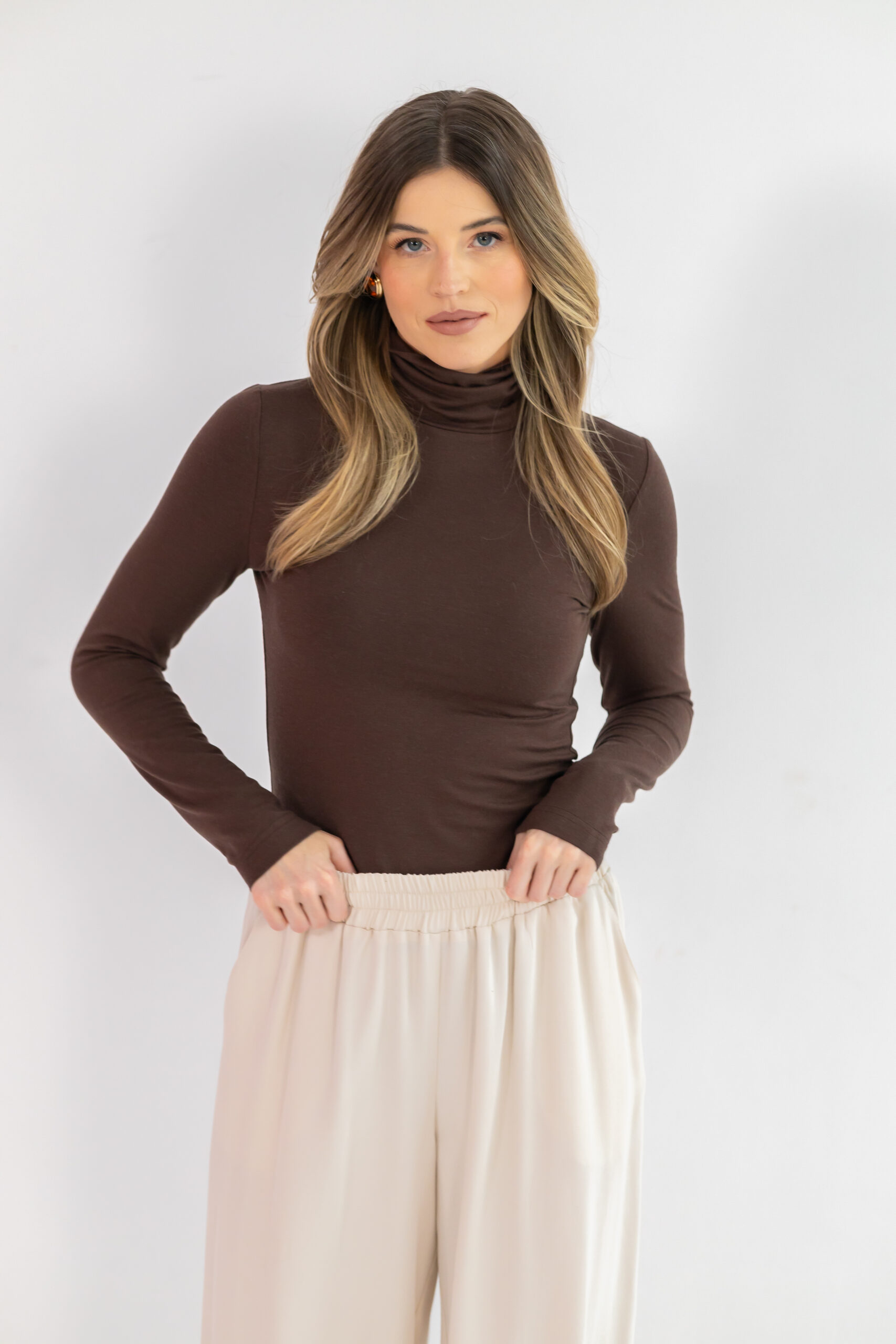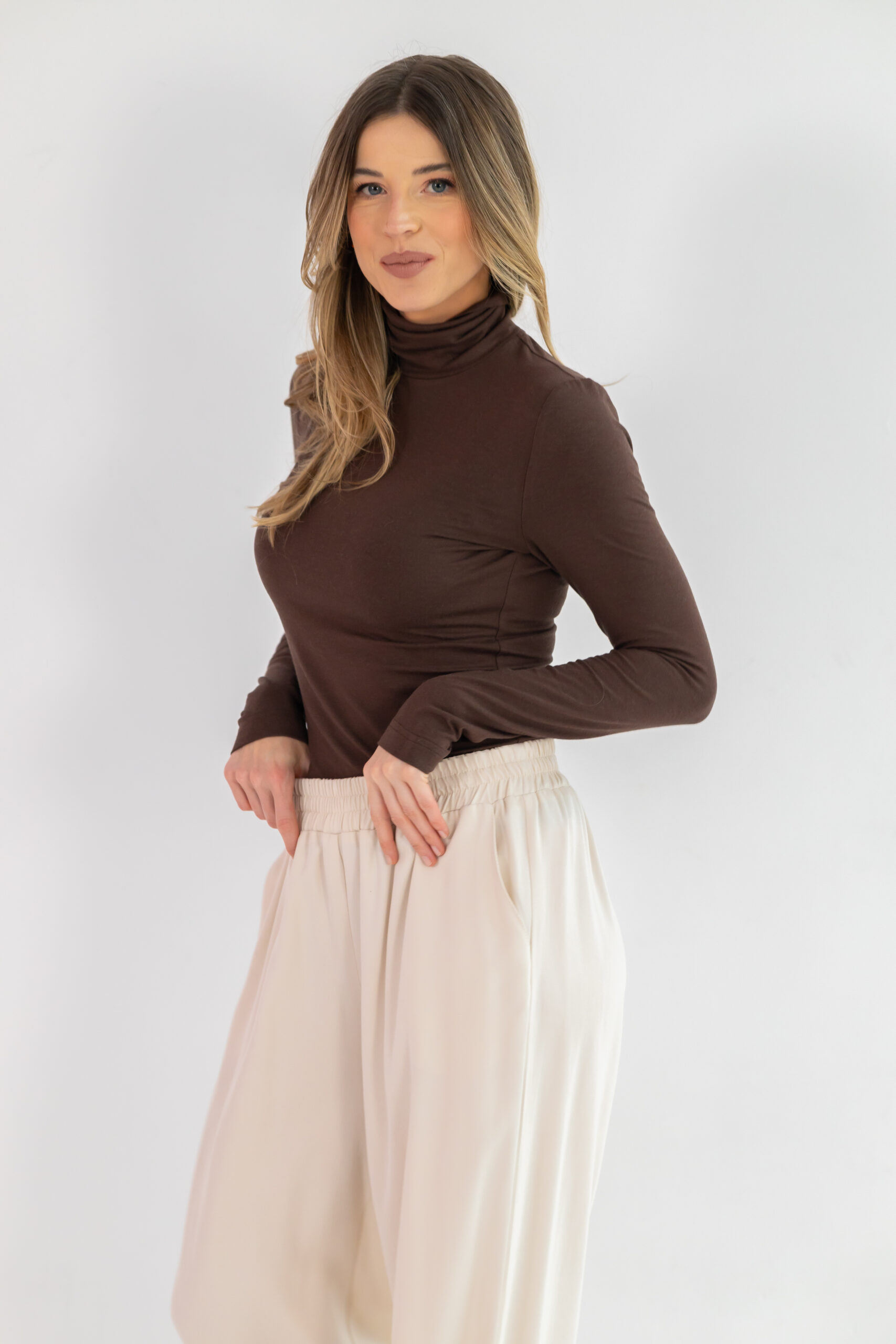 Dopasowany golf LANA w odcieniu mlecznej czekolady został wykonany z wysokiej jakości dzianiny, będącej mieszanką wiskozy, wełny i elastanu, która łączy miękkość, naturalne ciepło i elastyczność zapewniającą idealne dopasowanie do sylwetki.