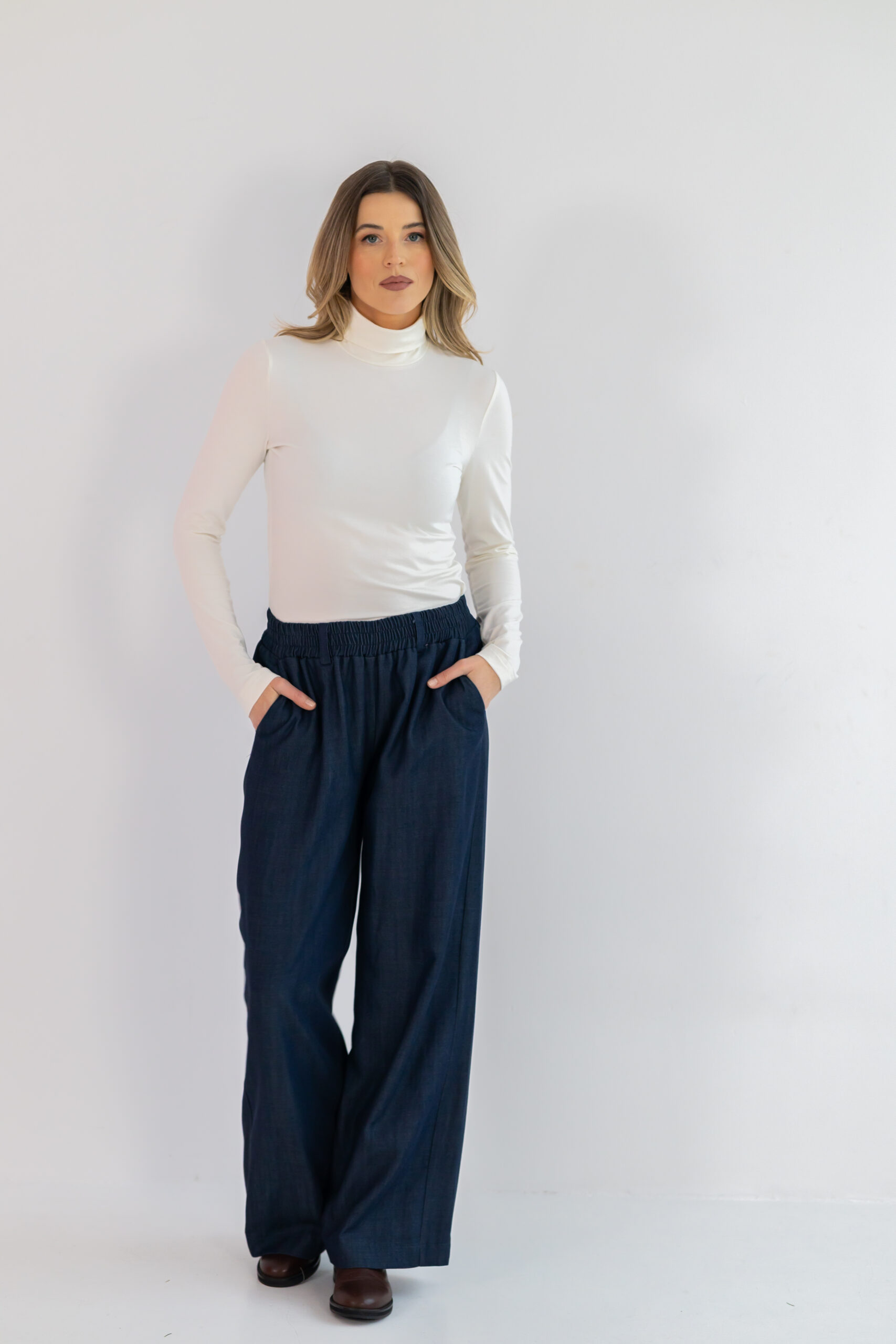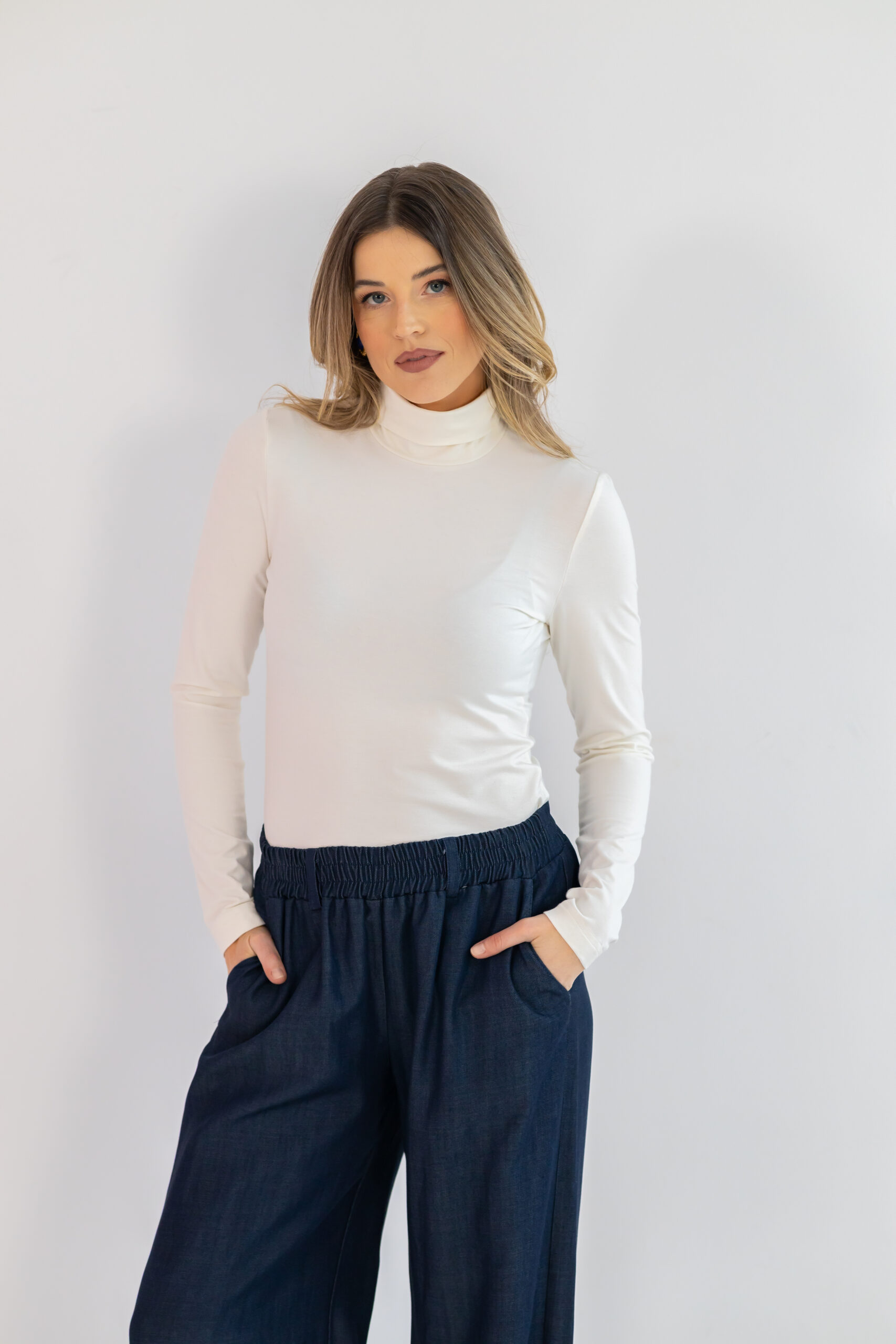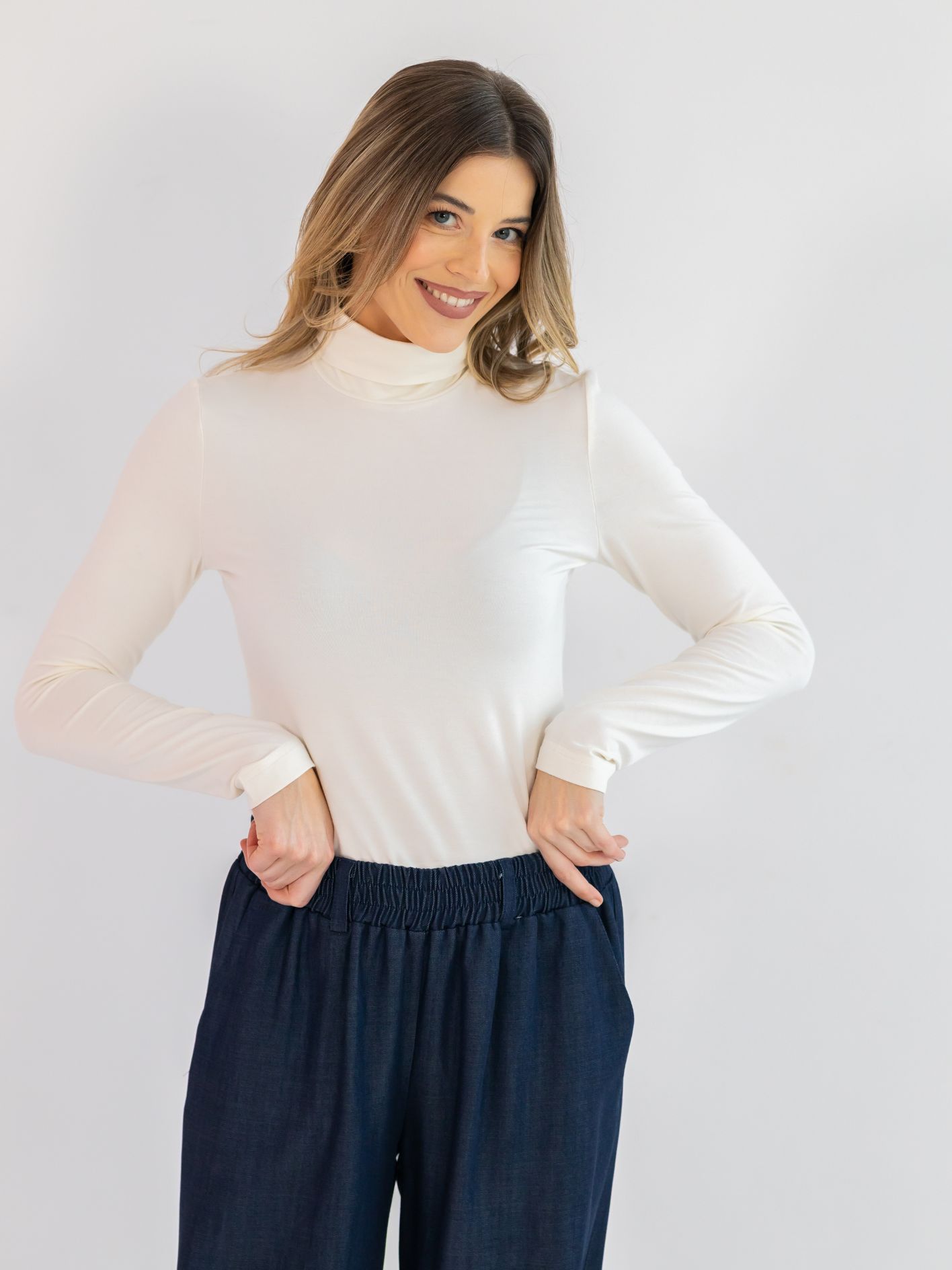 Dopasowany golf LANA w odcieniu złamanej bieli został wykonany z wysokiej jakości dzianiny, będącej mieszanką wiskozy, wełny i elastanu, która łączy miękkość, naturalne ciepło i elastyczność zapewniającą idealne dopasowanie do sylwetki.