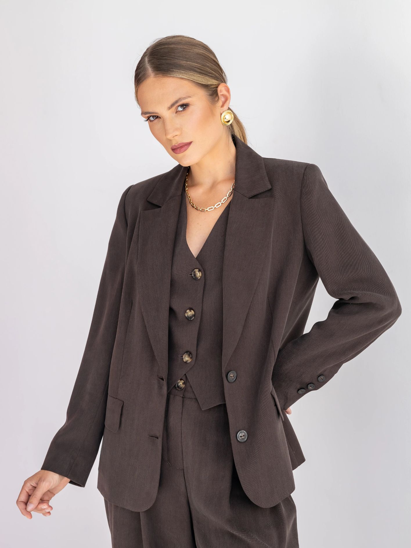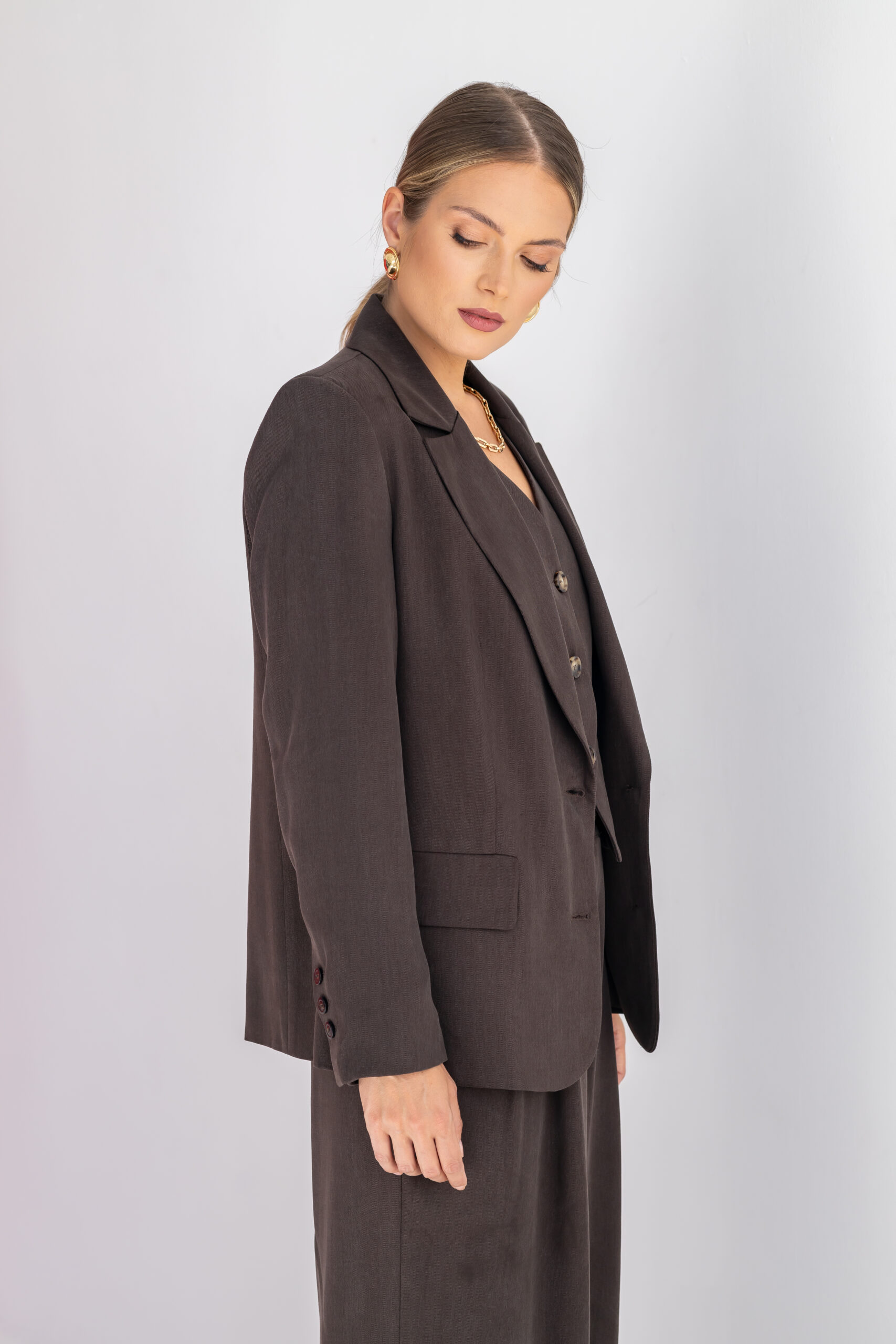 Marynarka BLAIR to kwintesencja klasyki i wygody. Jej lekko oversizowy krój sprawia, że jest uniwersalna i komfortowa, a jednocześnie niezwykle elegancka. Uszyta z wysokiej jakości tencelu zapewnia oddychalność oraz miękkość, dzięki czemu poczujesz się komfortowo przez cały dzień.
