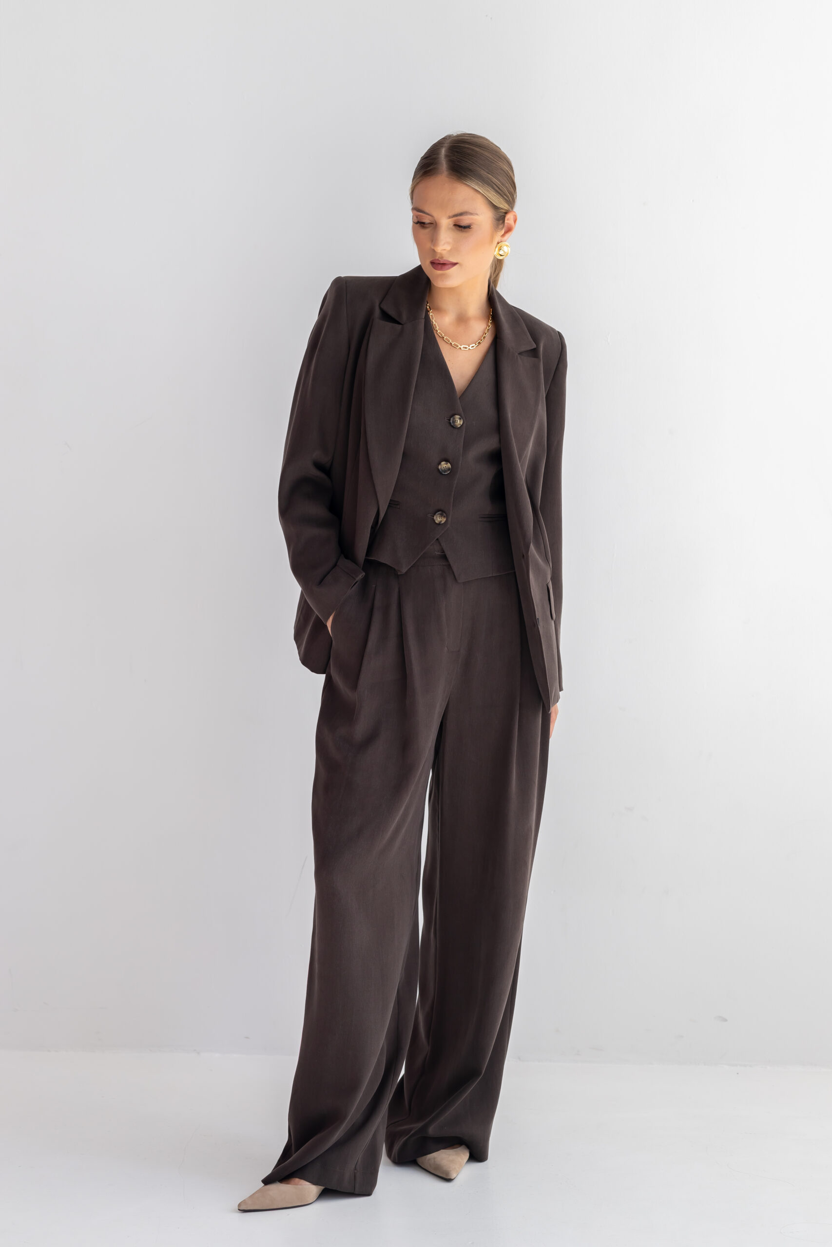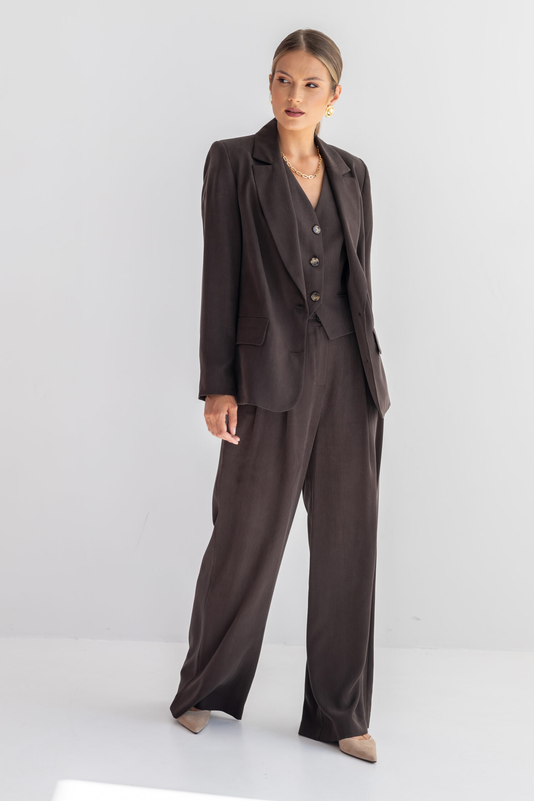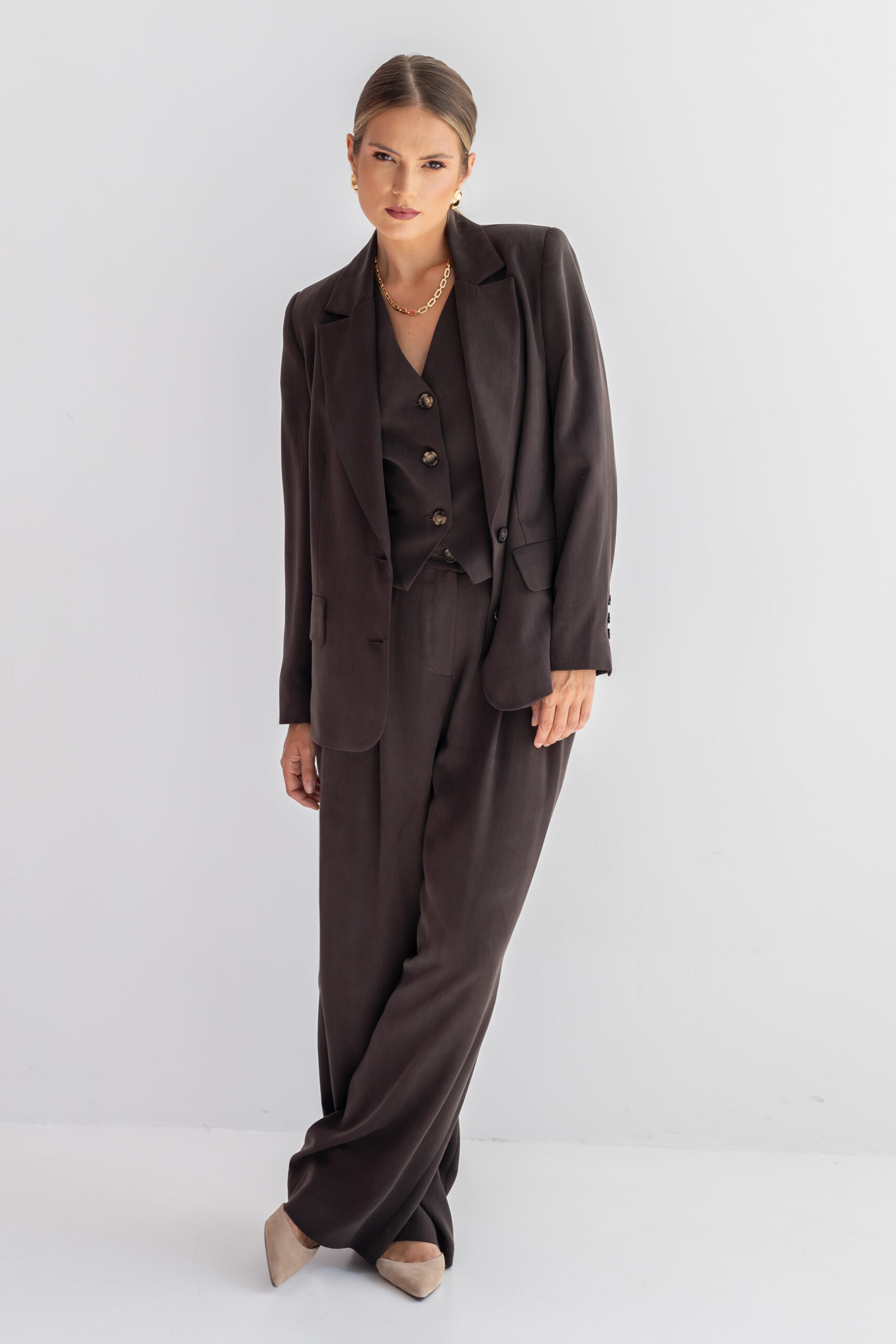 Klasyczny jednorzędowy krój nadaje jej ponadczasowy urok, który doskonale wpisuje się klasyczny styl, odporny na zmieniające się trendy. Kieszenie z klapami oraz rozporek z tyłu dodają marynarce subtelnego charakteru, a zarazem sprawiają, że jest funkcjonalna i wygodna w noszeniu. Marynarka BLAIR doskonale sprawdzi się w stylizacjach biurowych, ale także jako wygodny wybór na spotkania ze znajomymi czy bardziej casualowe wyjścia. Aby stworzyć z nią garniturowy komplet wybierz spodnie i kamizelkę CLARA BROWNIE.