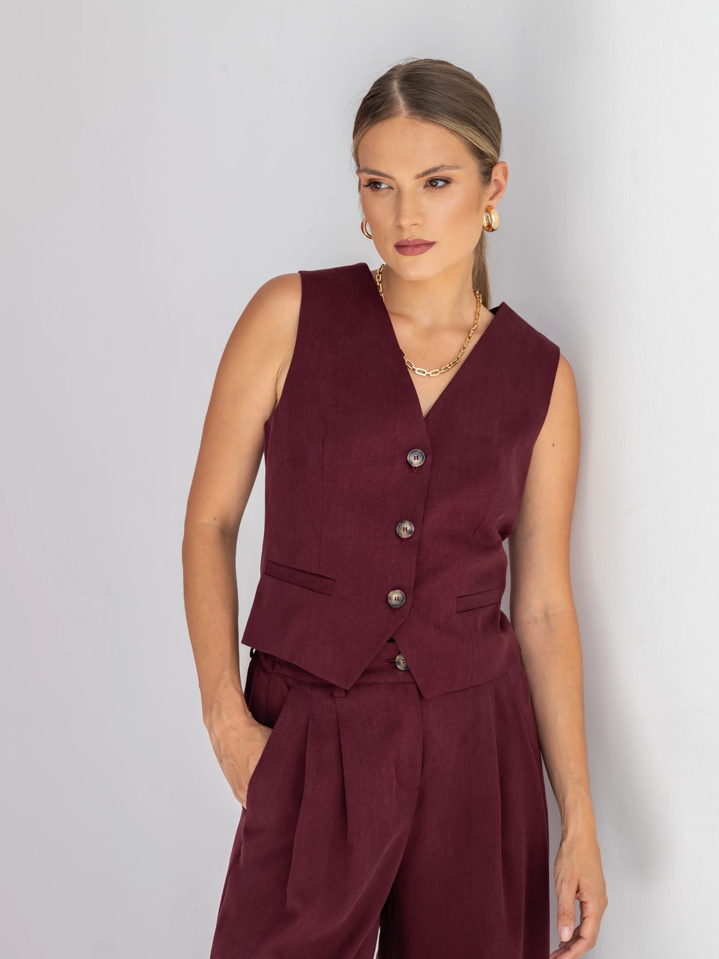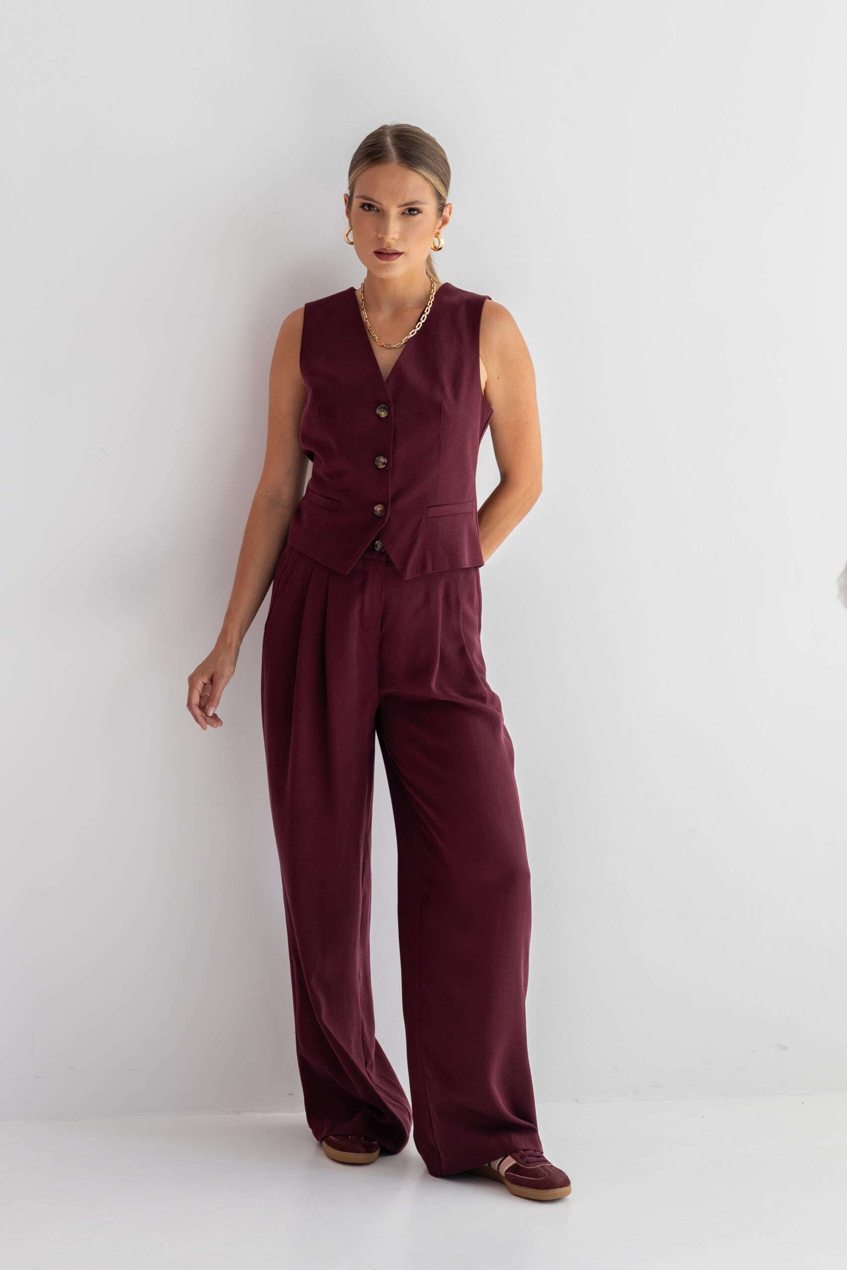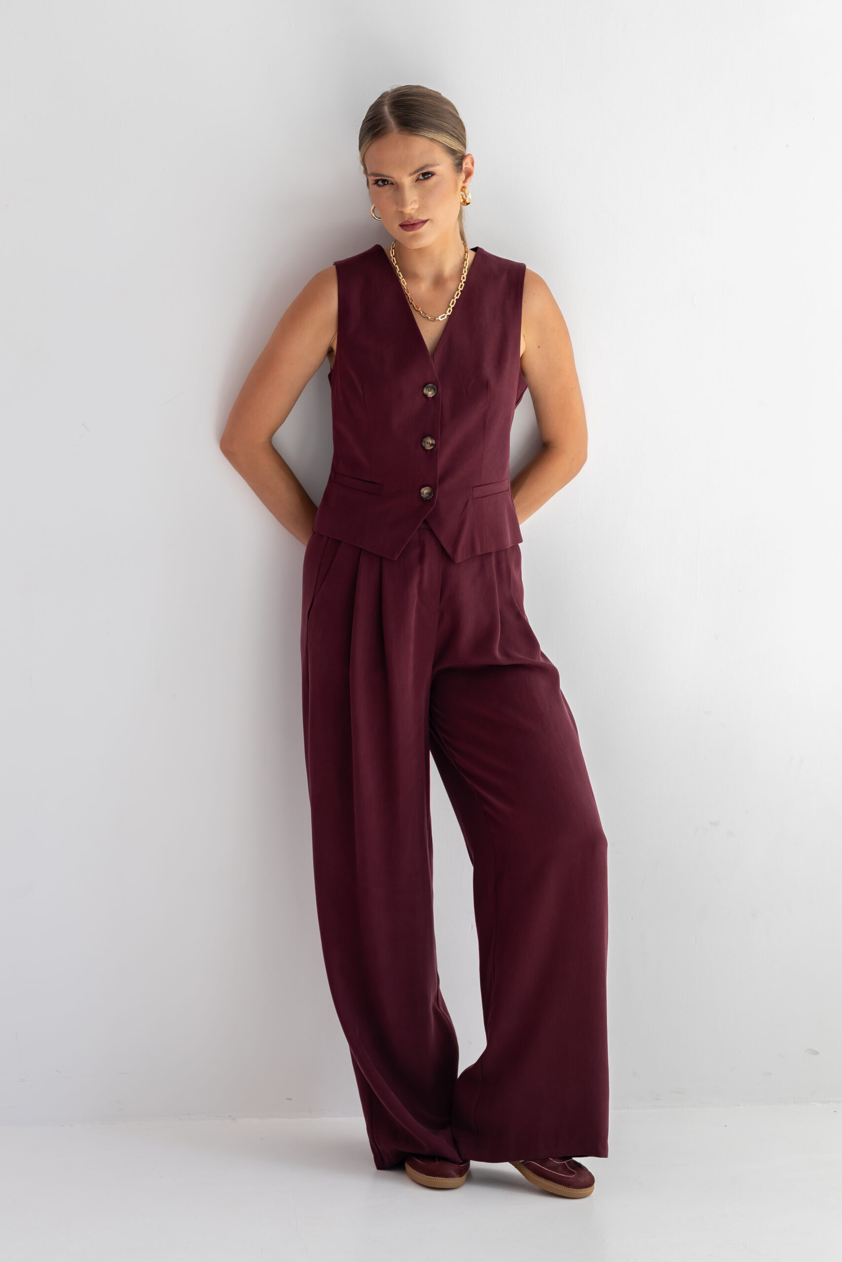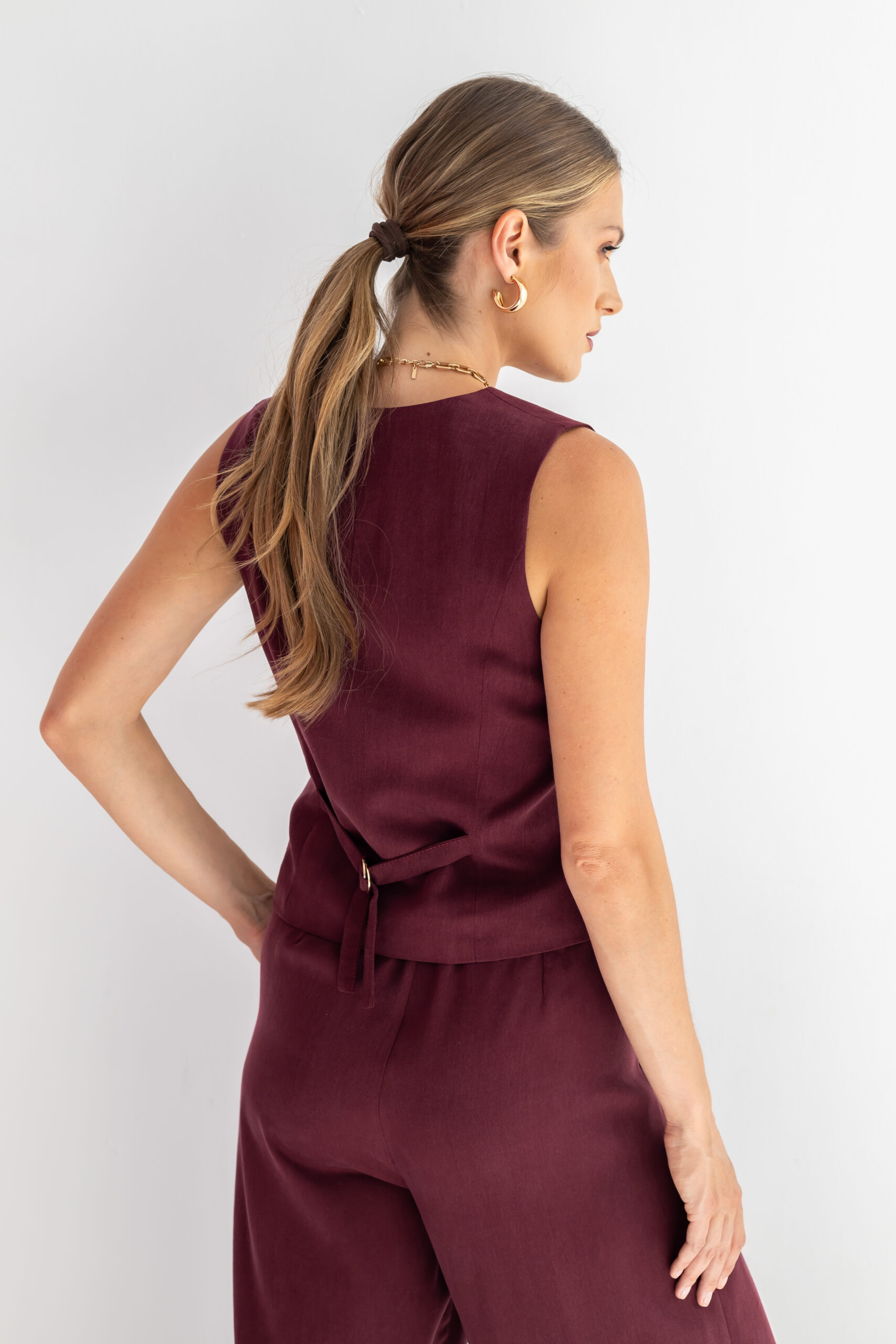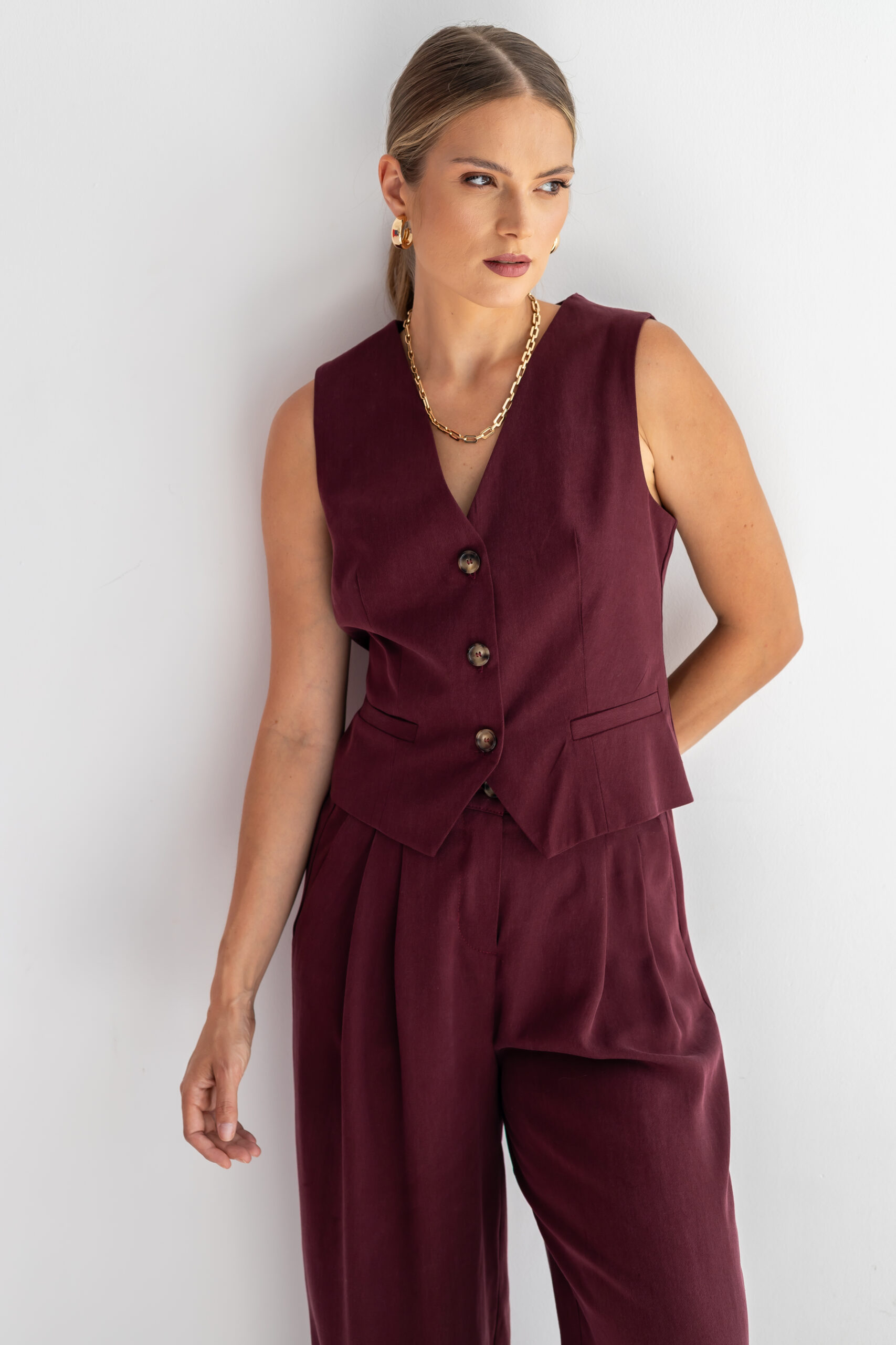 Kamizelka CLARA w kolorze burgundowym to doskonałe połączenie elegancji, funkcjonalności i wygody. Uszyta w 100% z wysokogramaturowego tencelu, jest niezwykle miękka, przewiewna i przyjemna w dotyku, co zapewnia komfort noszenia przez cały dzień.