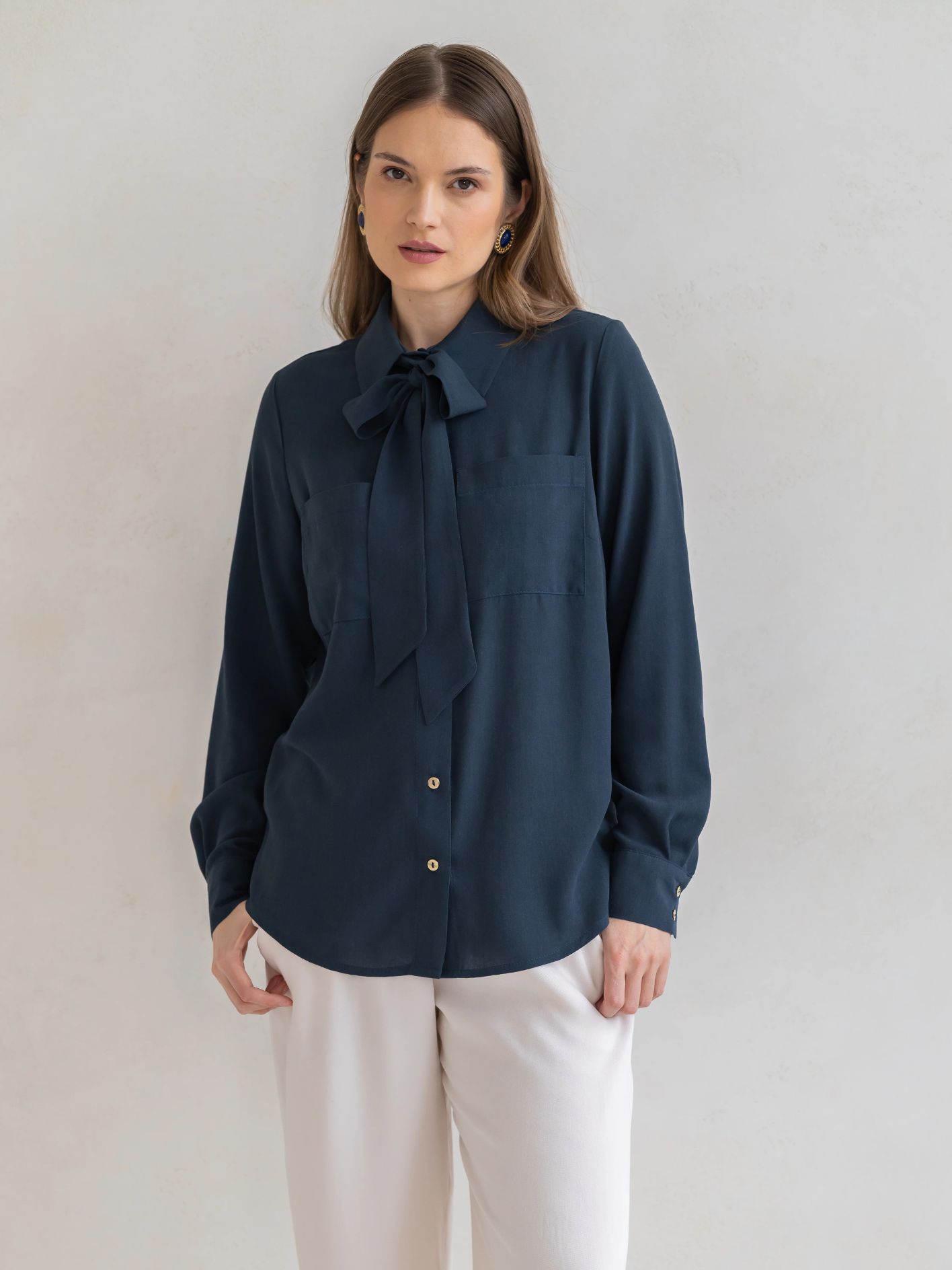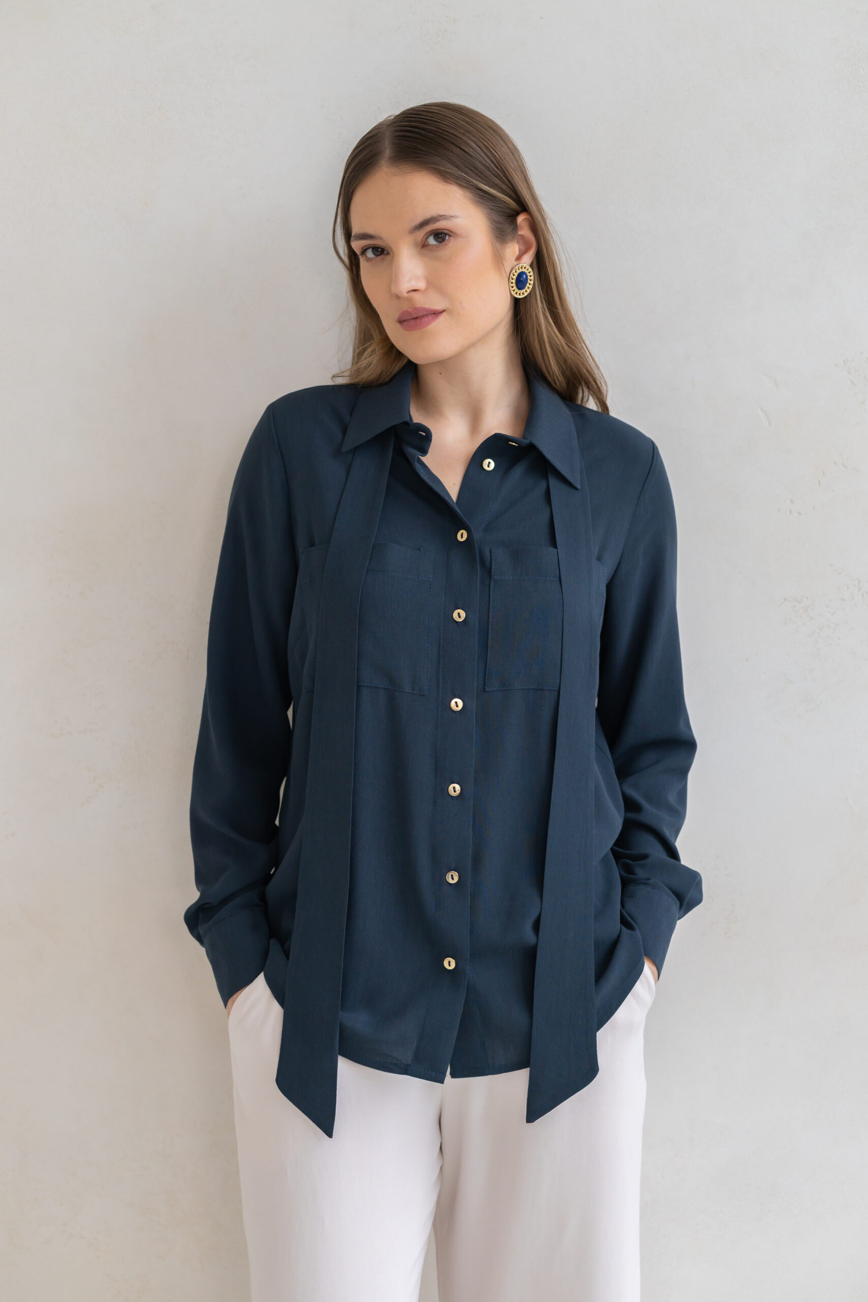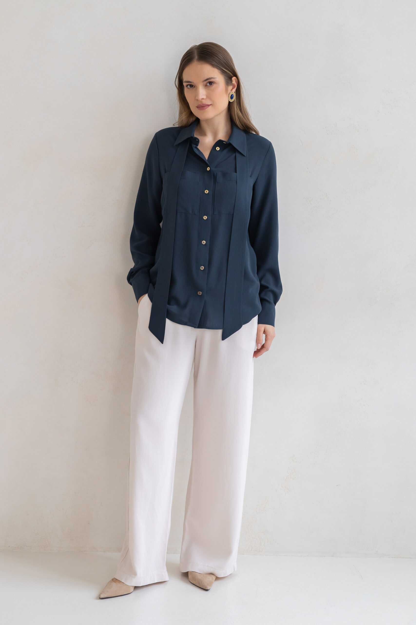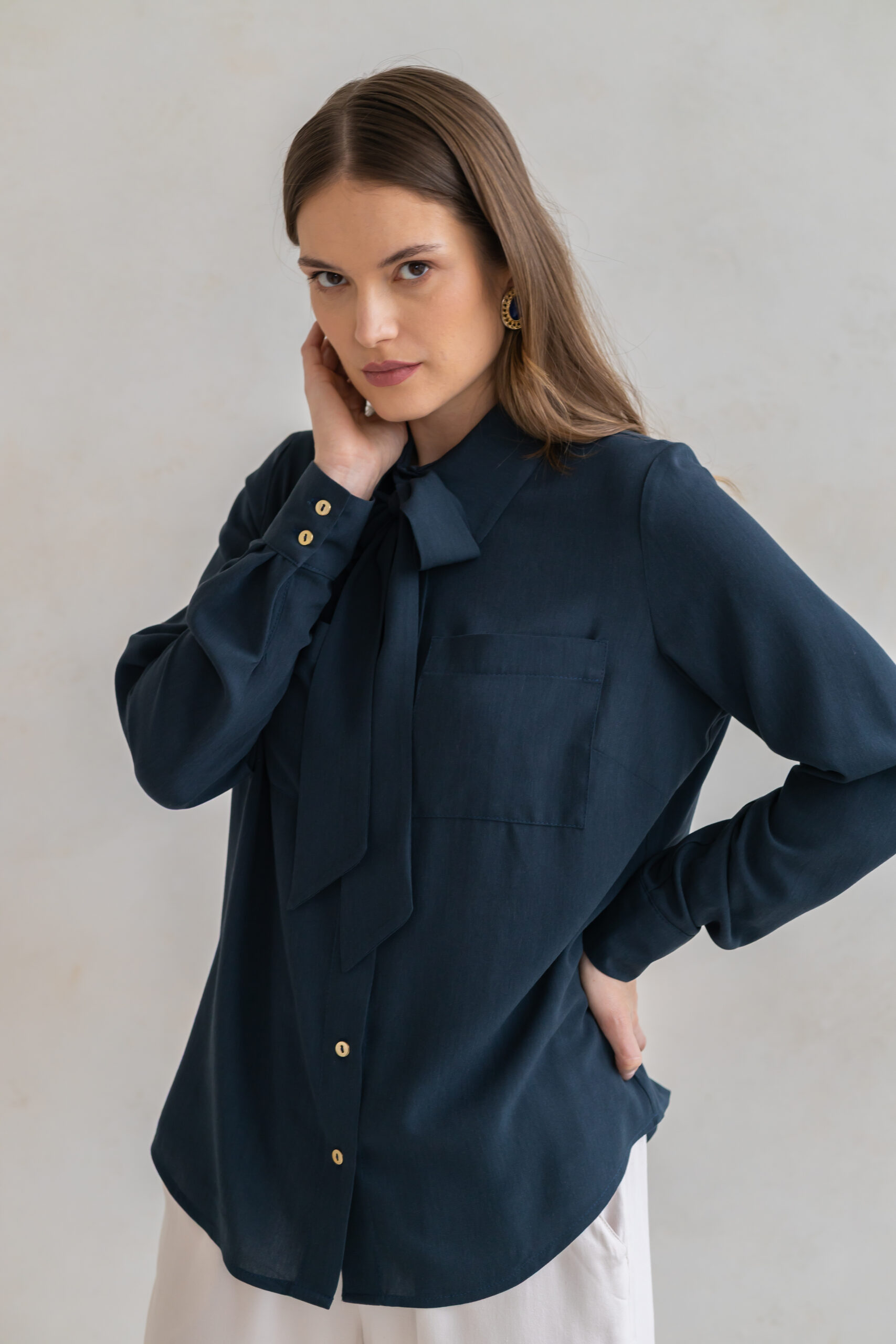 Model został wykończony klasycznymi mankietami oraz subtelnymi, złotymi guzikami, które dodają całości szlachetnego akcentu. Charakterystycznym elementem koszuli jest efektowna szarfa — możesz wiązać ją na wiele sposobów: pod szyją w formie kokardy, nonszalancko puścić luźno lub wykorzystać do podkreślenia talii. To detal, który pozwala tworzyć różnorodne stylizacje i nadaje koszuli modowego sznytu.