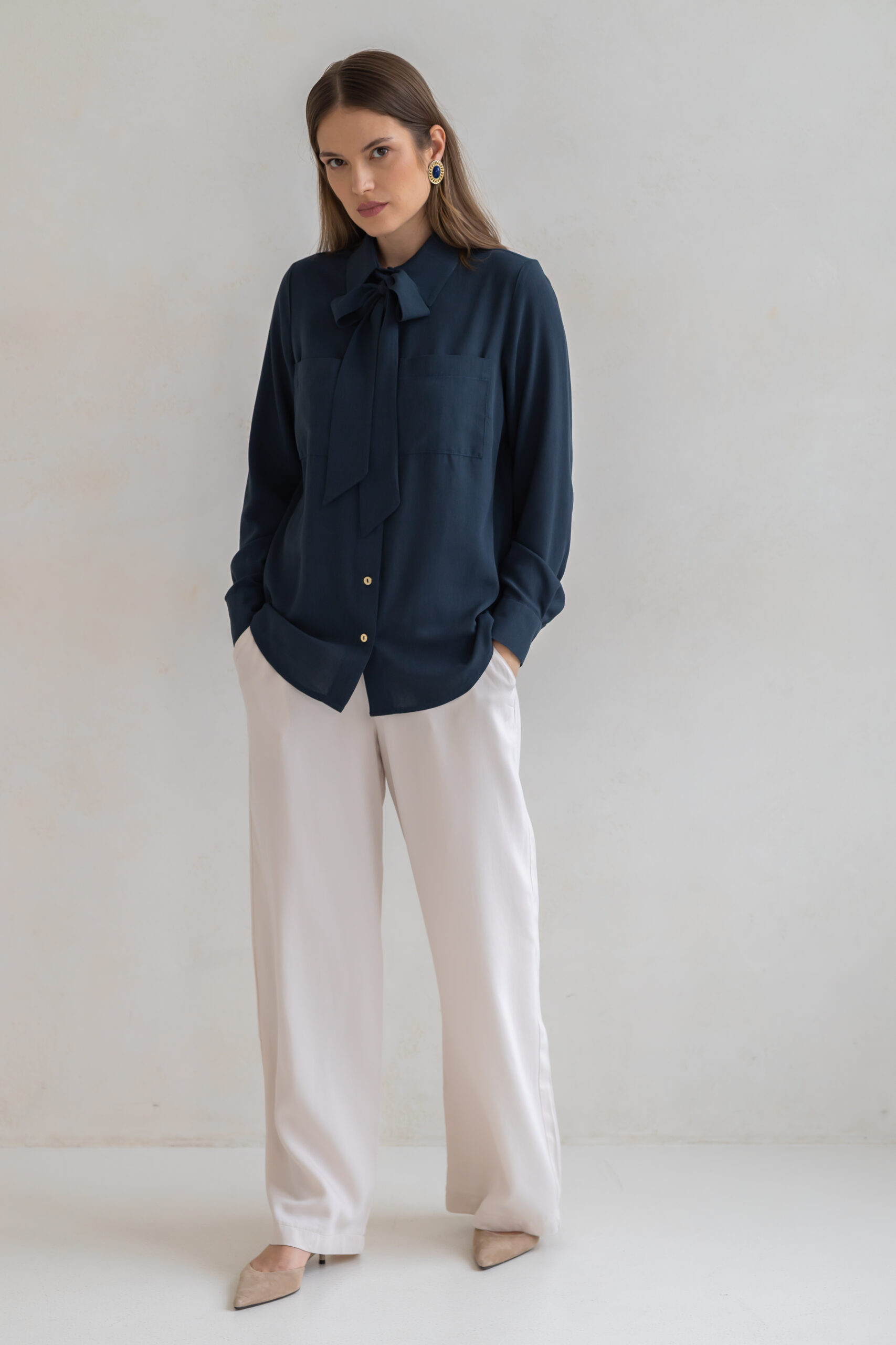 ESME została uszyta z wyjątkowej tkaniny będącej mieszanką 92% wiskozy i 8% wełny. Materiał jest miękki, przyjemny dla skóry i delikatnie otulający, a jednocześnie oddychający. Subtelna transparentność nadaje koszuli lekkości i kobiecego wyrazu.