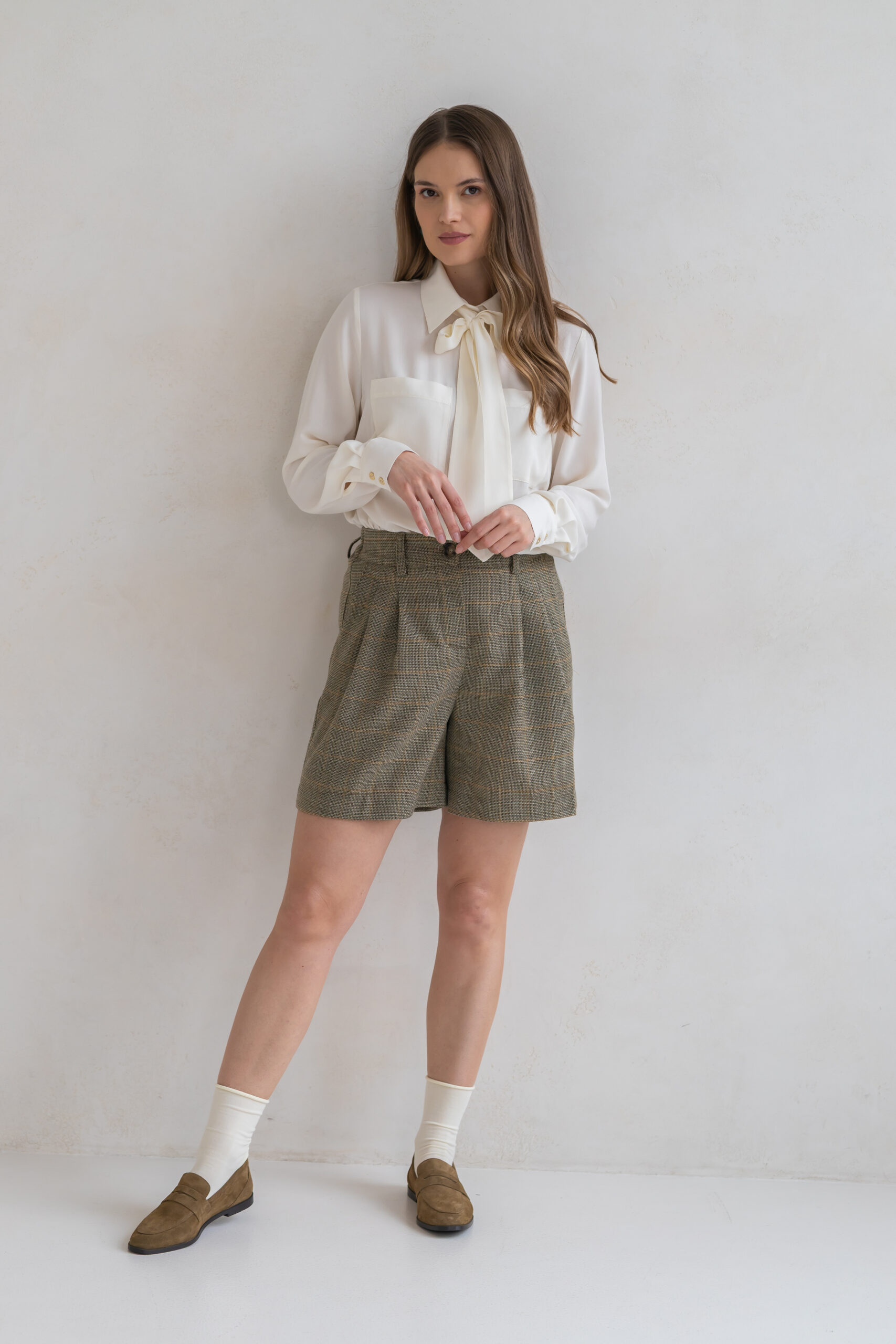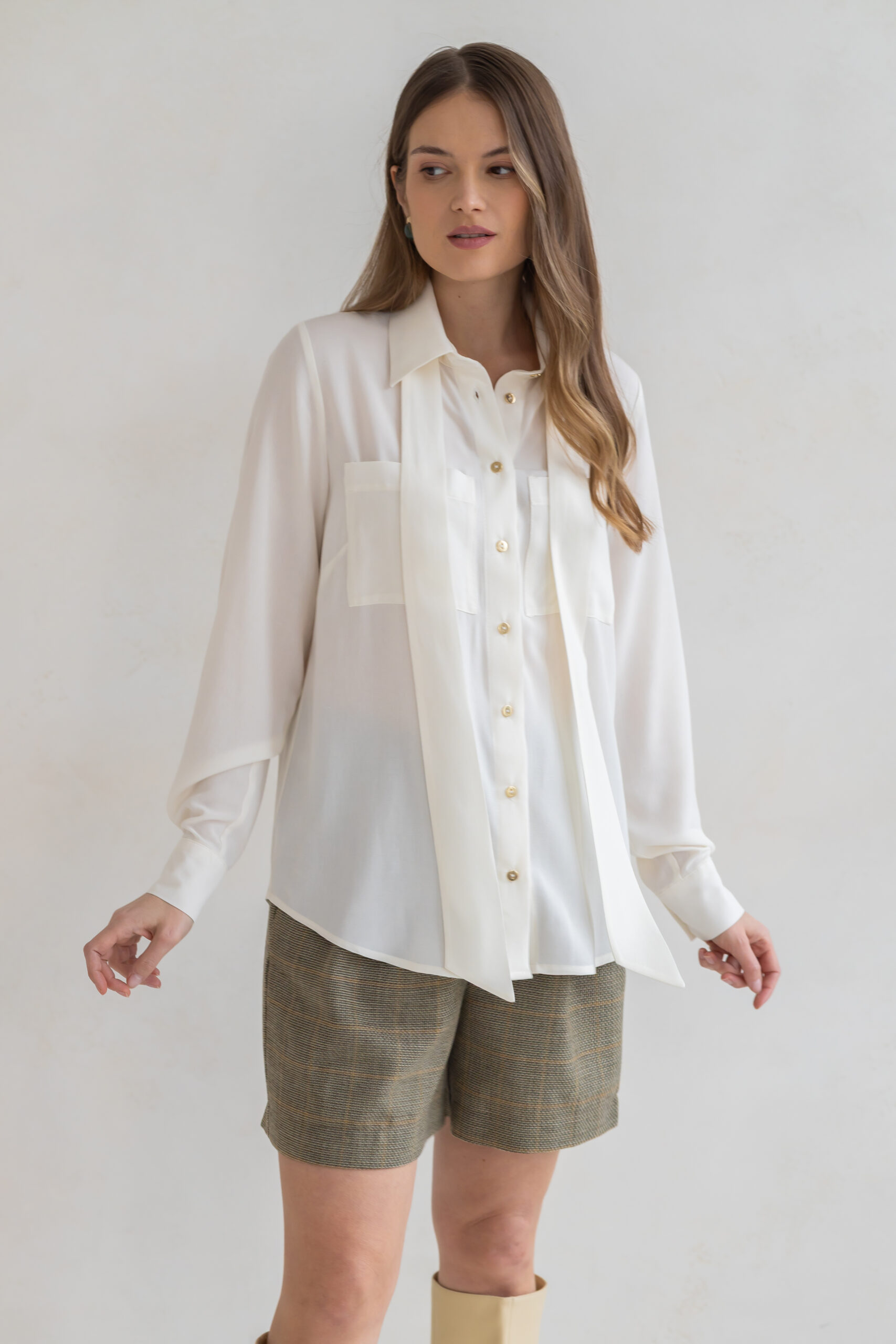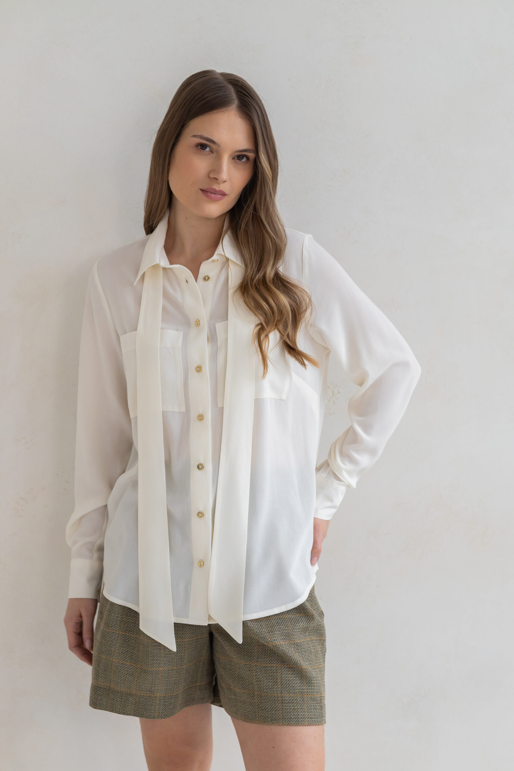 Model został wykończony klasycznymi mankietami oraz subtelnymi, złotymi guzikami, które dodają całości szlachetnego akcentu. Charakterystycznym elementem koszuli jest efektowna szarfa — możesz wiązać ją na wiele sposobów: pod szyją w formie kokardy, nonszalancko puścić luźno lub wykorzystać do podkreślenia talii. To detal, który pozwala tworzyć różnorodne stylizacje i nadaje koszuli modowego sznytu.