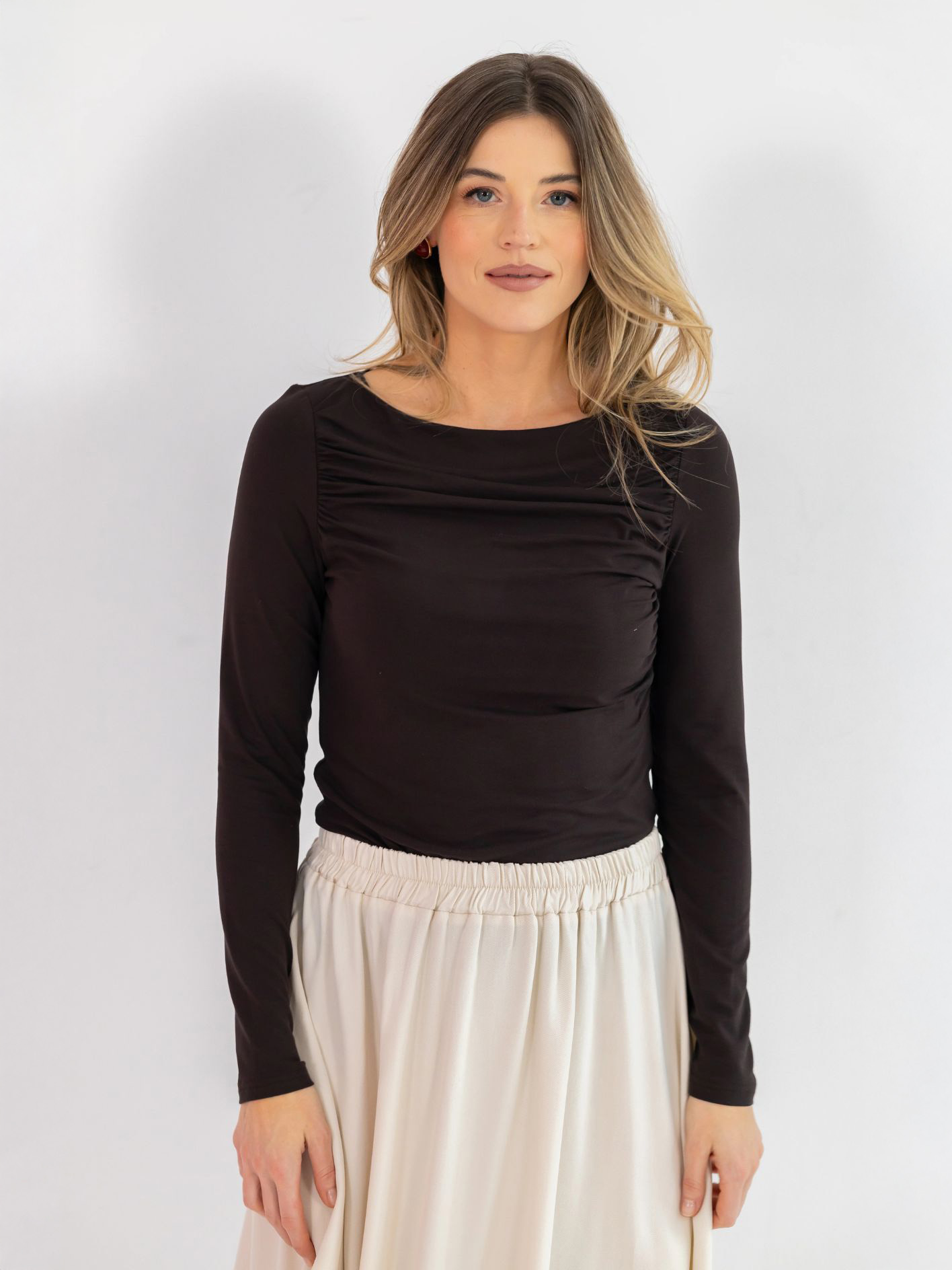 Kolor gorzkiej czekolady nadaje mu elegancji i subtelności, a delikatne marszczenie na dekolcie pięknie podkreśla linię biustu i dodaje całości wyrafinowanego charakteru.