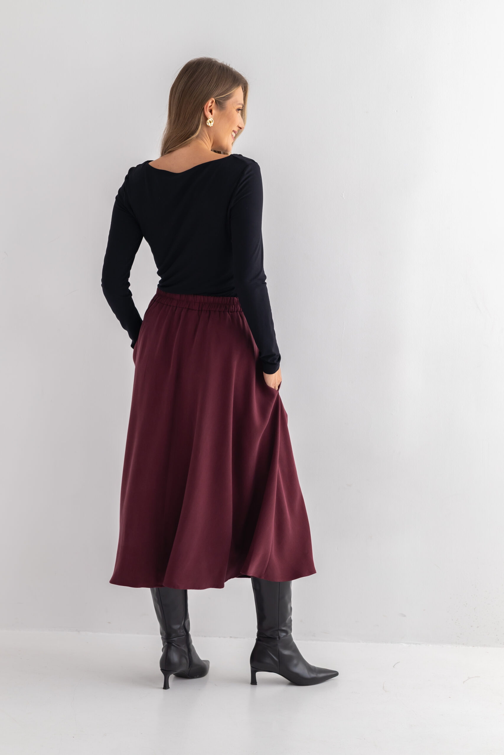 Spódnica CLARA to idealne połączenie klasyki, komfortu i nowoczesnego stylu. Uszyta w 100% z wysokogramaturowego tencelu, jest niezwykle miękka, przewiewna i lekka, co sprawia, że sprawdzi się przez cały rok. Jej minimalistyczny design w modnym czekoladowym kolorze podkreśla naturalny charakter materiału i dodaje jej ponadczasowego uroku.