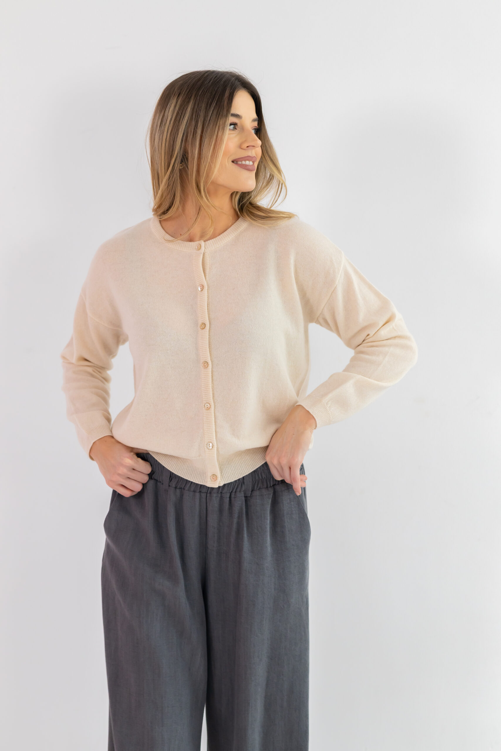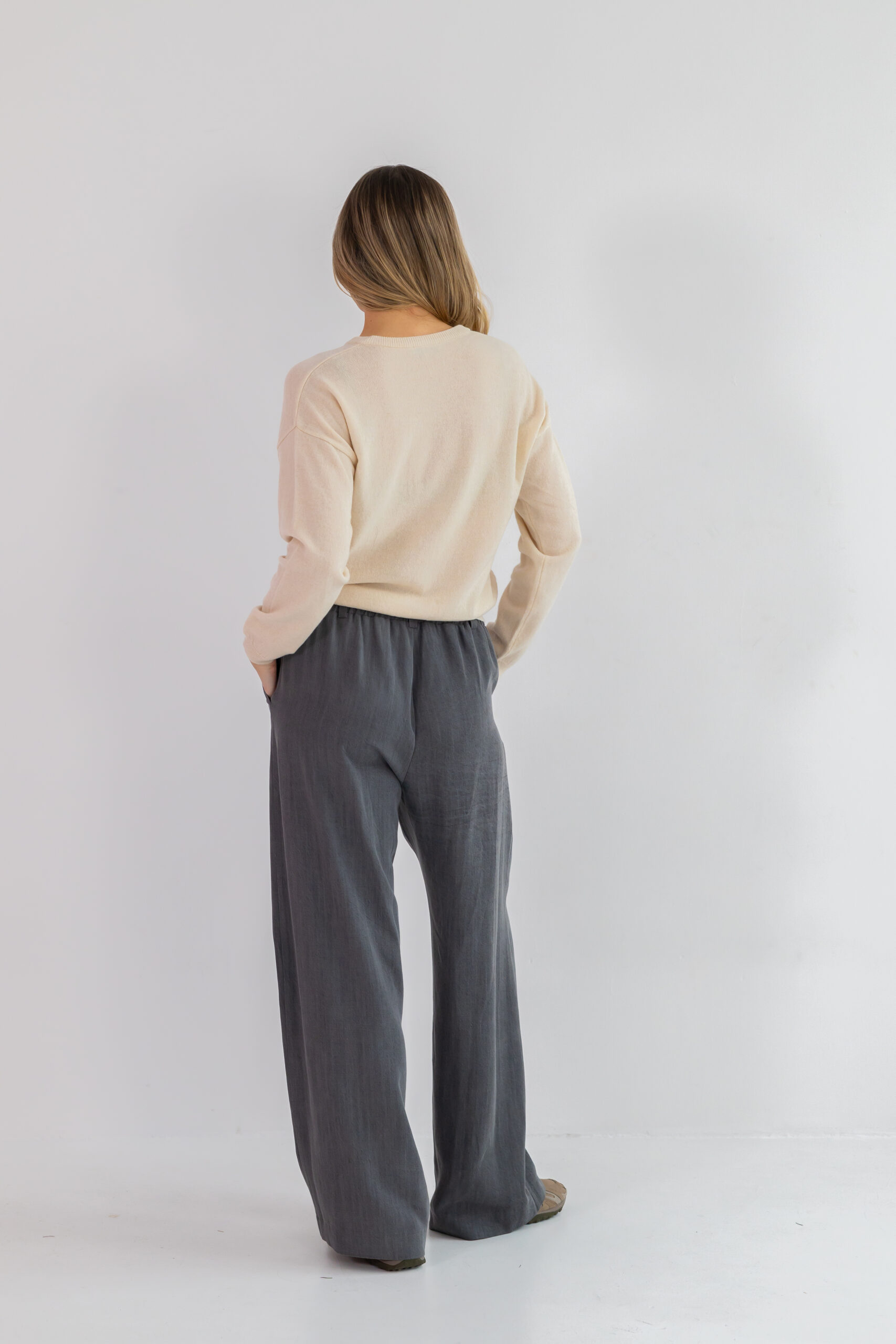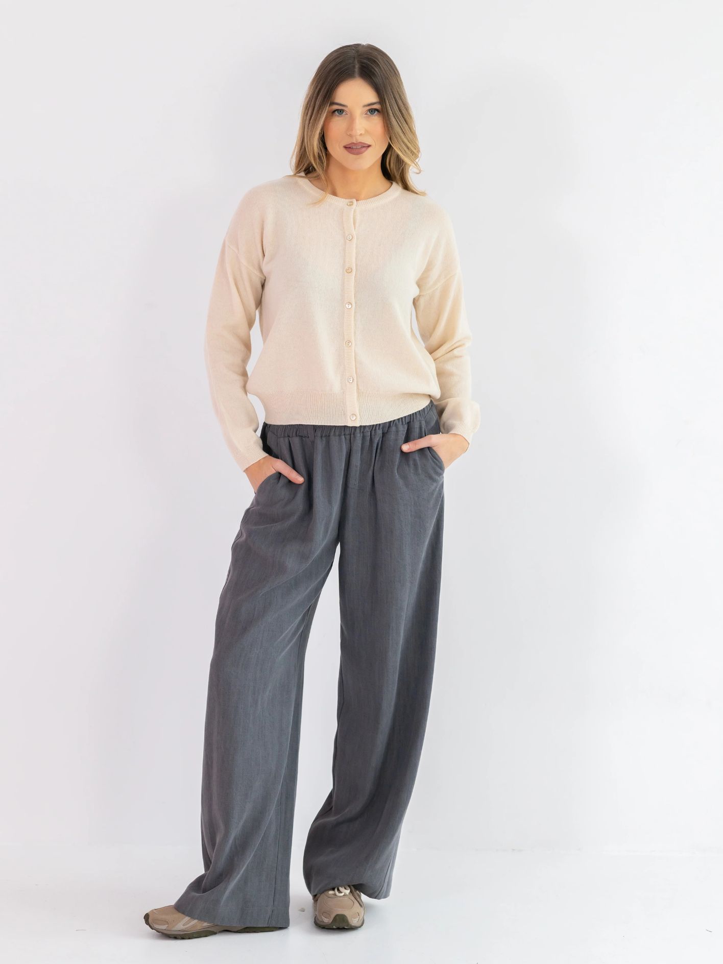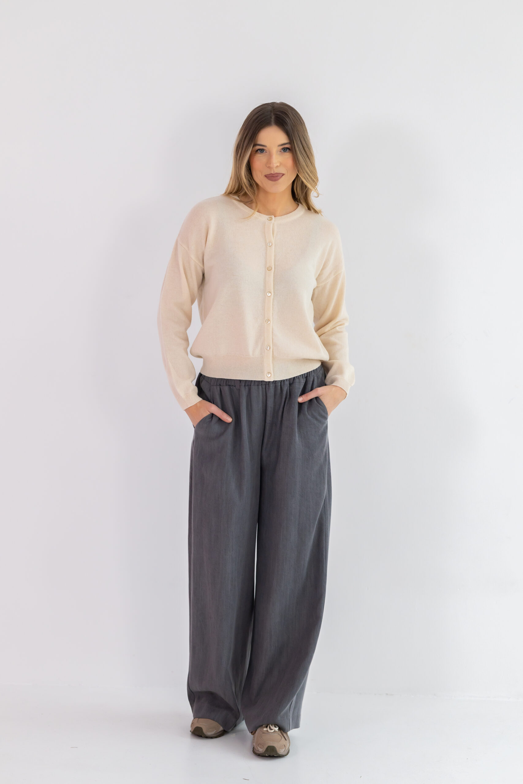 Boczne kieszenie dodają funkcjonalności, a naturalna tkanina zapewnia pełen komfort noszenia niezależnie od pory roku.