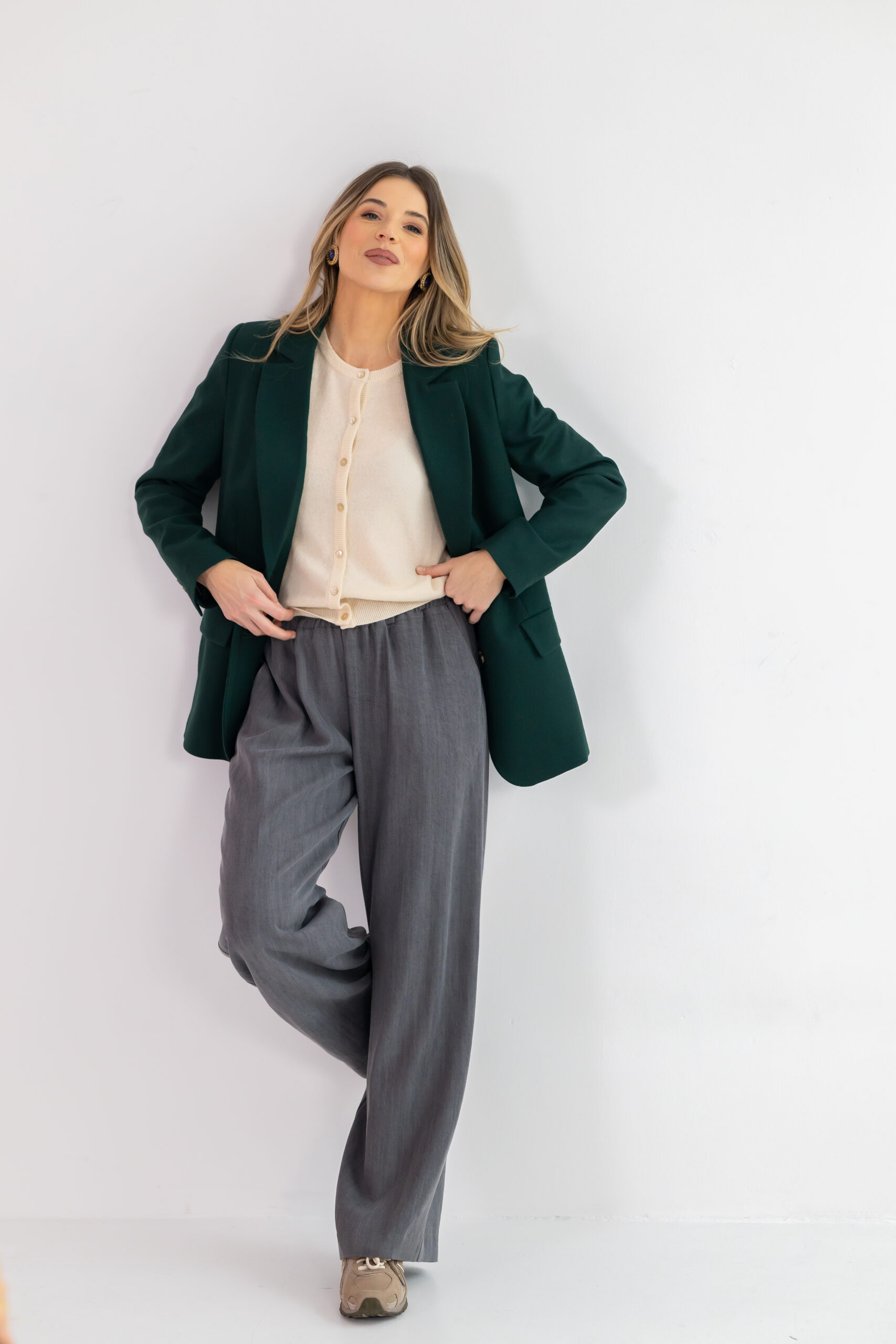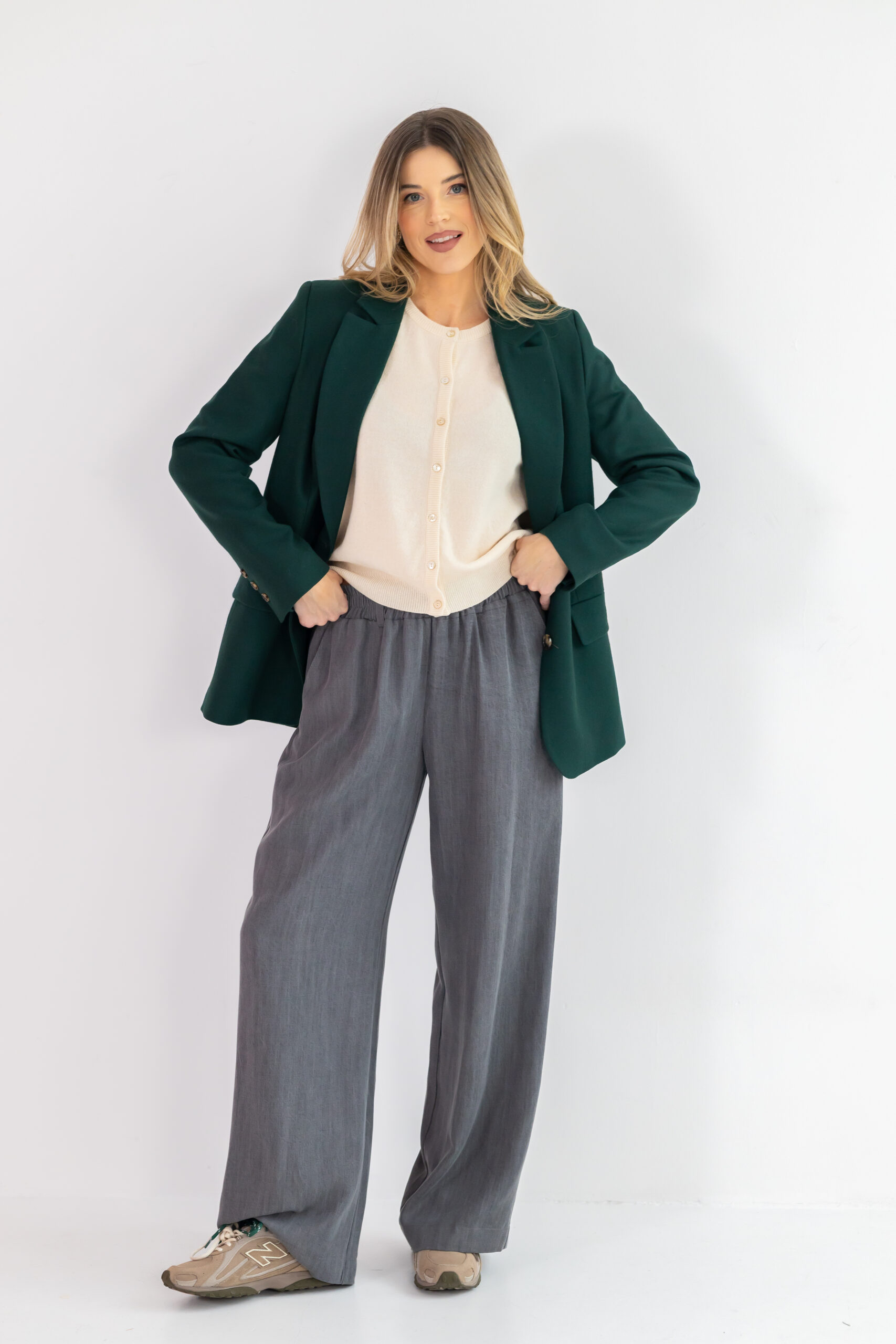Model ma luźną, prostą nogawkę, która optycznie wydłuża nogi i nadaje całej stylizacji lekkości. Elastyczna guma w pasie zapewnia idealne dopasowanie oraz swobodę ruchów, czyniąc spodnie niezastąpionym elementem zarówno w codziennym, jak i bardziej eleganckim wydaniu.