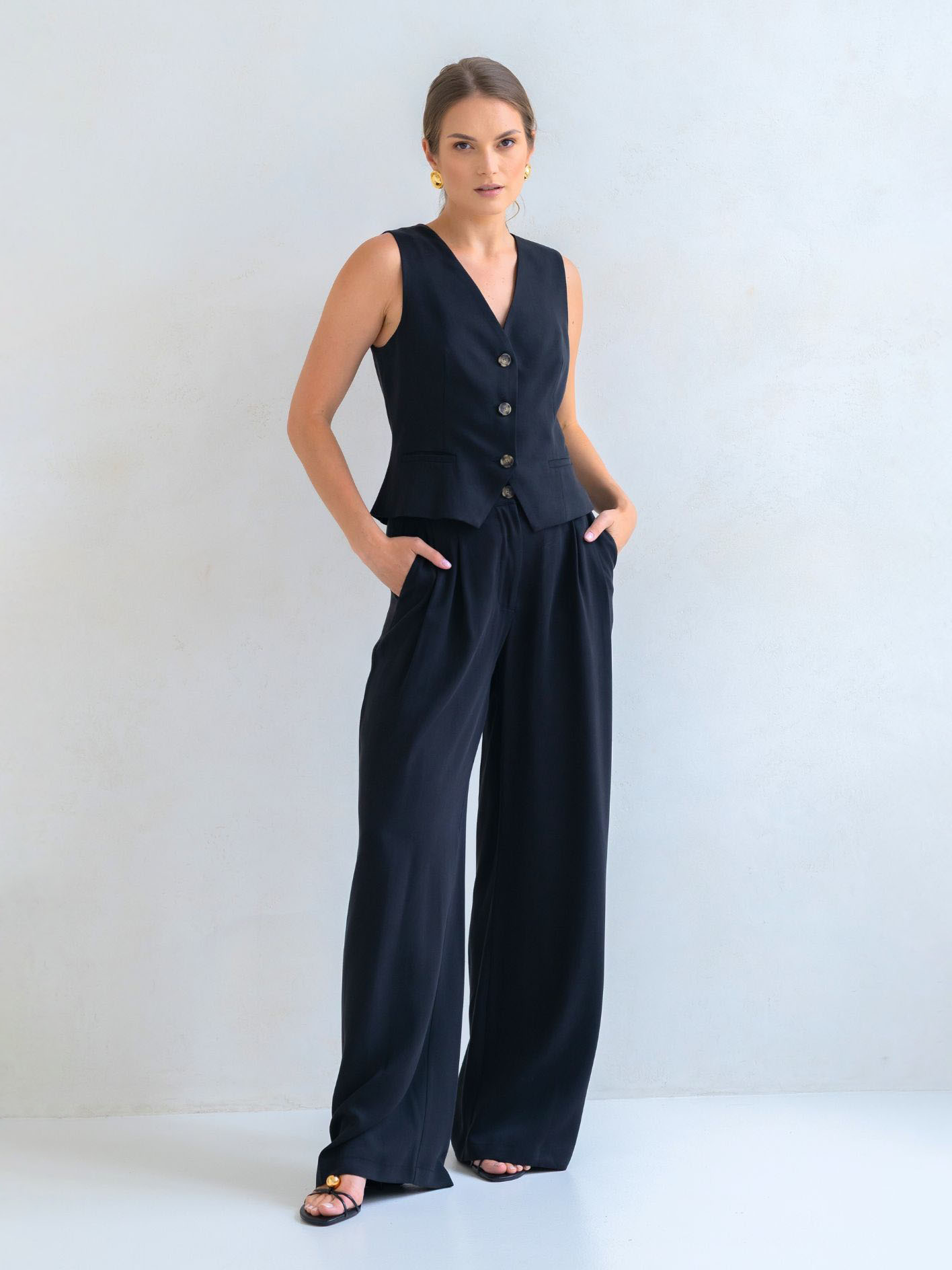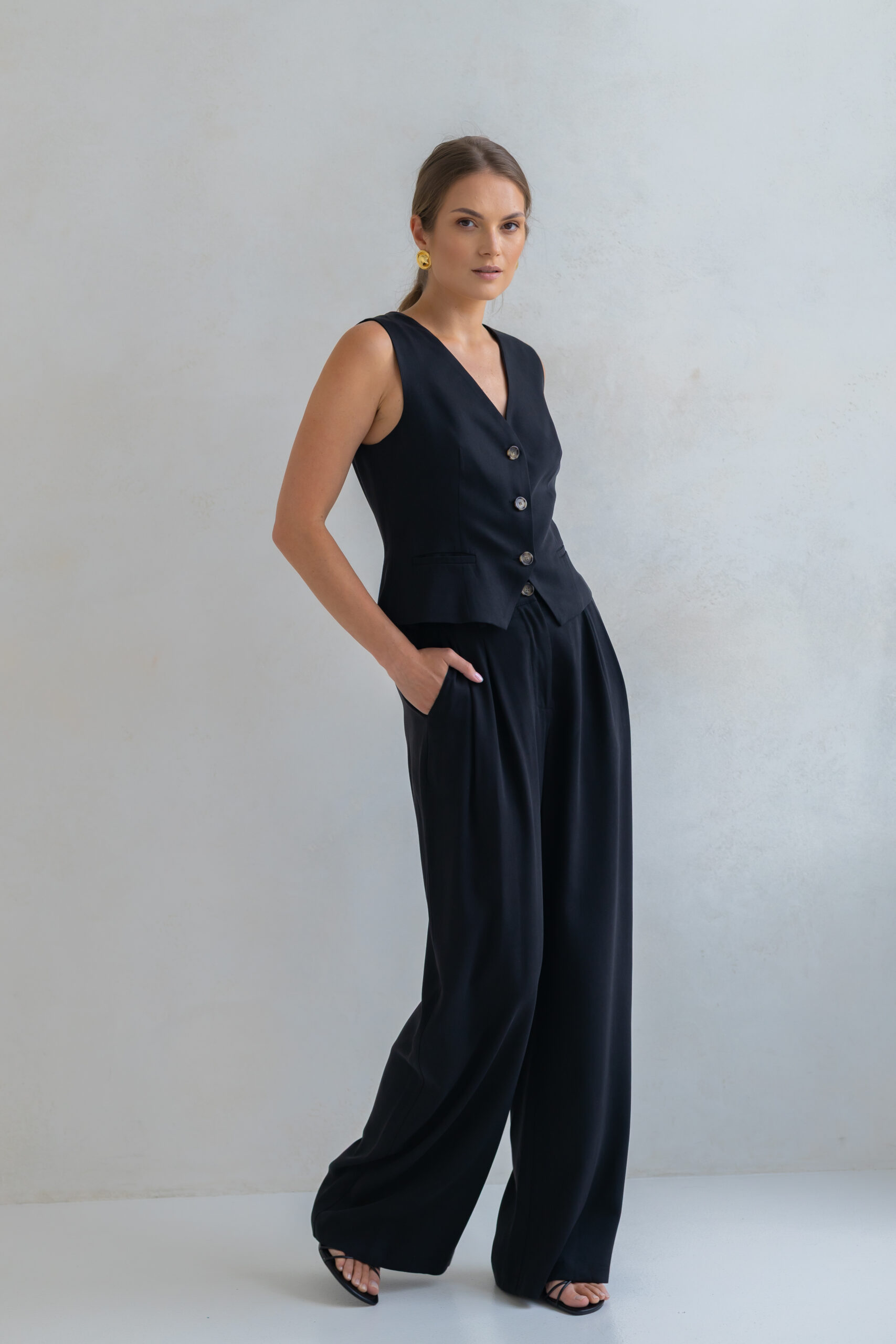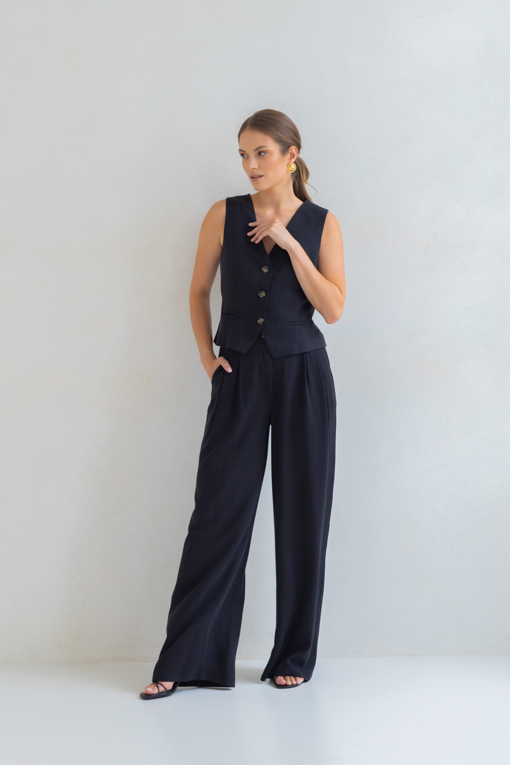 Spodnie połącz z kamizelką CLARA, aby stworzyć nowoczesny, szykowny komplet. Na ramiona możesz zarzucić marynarkę. Świetnie wyglądać będą rownież z elegancką koszulą, bądź z basicowym longsleevem CALLA, jeżeli lubisz casualowe stylizacje.
