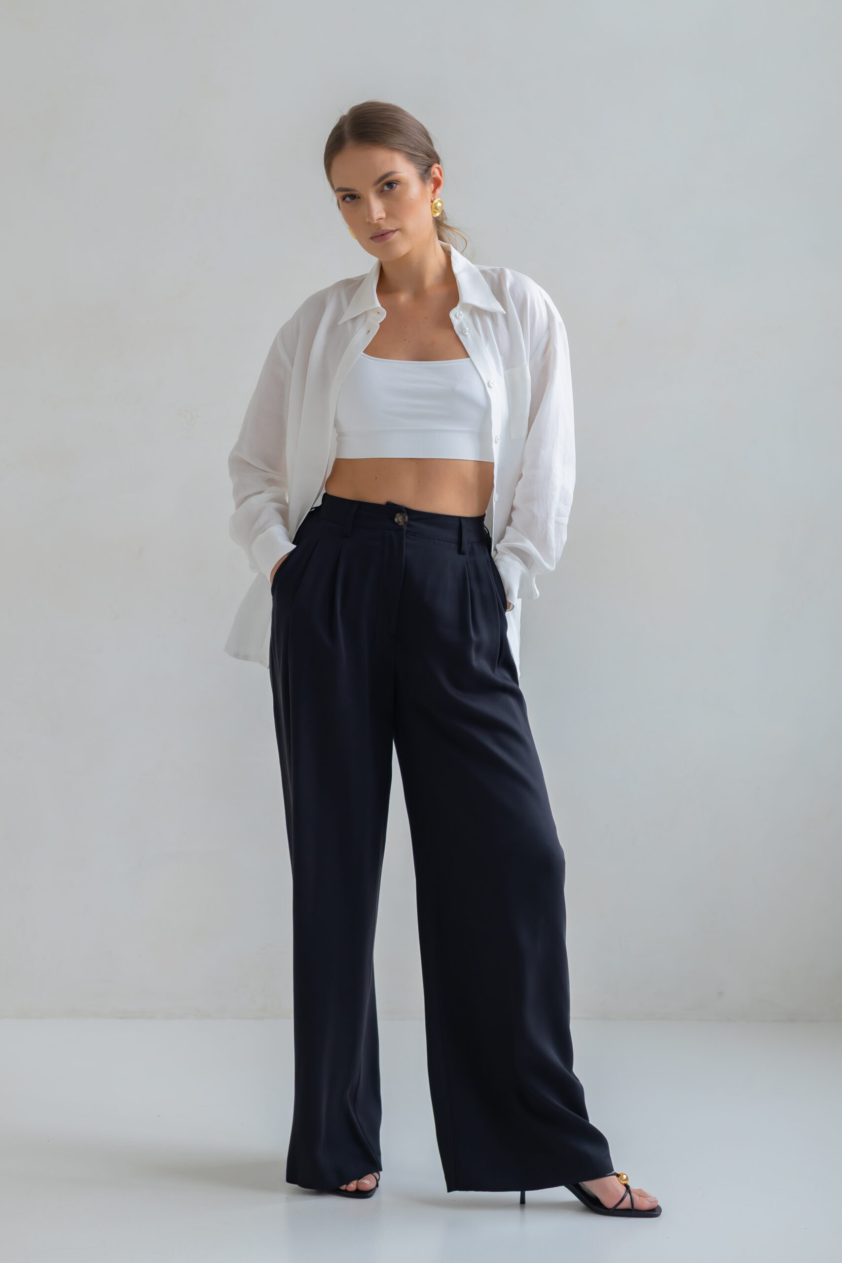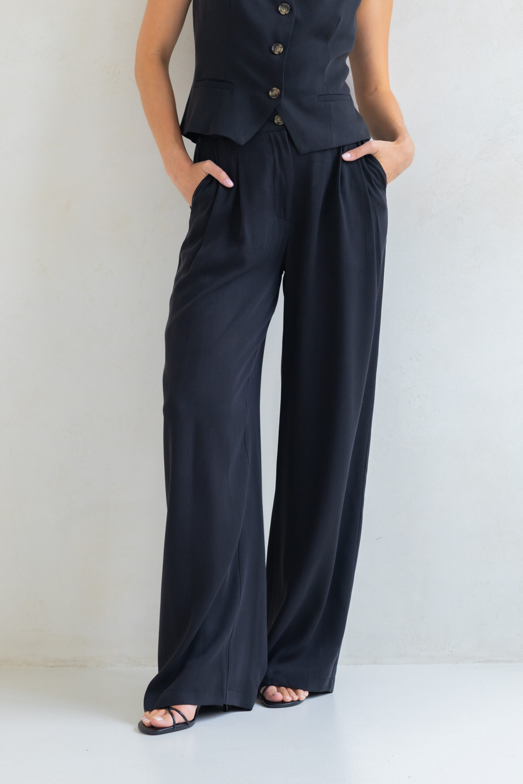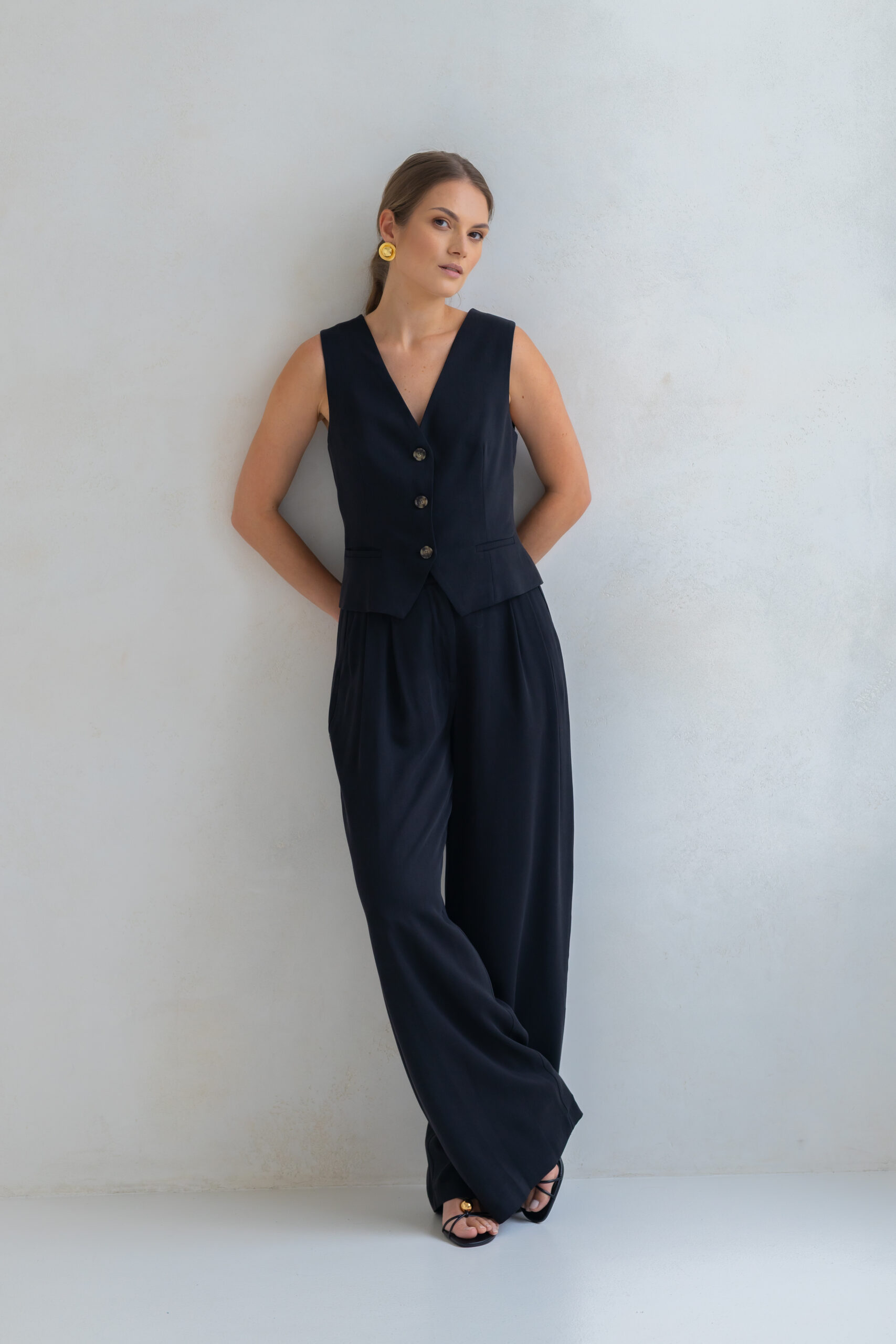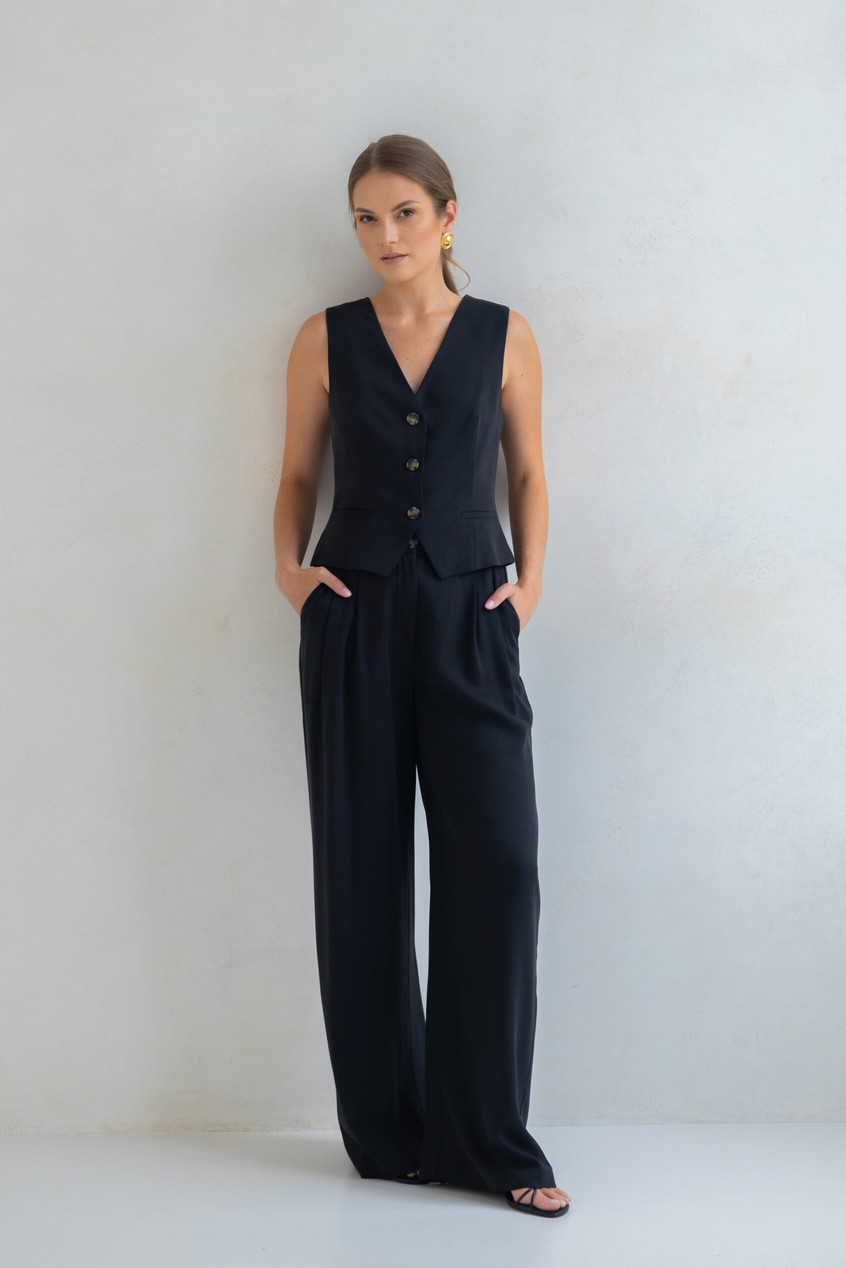 Spodnie połącz z kamizelką CLARA, aby stworzyć nowoczesny, szykowny komplet. Na ramiona możesz zarzucić marynarkę. Świetnie wyglądać będą rownież z elegancką koszulą, bądź z basicowym longsleevem CALLA, jeżeli lubisz casualowe stylizacje.