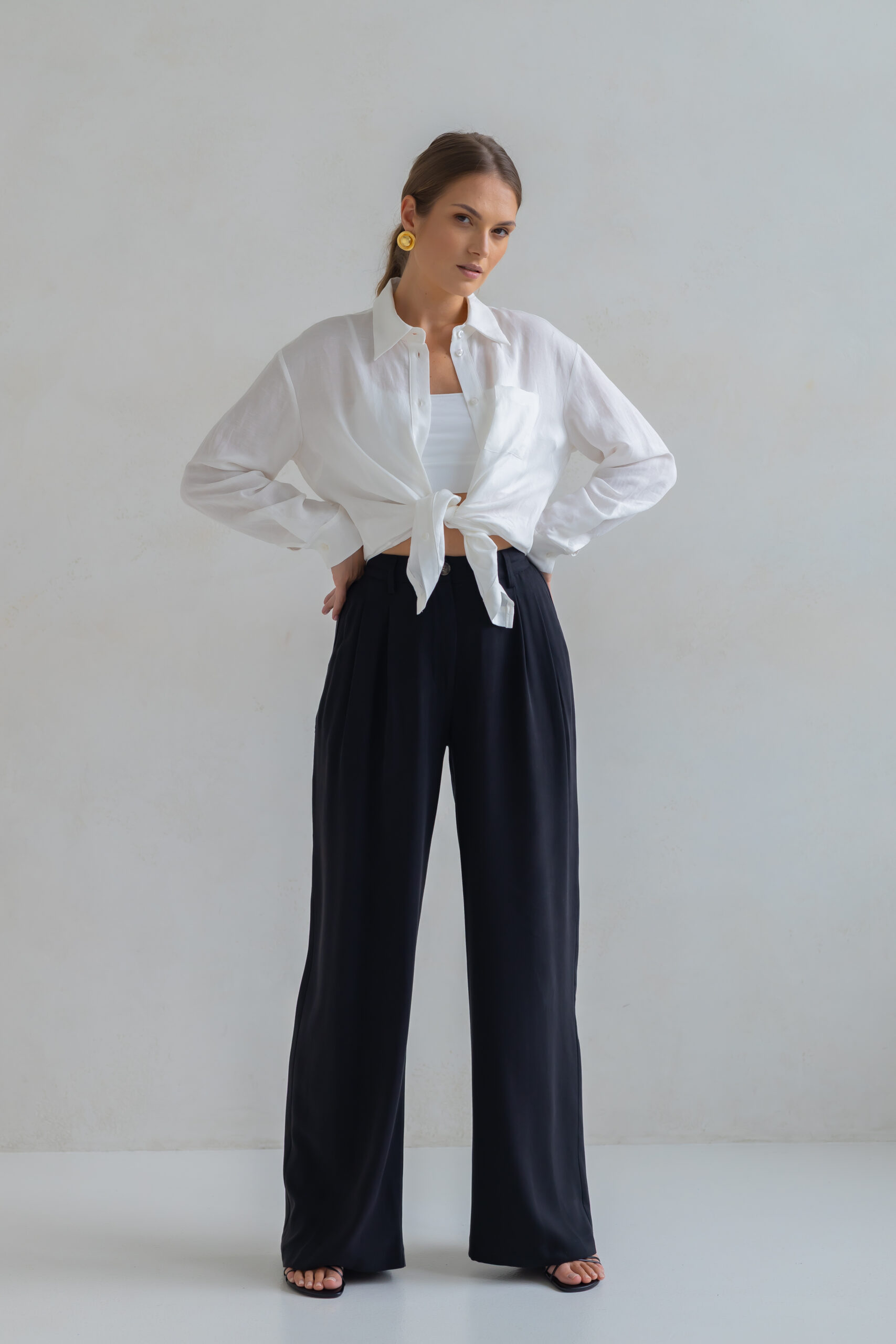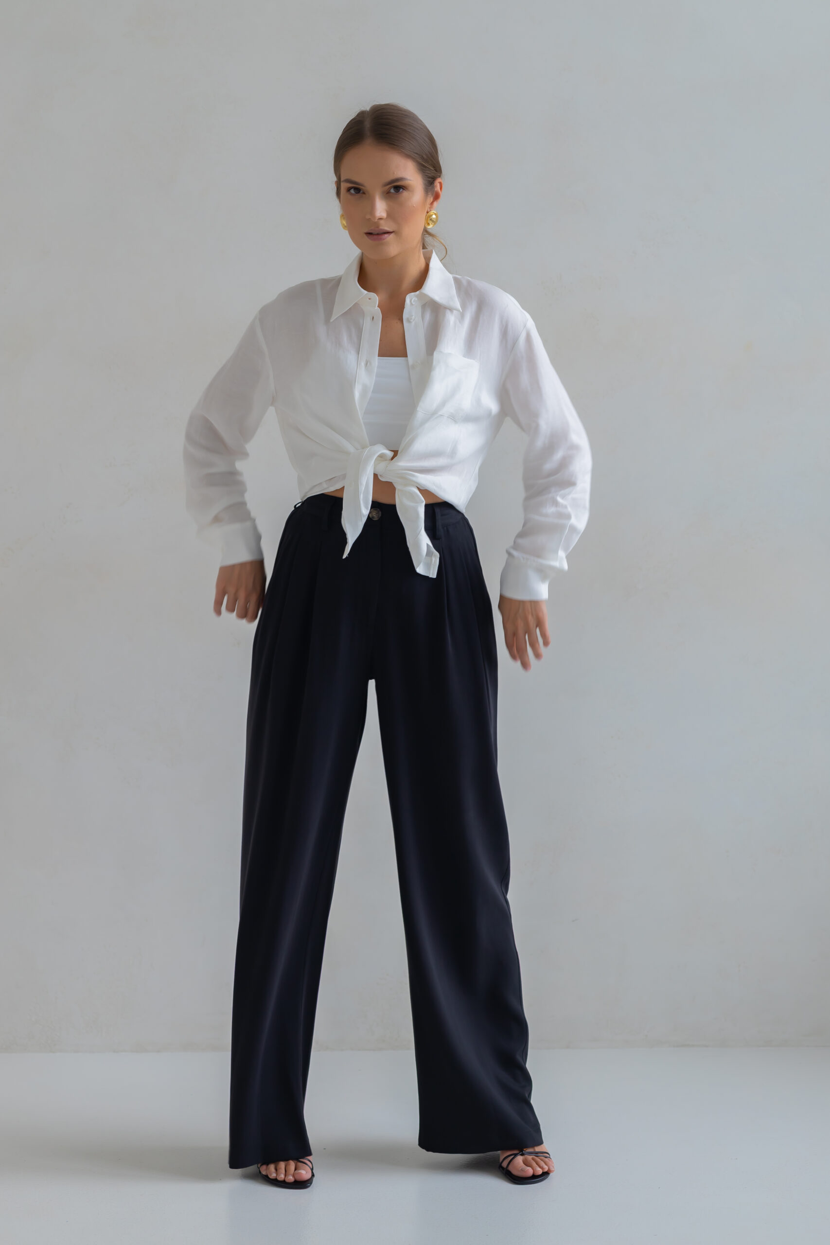 Model CLARA to połączenie wygody, ponadczasowej elegancji i subtelnej nonszalancji. Te spodnie wyróżniają się luźnym, ale dopracowanym krojem, dzięki czemu doskonale sprawdzą się zarówno w codziennych, jak i bardziej formalnych stylizacjach.