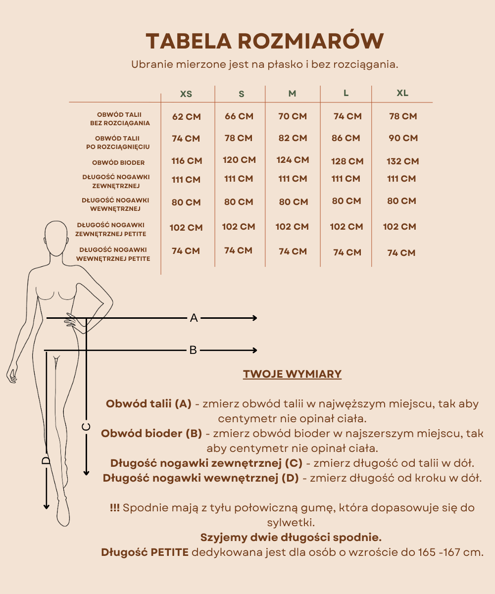 Spodnie szyjemy w dwóch długościach, aby jeszcze lepiej dopasować je do wzrostu i potrzeb. Długość petite zalecana jest osobom o wzroście do 168 cm. Długość regularna jest zalecana osobom od 169 cm i więcej.