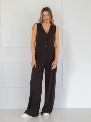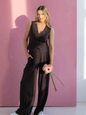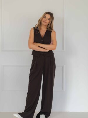 Spodnie połącz z kamizelką CLARA BROWNIE, aby stworzyć nowoczesny, szykowny komplet. Na ramiona możesz zarzucić marynarkę. Świetnie wyglądać będą rownież z elegancką koszulą, bądź z basicowym longsleevem CALLA, jeżeli lubisz casualowe stylizacje.