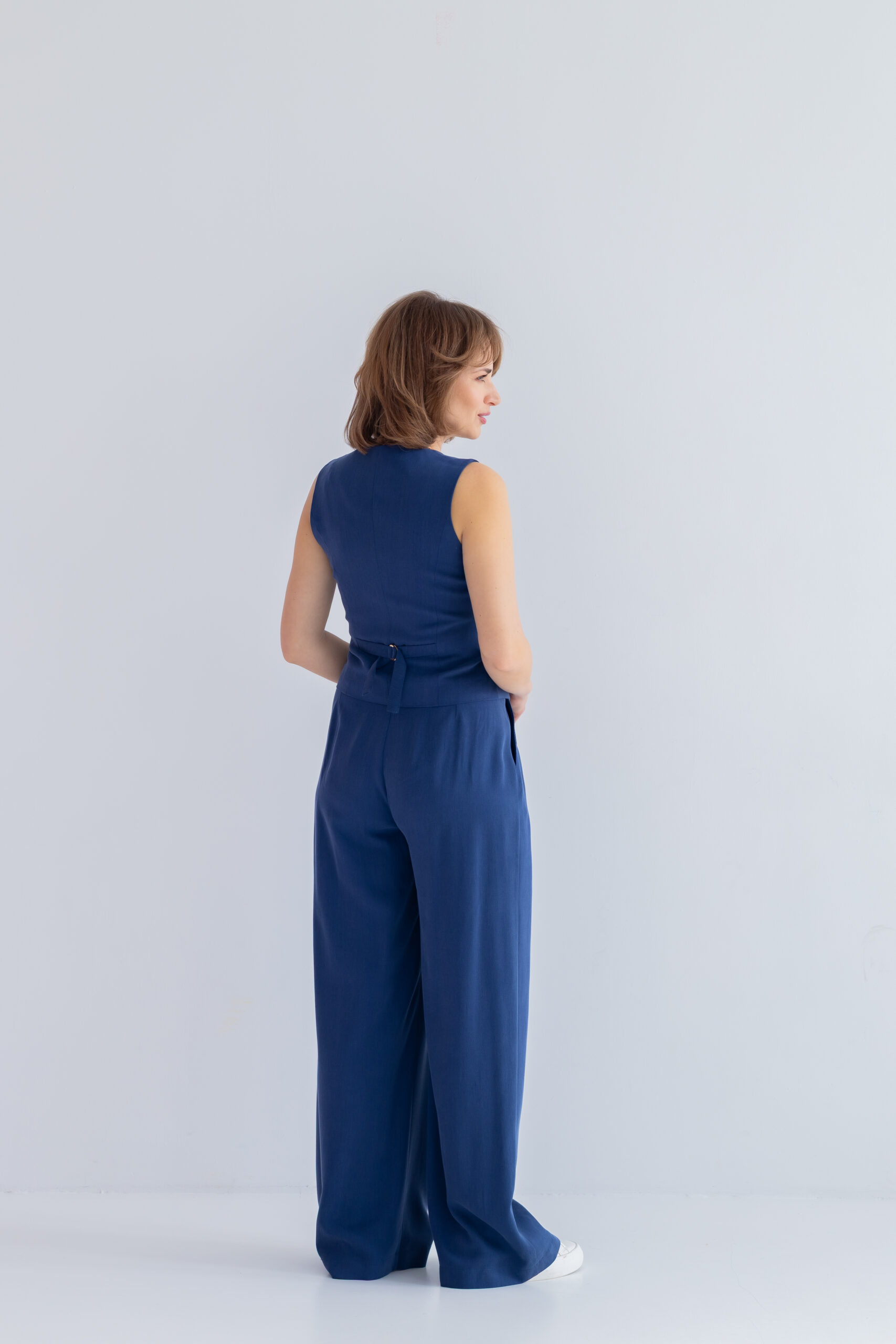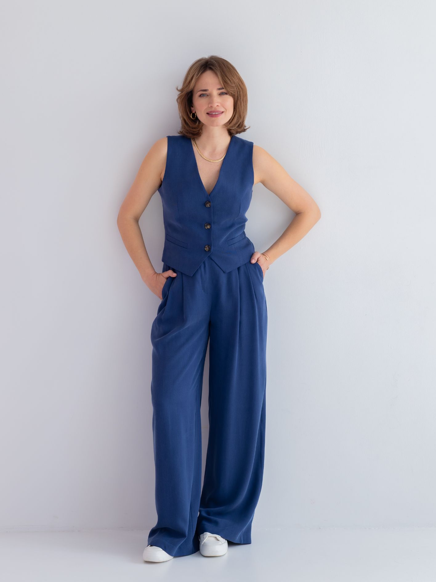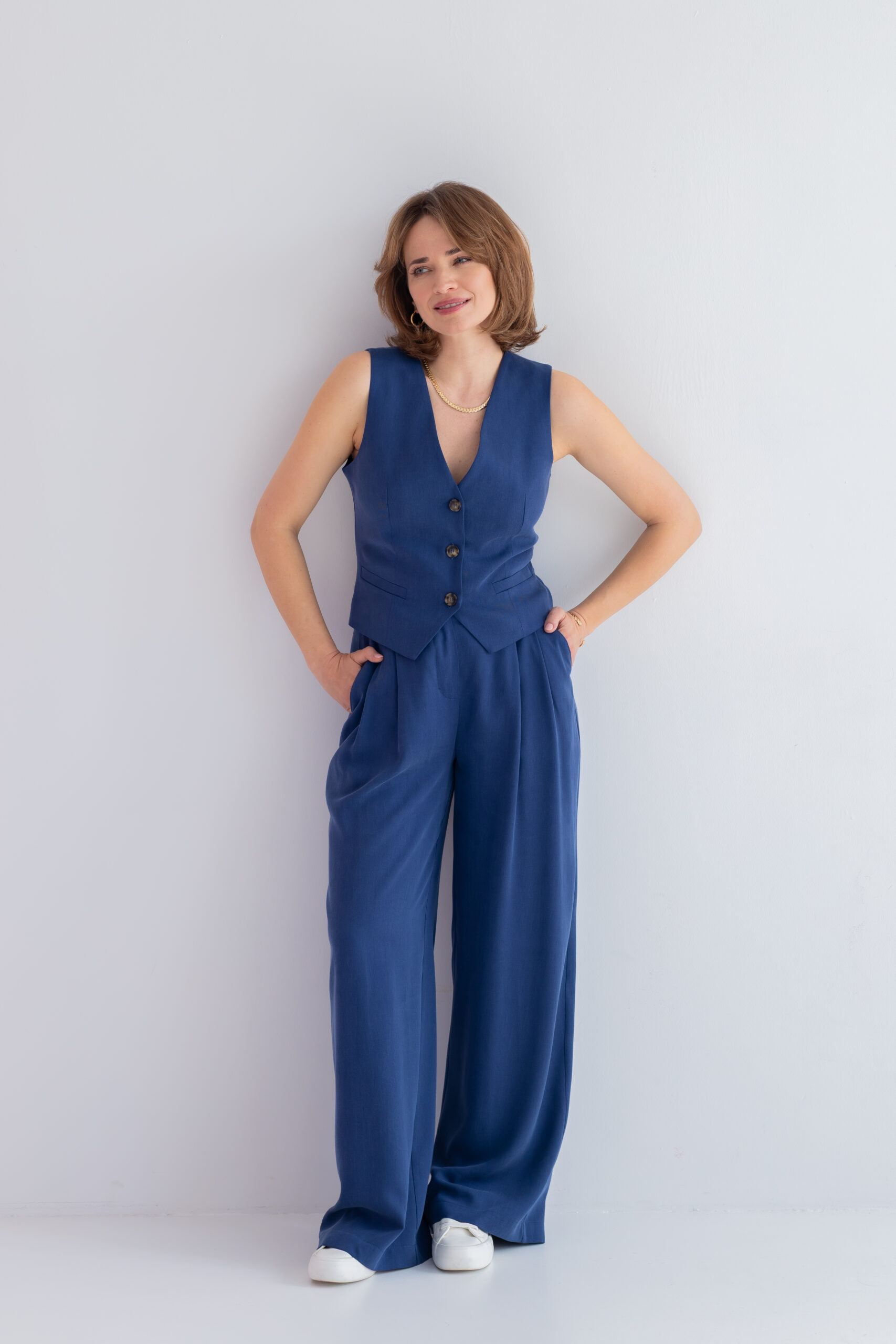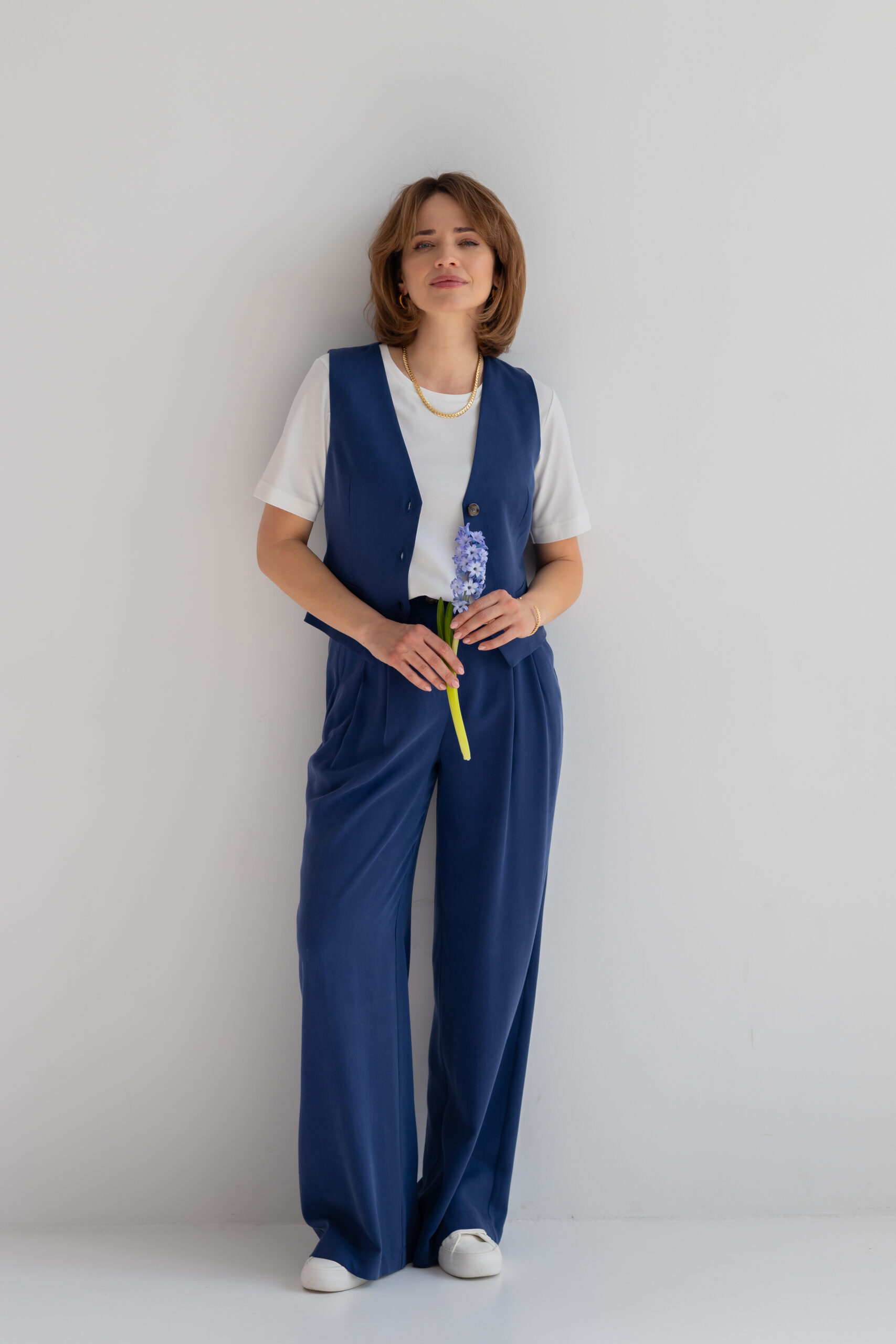 Spodnie połącz z kamizelką CLARA, aby stworzyć nowoczesny, szykowny komplet. Na ramiona możesz zarzucić marynarkę. Świetnie wyglądać będą rownież z elegancką koszulą, bądź z basicowym longsleevem CALLA, jeżeli lubisz casualowe stylizacje.