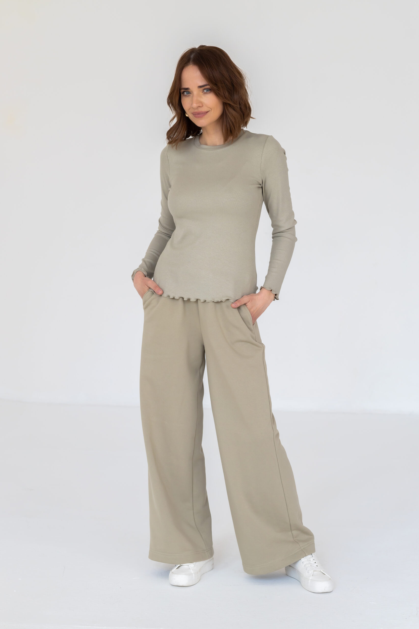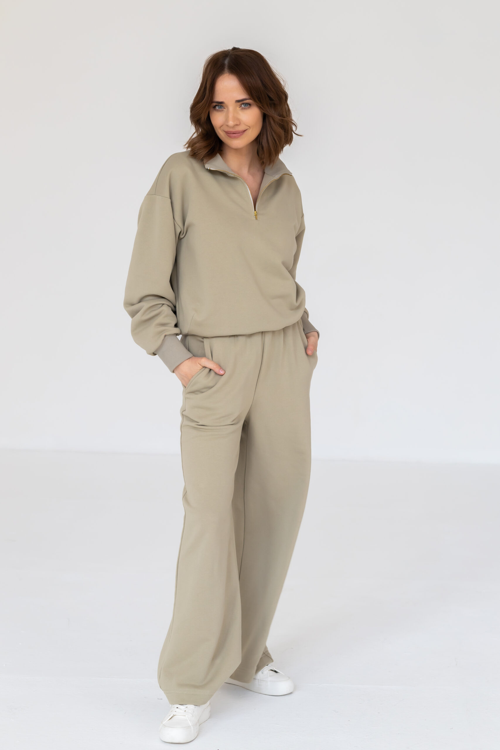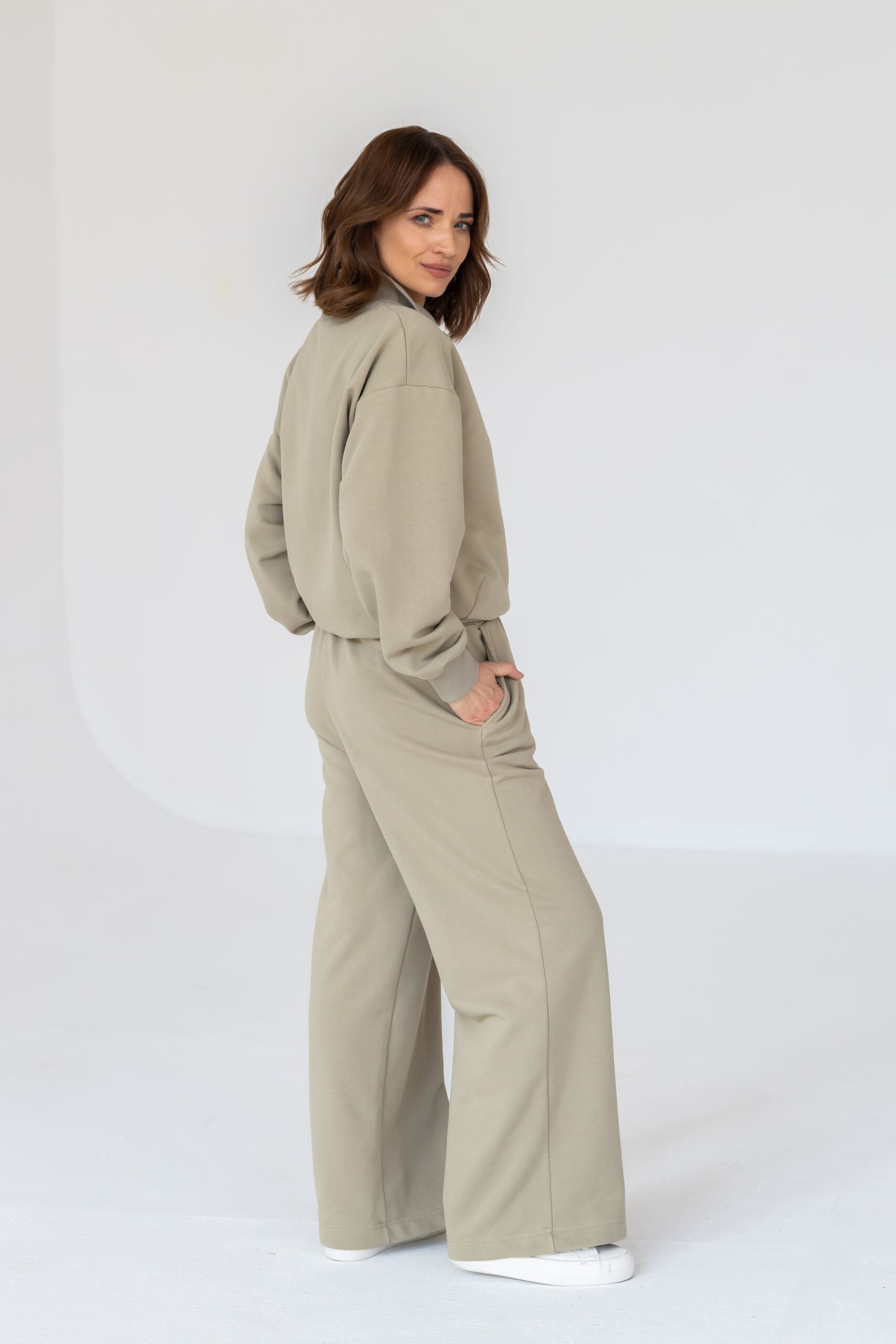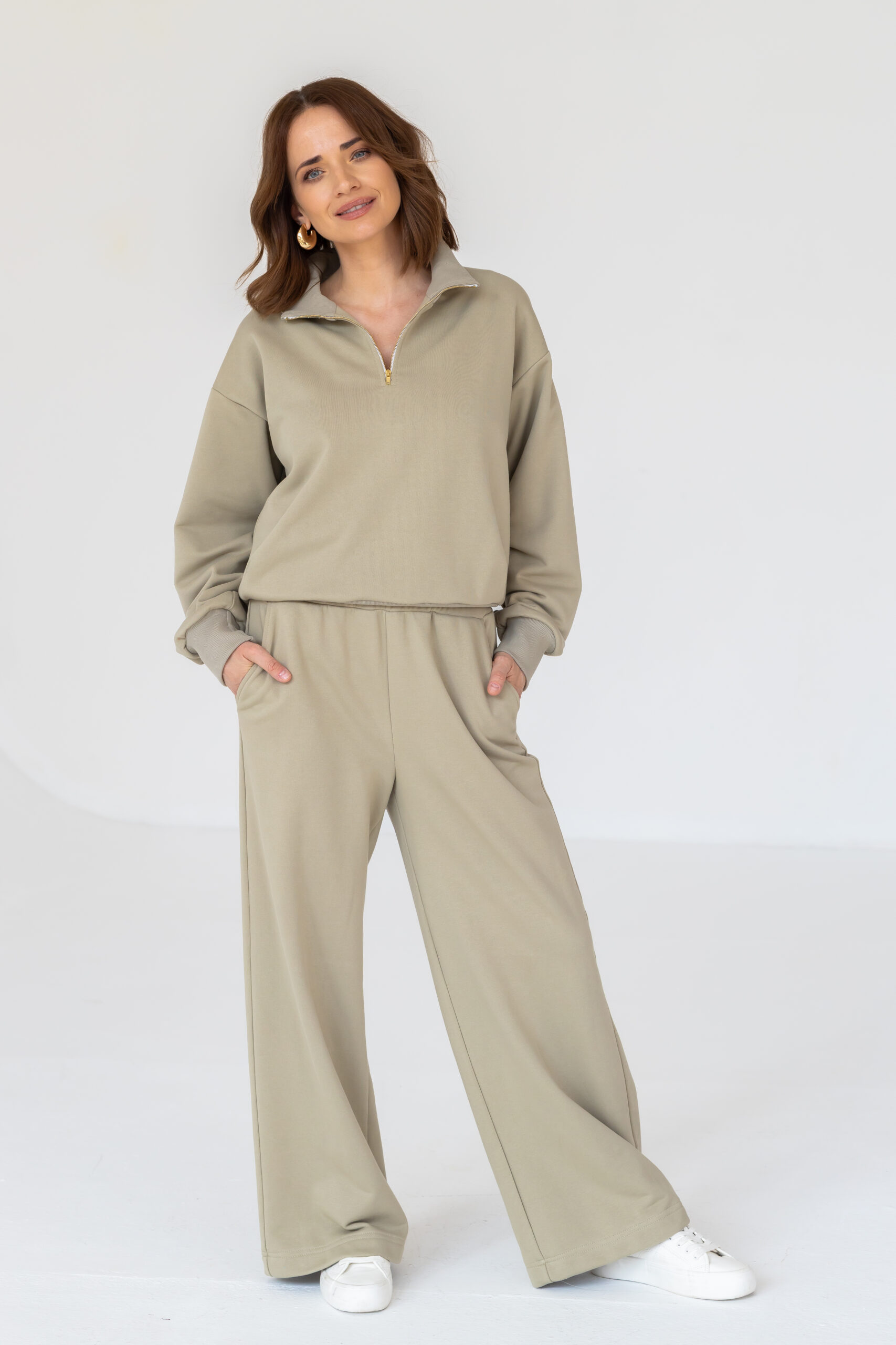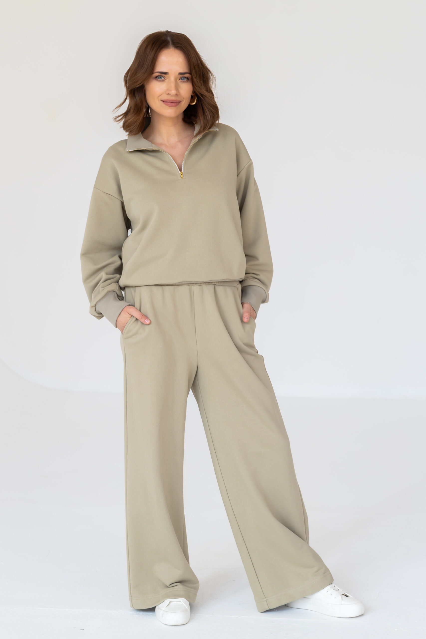 Model posiada elastyczną gumę w pasie, która dopasowuje się do sylwetki, praktyczne kieszenie oraz szeroką nogawkę nadającą całości nowoczesnego, luźnego charakteru. Ciepły, pistacjowy kolor doskonale wpisuje się w aktualne trendy i świetnie komponuje się zarówno z basicowymi, jak i bardziej wyrazistymi elementami garderoby.