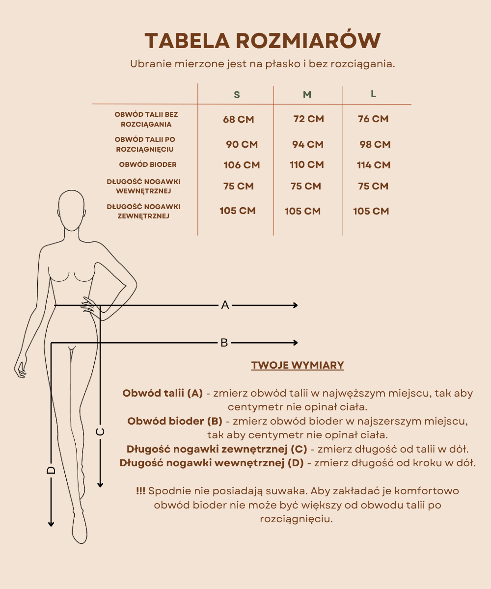 Fason: szeroka nogawka, podkreślająca nowoczesny i elegancki styl