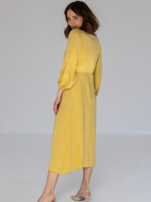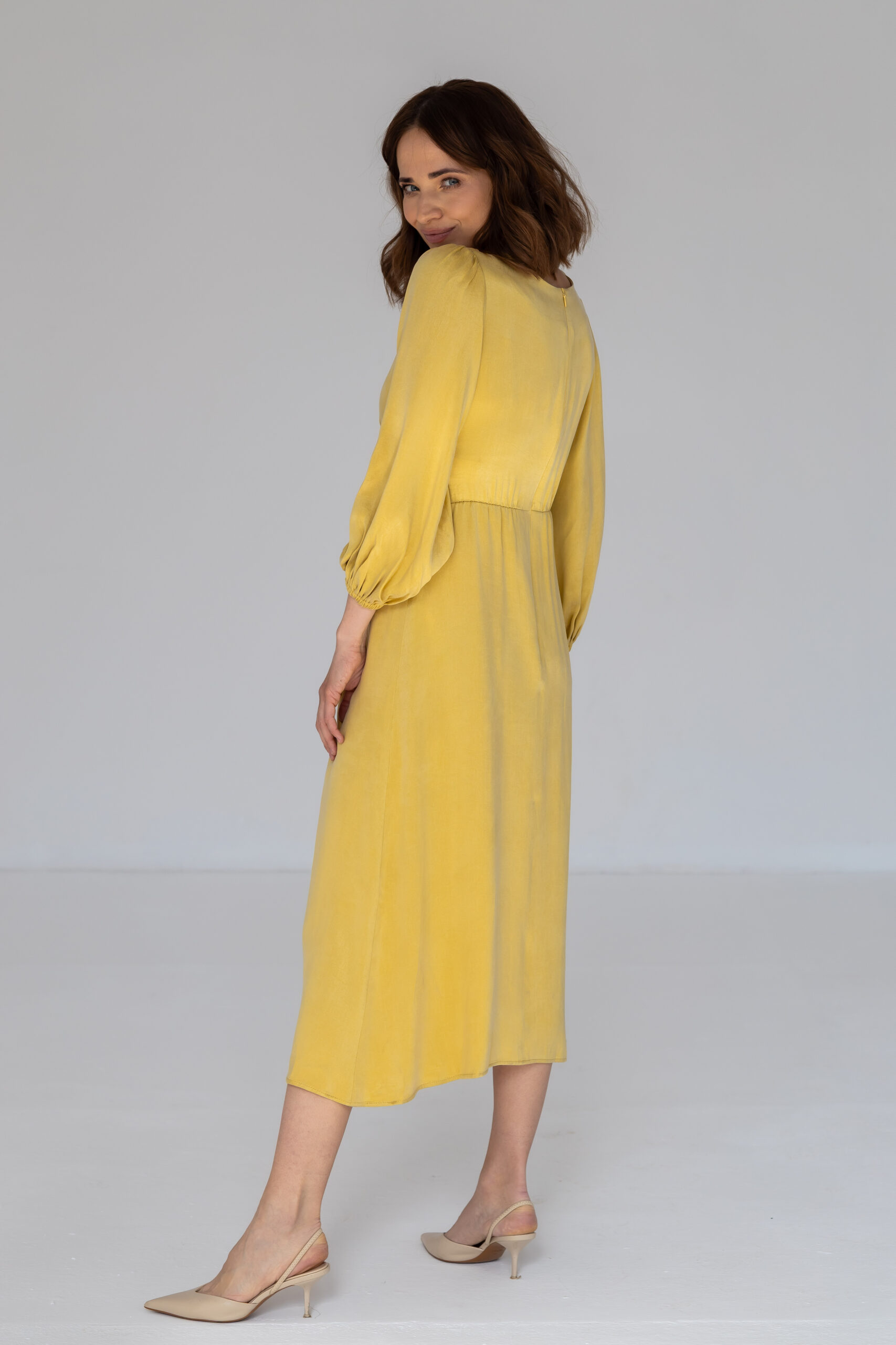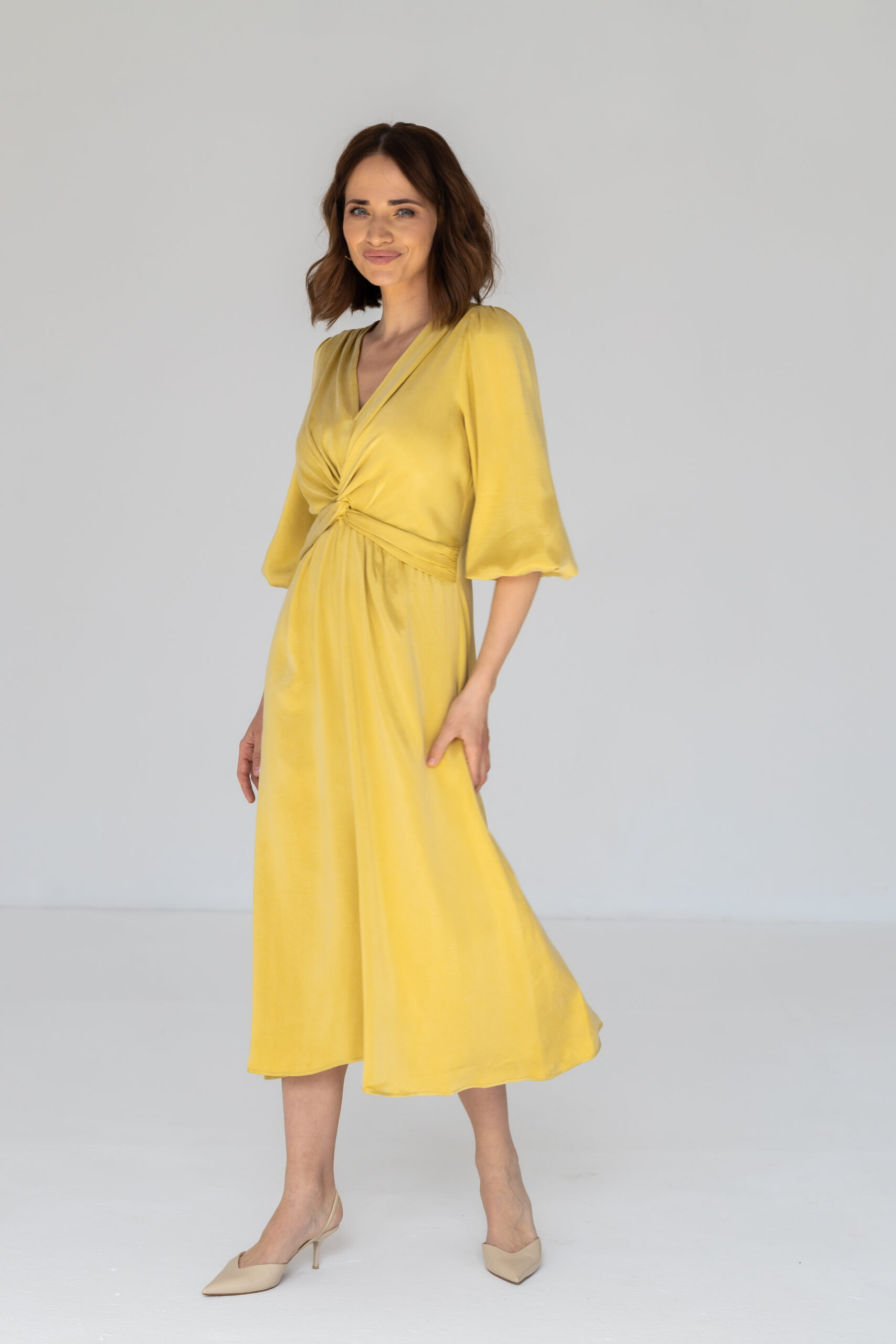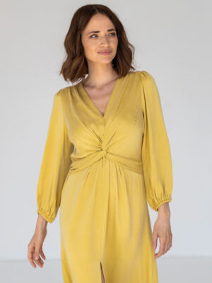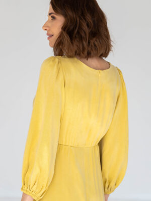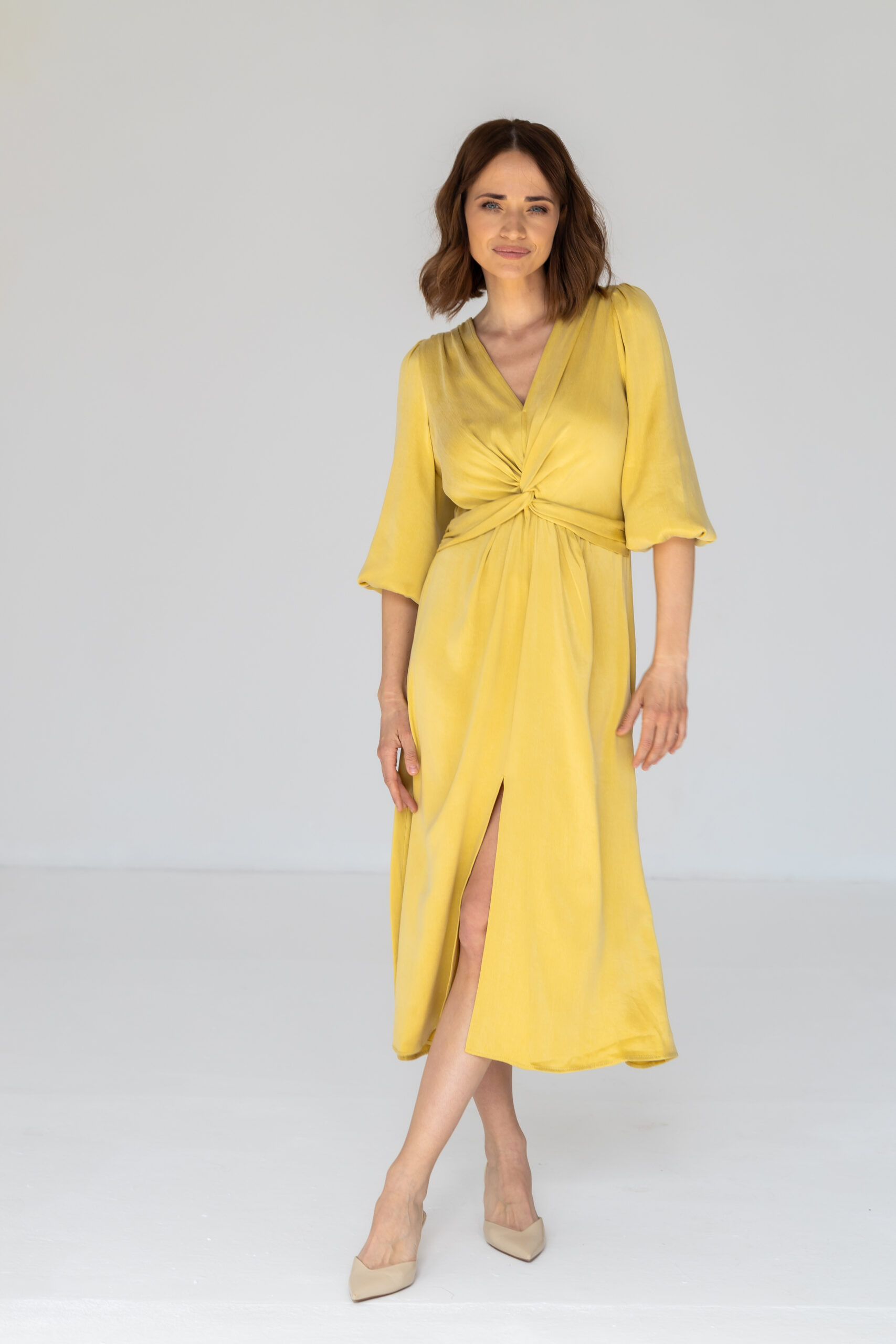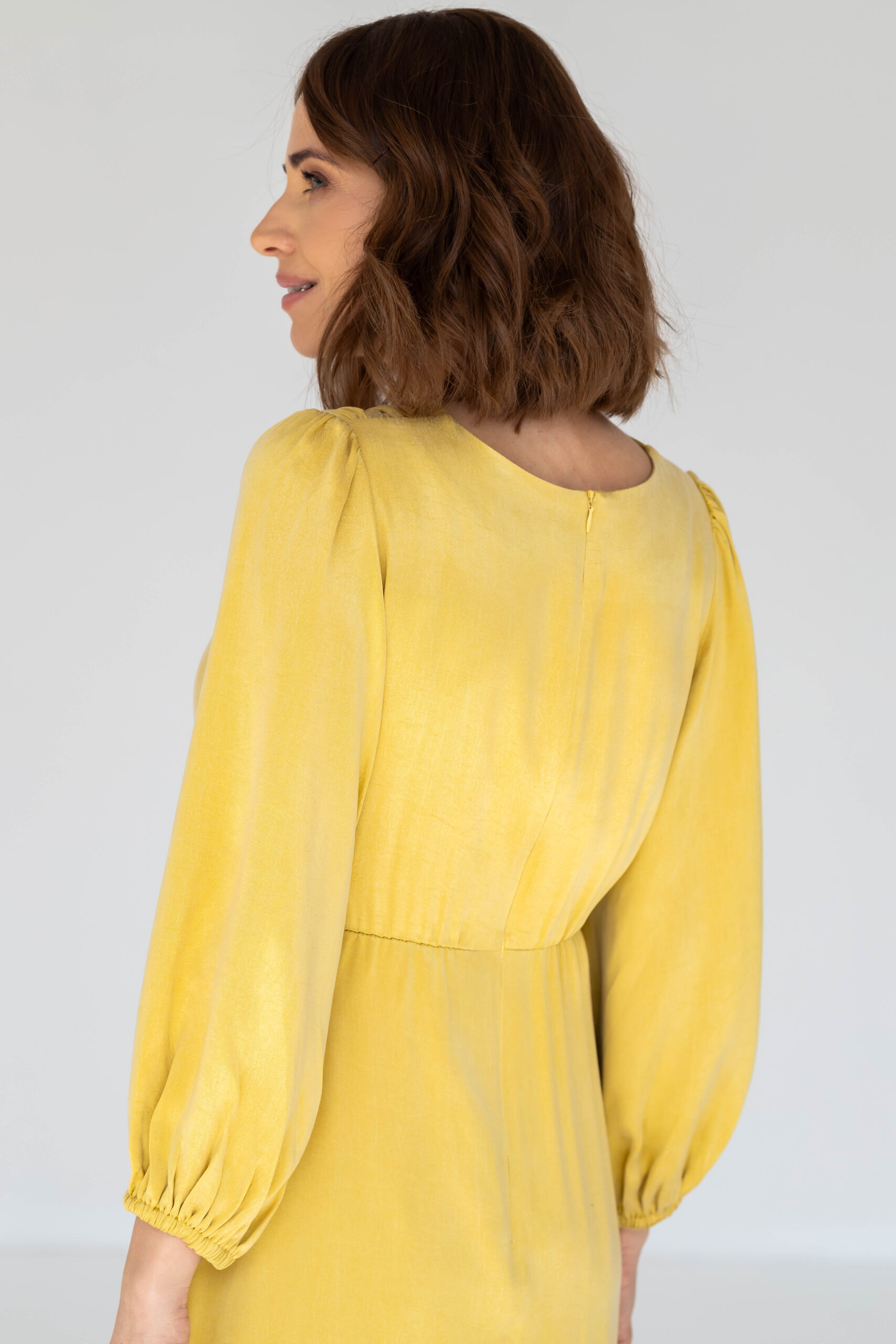 Dzięki luźnej górze i podwyższonej talii z elastyczną gumką z tyłu, sukienka doskonale modeluje sylwetkę, podkreślając jej atuty. Dekolt w literę V i efektowny węzeł w talii optycznie wysmuklają figurę i dodają całości szyku. Spódnica midi o kroju w literę A z subtelnym rozcięciem z boku oraz bufiaste rękawy zakończone gumką nadają sukience wyjątkowej lekkości i klasy.