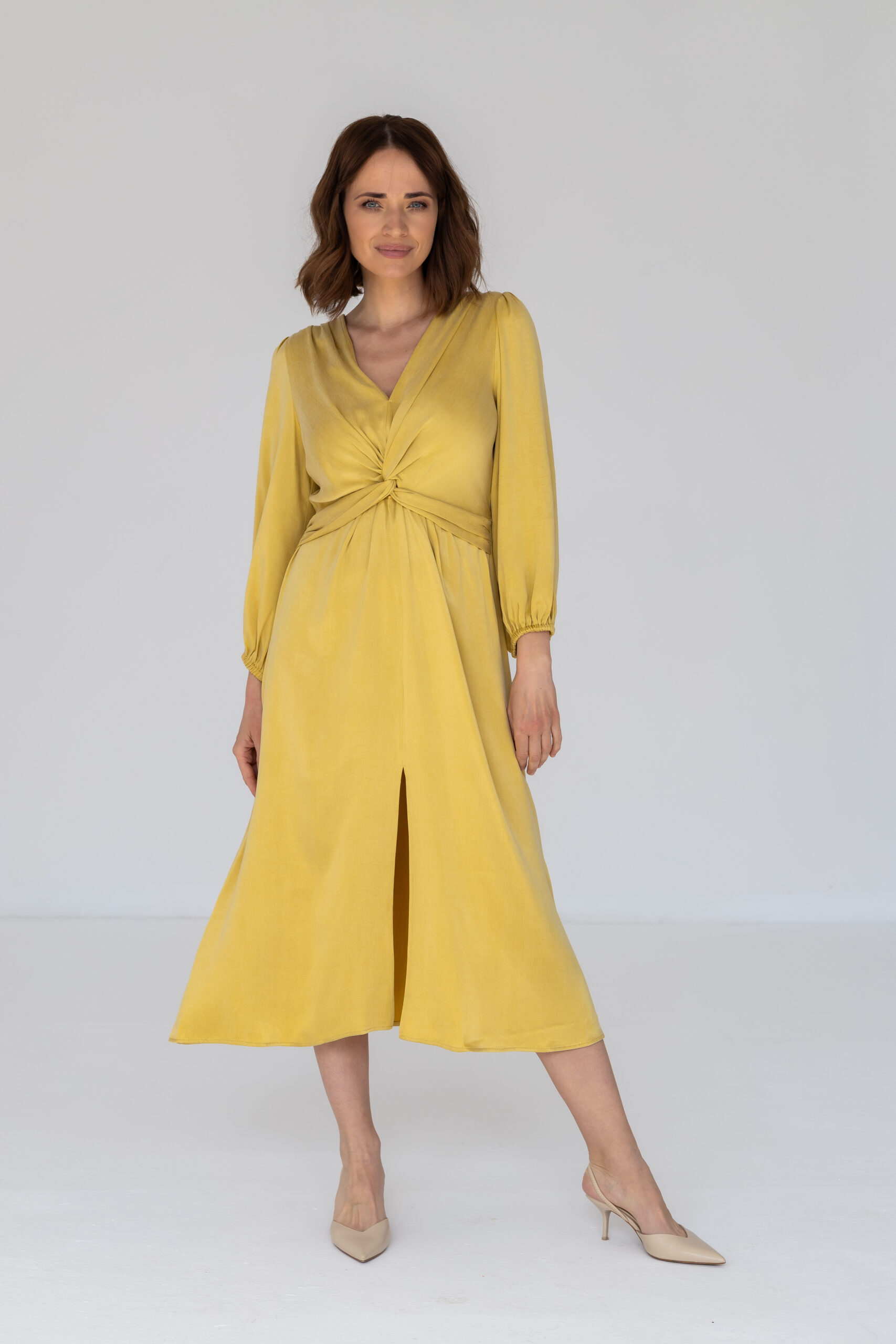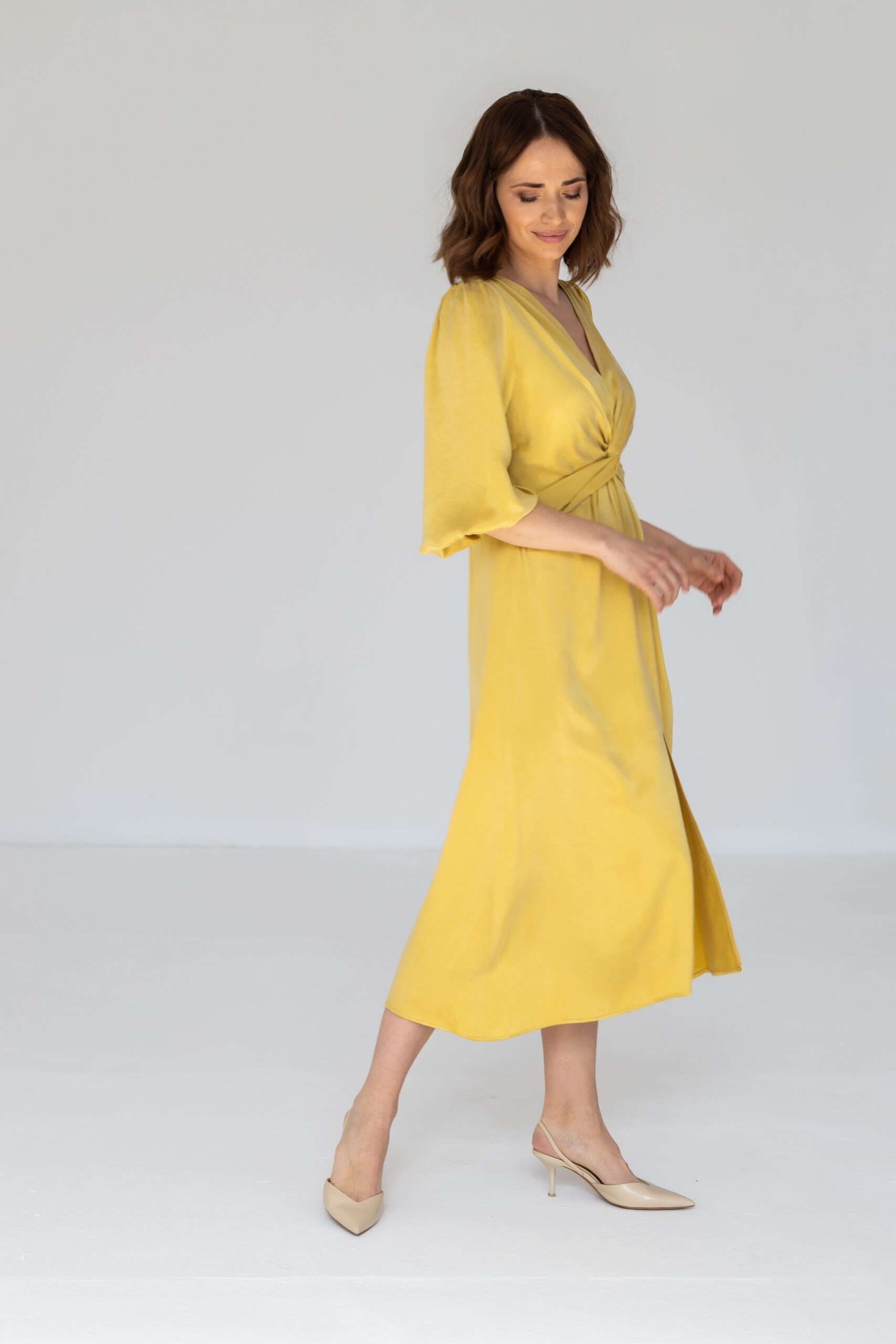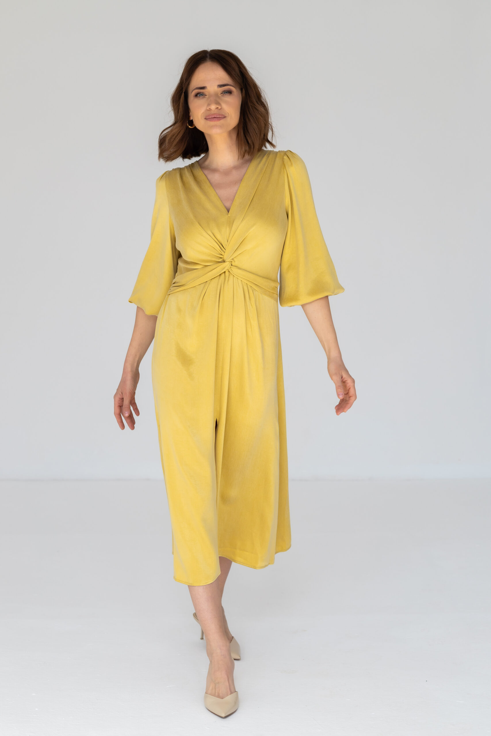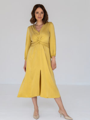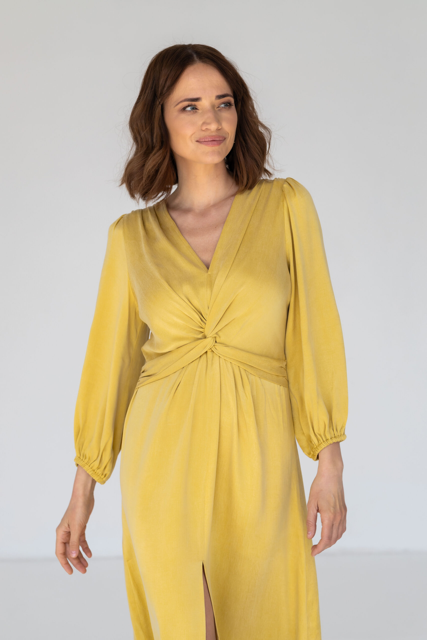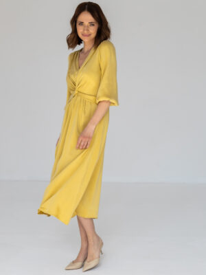 Dzięki luźnej górze i podwyższonej talii z elastyczną gumką z tyłu, sukienka doskonale modeluje sylwetkę, podkreślając jej atuty. Dekolt w literę V i efektowny węzeł w talii optycznie wysmuklają figurę i dodają całości szyku. Spódnica midi o kroju w literę A z subtelnym rozcięciem z boku oraz bufiaste rękawy zakończone gumką nadają sukience wyjątkowej lekkości i klasy.