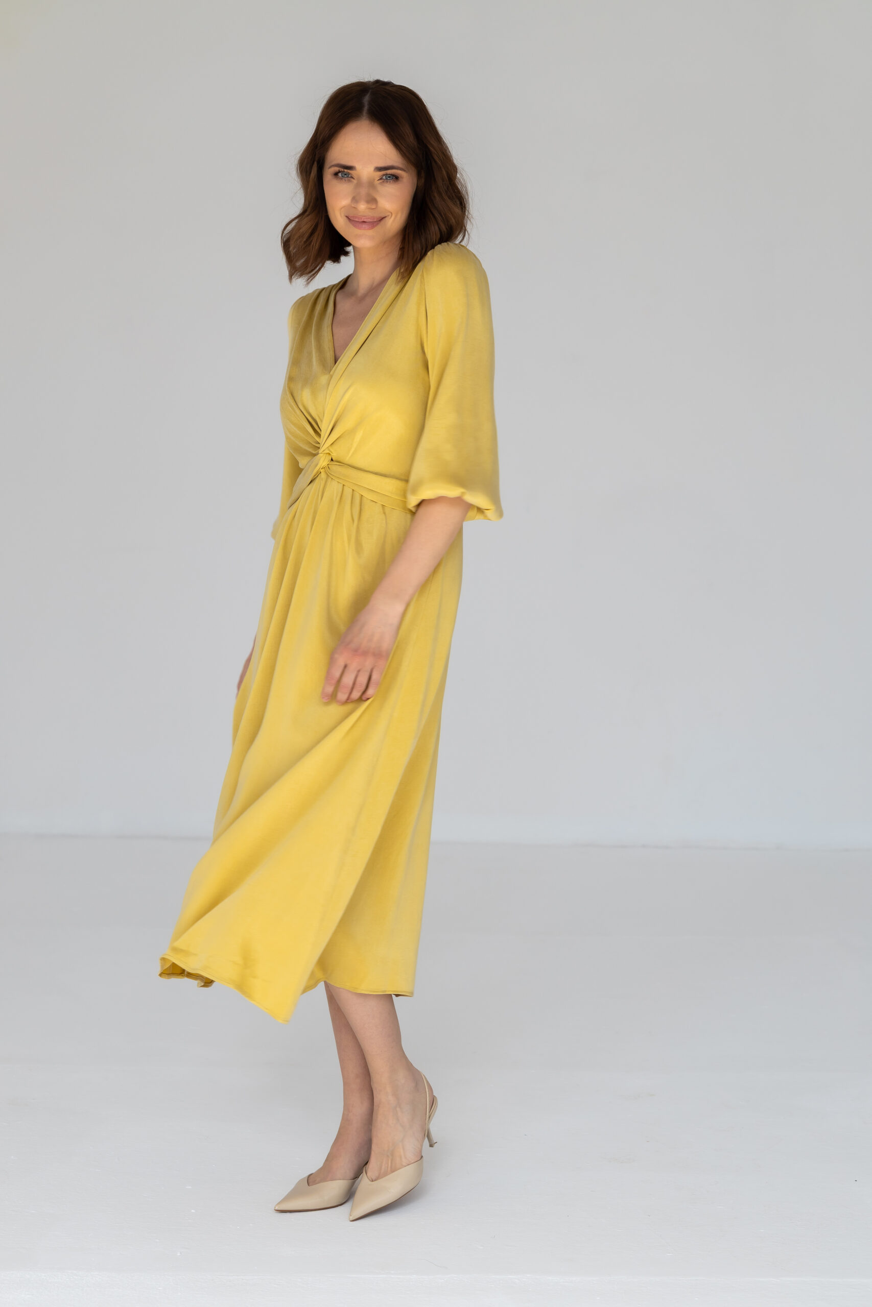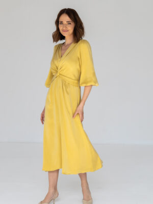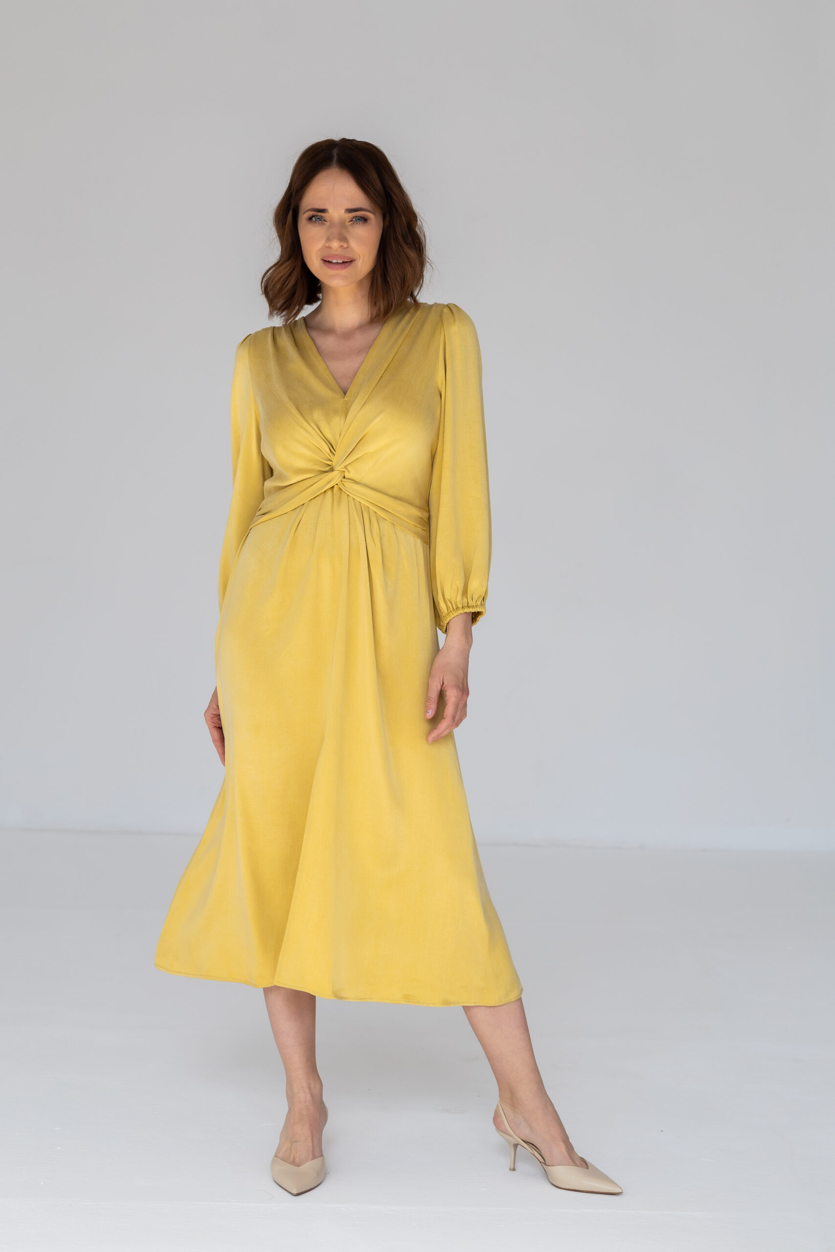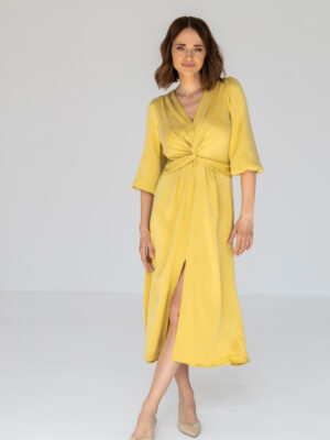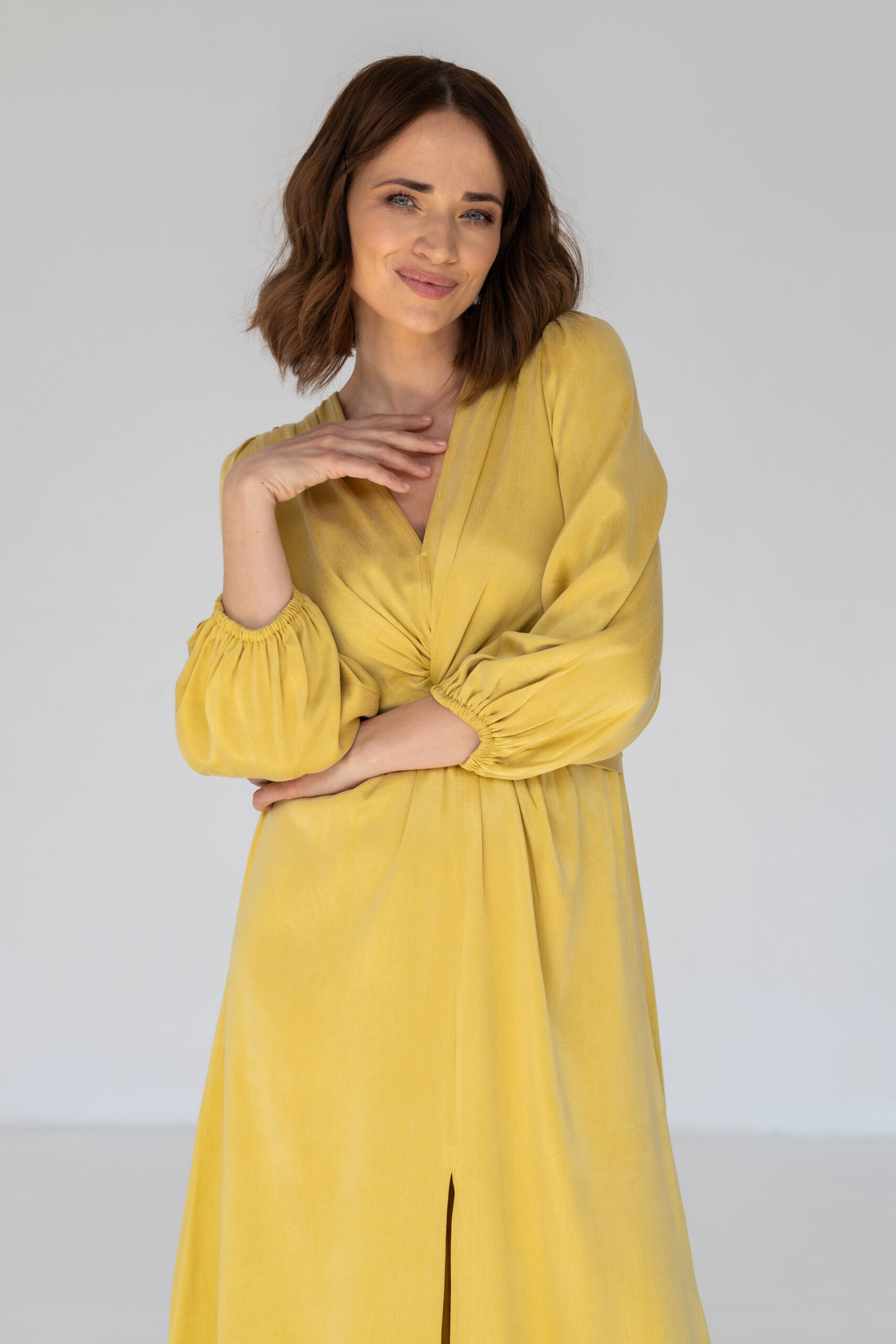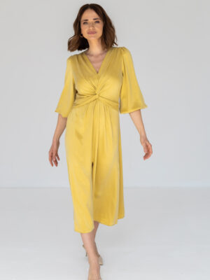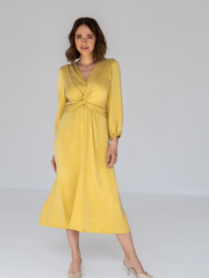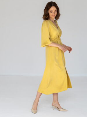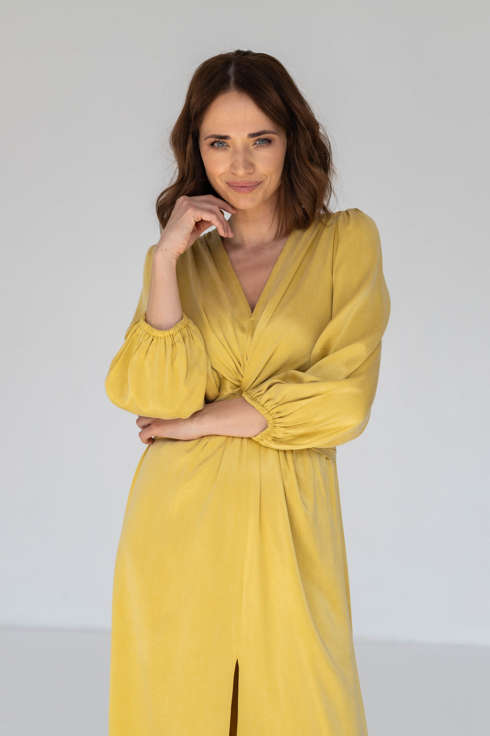 Dzięki luźnej górze i podwyższonej talii z elastyczną gumką z tyłu, sukienka doskonale modeluje sylwetkę, podkreślając jej atuty. Dekolt w literę V i efektowny węzeł w talii optycznie wysmuklają figurę i dodają całości szyku. Spódnica midi o kroju w literę A z subtelnym rozcięciem z boku oraz bufiaste rękawy zakończone gumką nadają sukience wyjątkowej lekkości i klasy.
