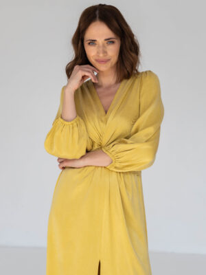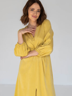 Sukienka uszyta jest z mieszanki wiskozy i lyocellu o wykończeniu „peach skin”. Tkanina dodaje całości szlachetności, delikatności i elegancji.