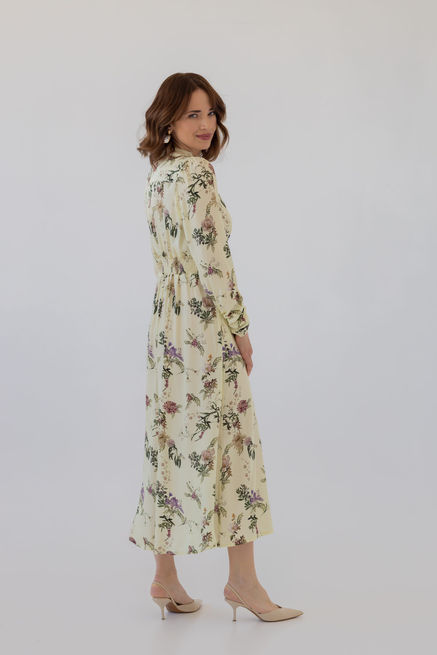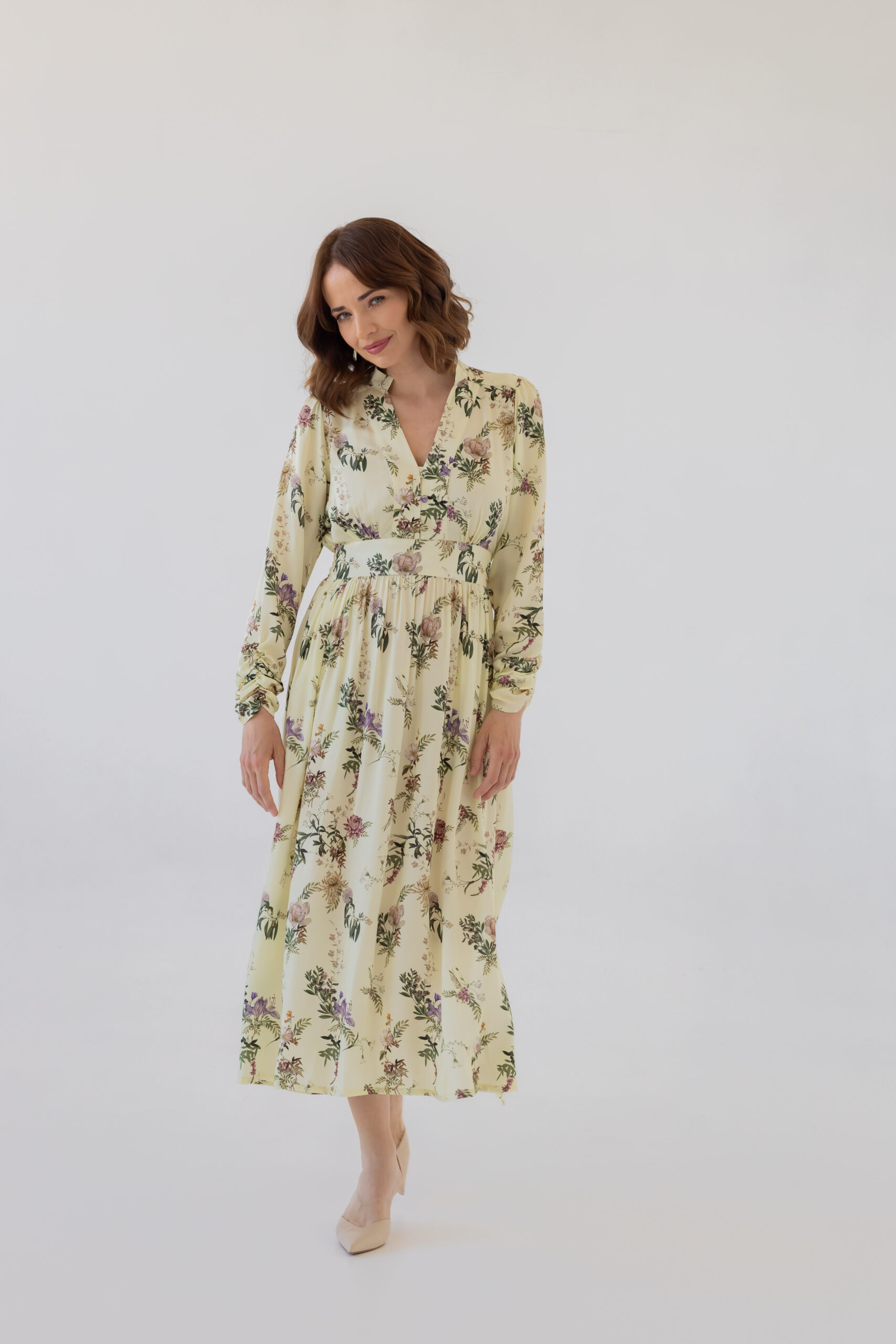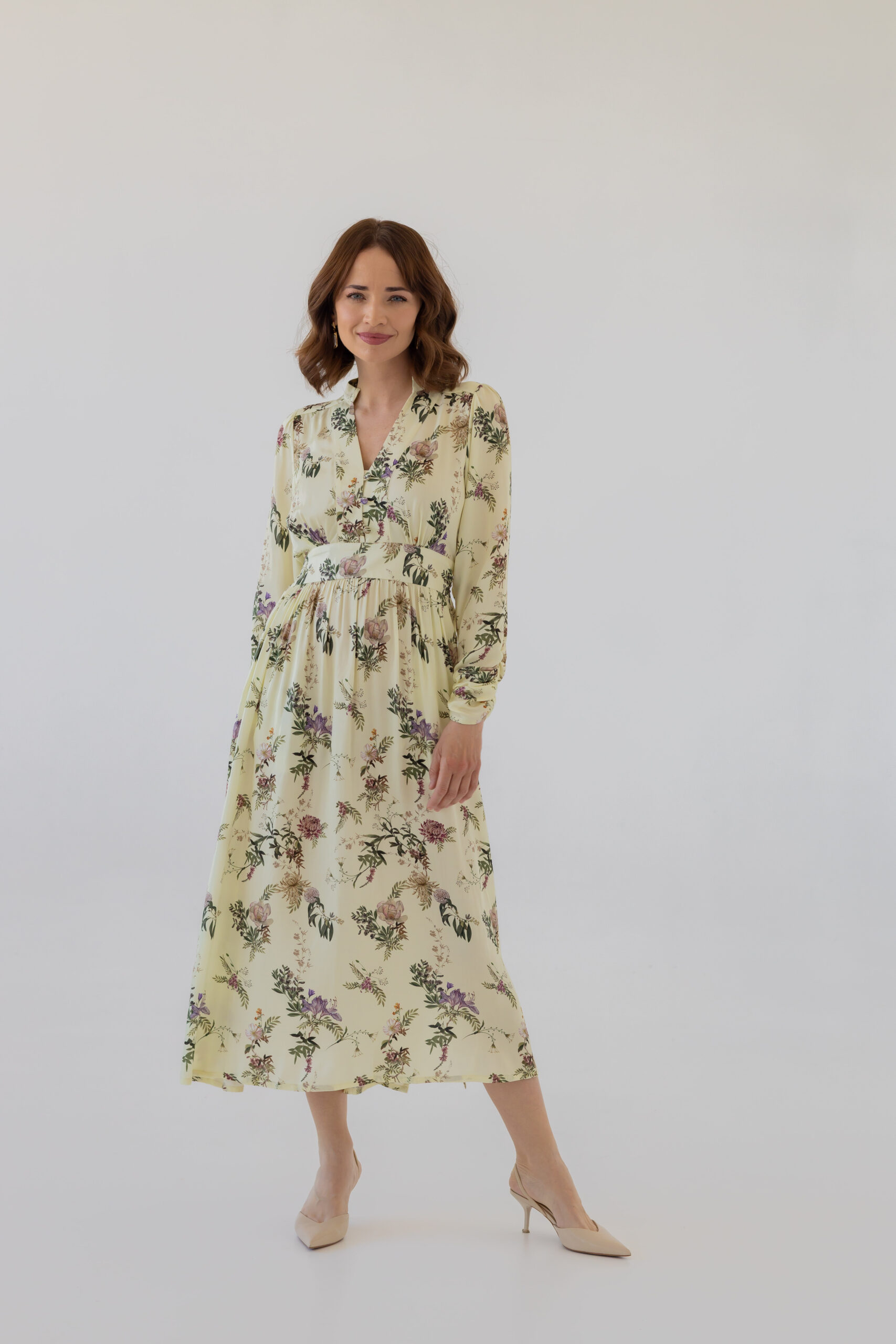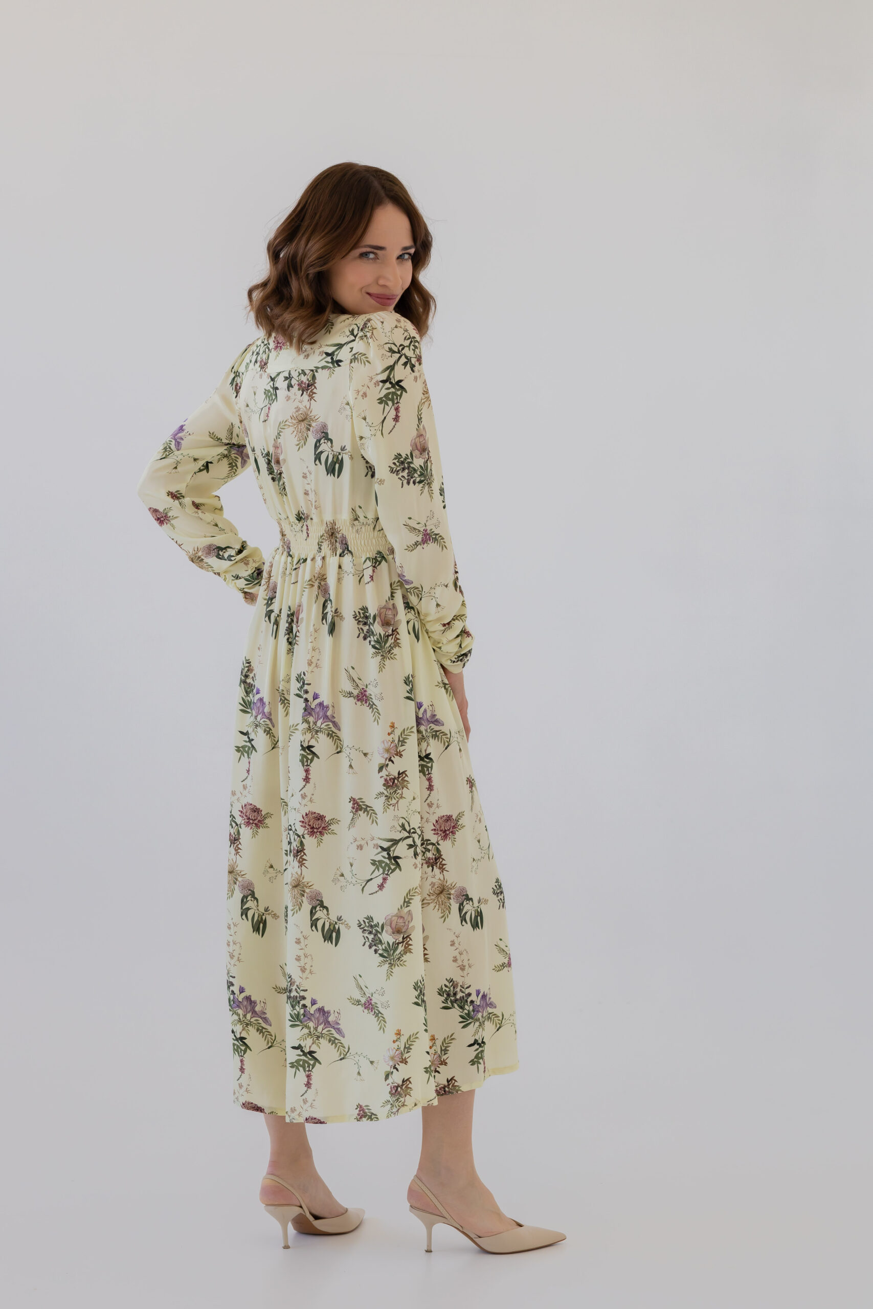 Dzięki dopasowanej górze i podwyższonej talii z elastyczną gumką z tyłu, sukienka doskonale modeluje sylwetkę, podkreślając jej atuty. Stójka oraz rozpinany dekolt w kształcie litery V optycznie wysmuklają figurę i dodają całości szyku. Rozkloszowana spódnica midi z subtelnym rozcięciem z boku oraz bufiaste rękawy zakończone na dole marszczeniem nadają sukience wyjątkowej lekkości i klasy.