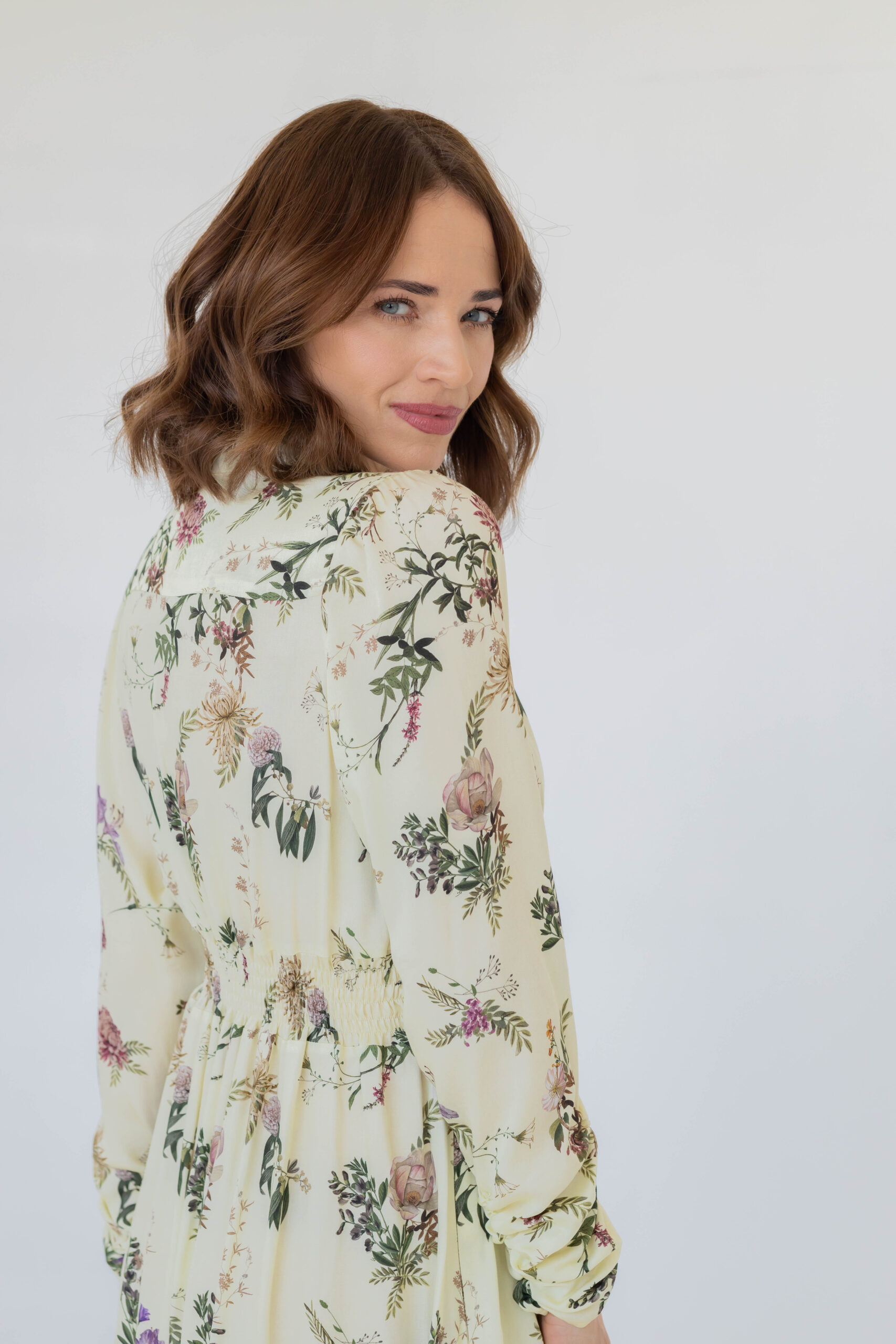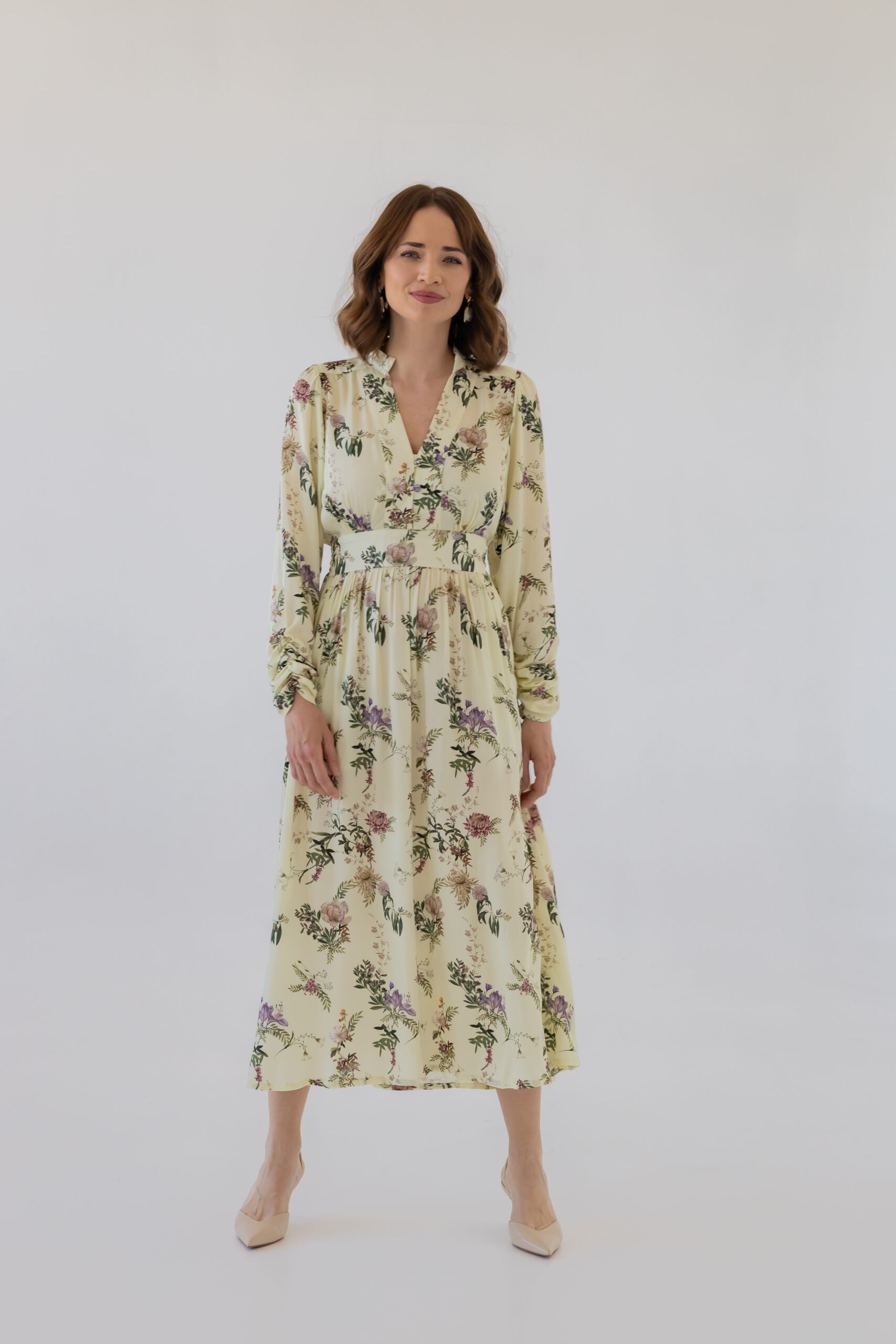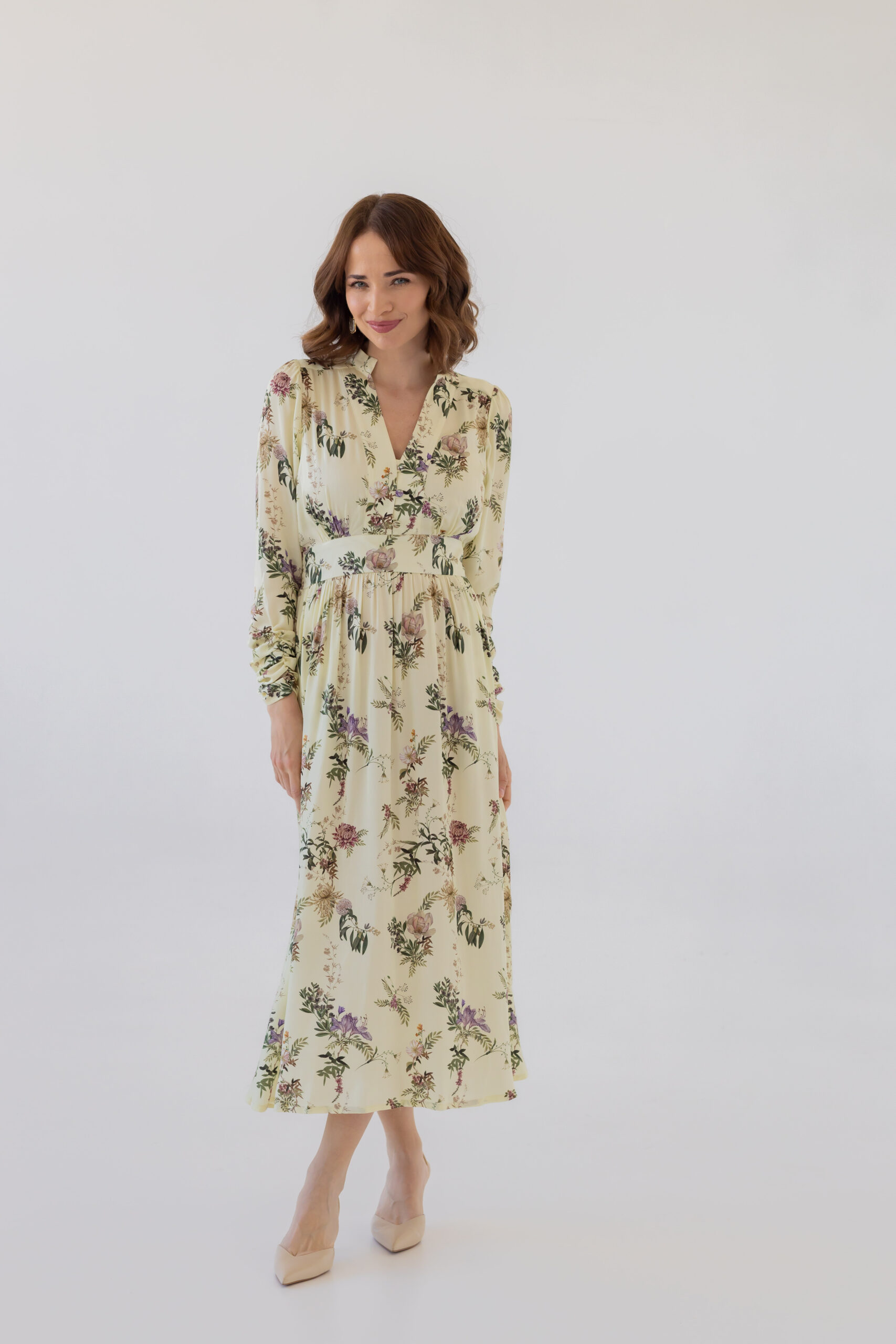Dzięki dopasowanej górze i podwyższonej talii z elastyczną gumką z tyłu, sukienka doskonale modeluje sylwetkę, podkreślając jej atuty. Stójka oraz rozpinany dekolt w kształcie litery V optycznie wysmuklają figurę i dodają całości szyku. Rozkloszowana spódnica midi z subtelnym rozcięciem z boku oraz bufiaste rękawy zakończone na dole marszczeniem nadają sukience wyjątkowej lekkości i klasy.