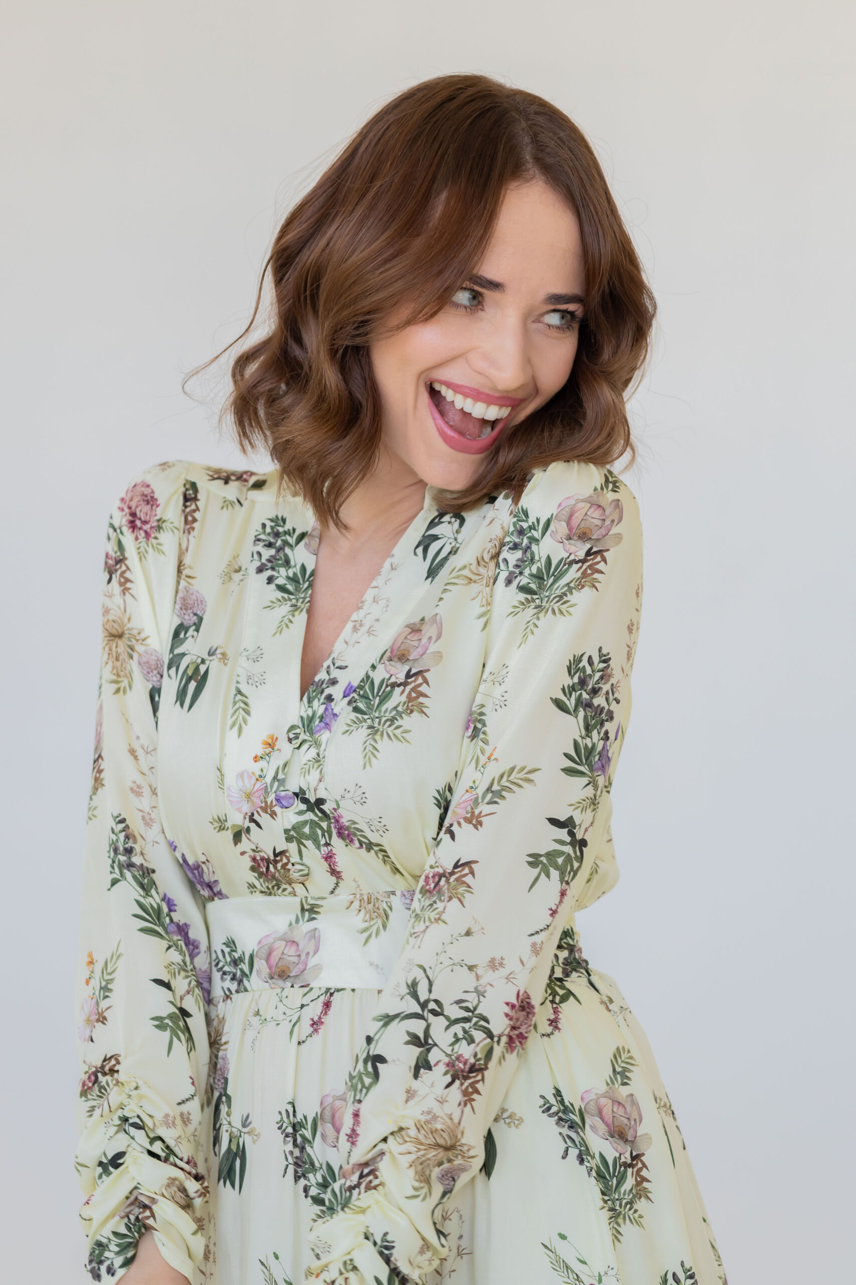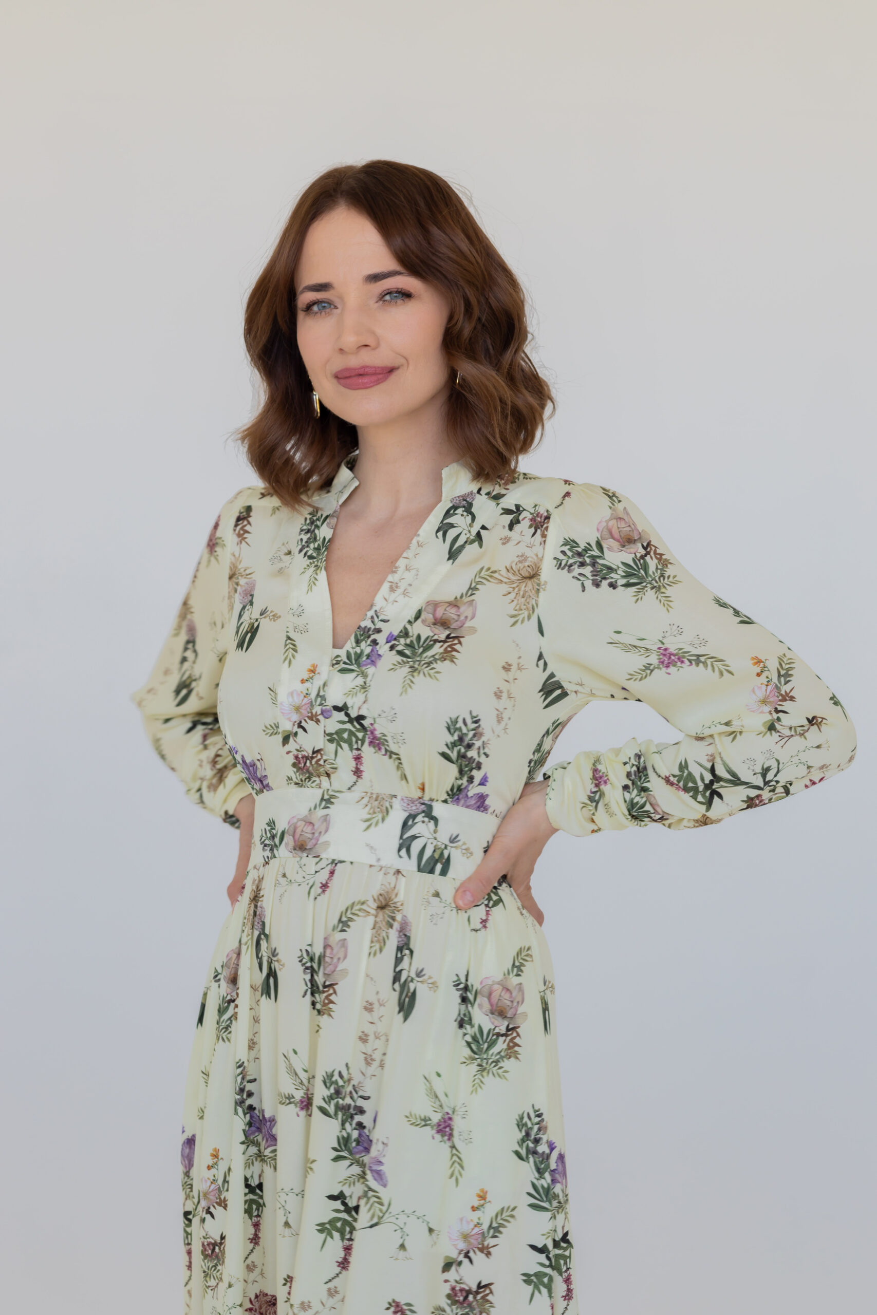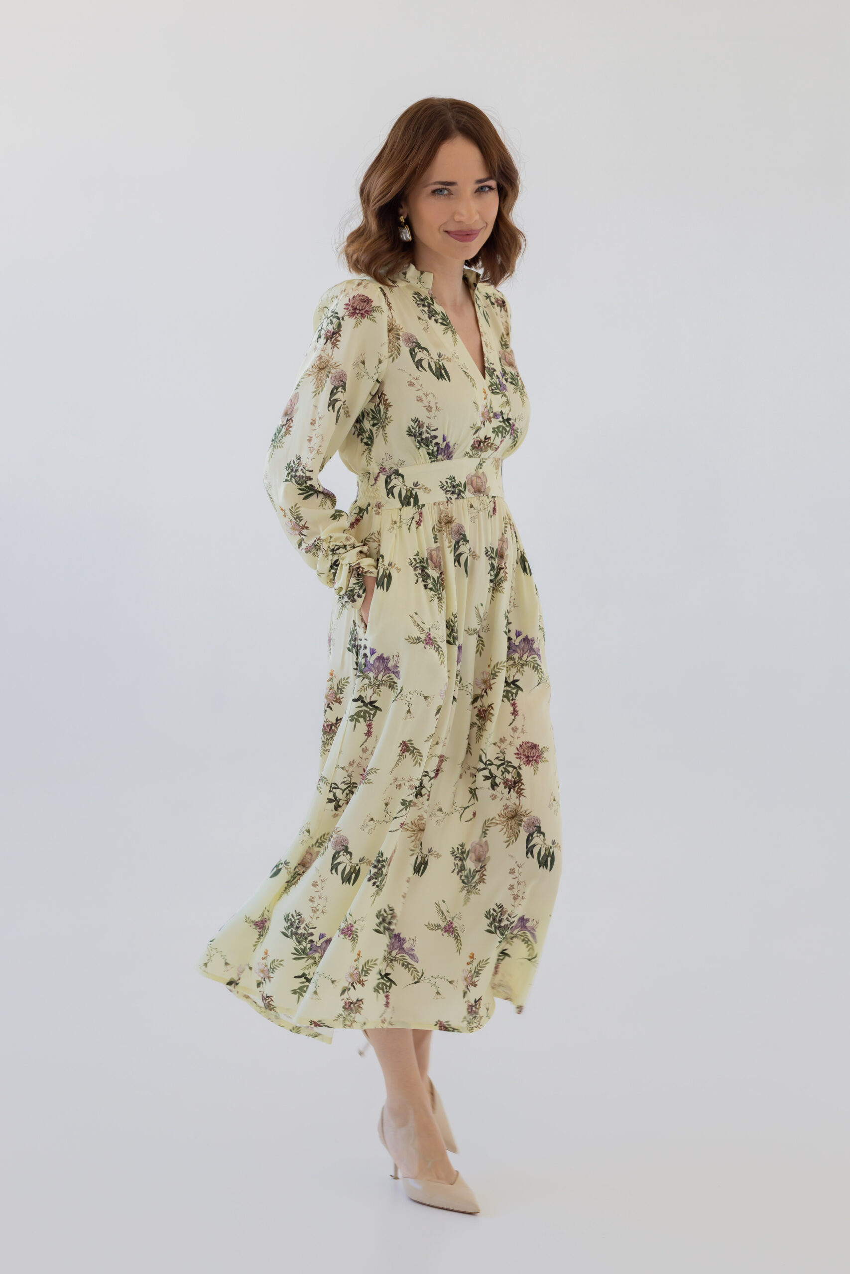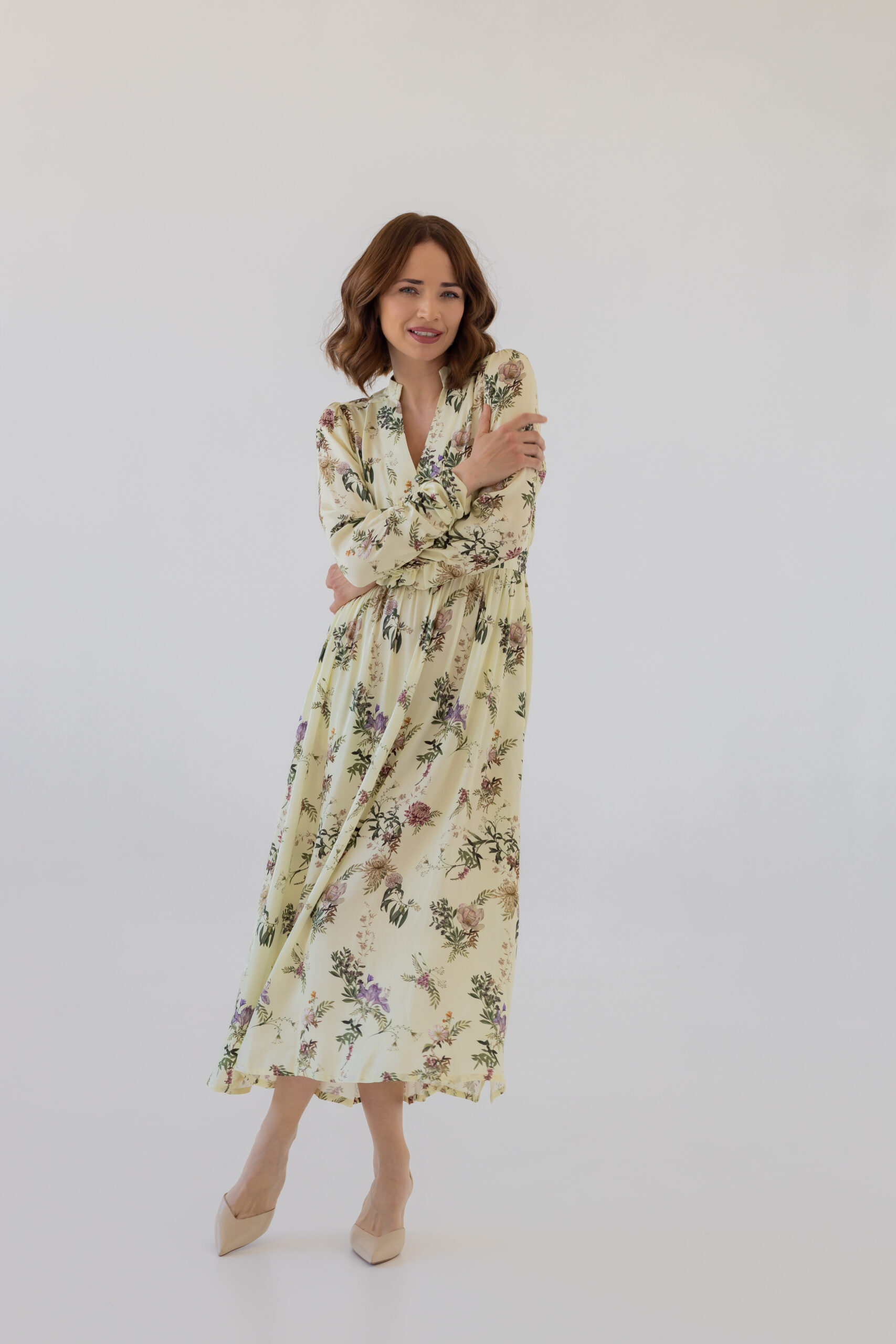 Dzięki dopasowanej górze i podwyższonej talii z elastyczną gumką z tyłu, sukienka doskonale modeluje sylwetkę, podkreślając jej atuty. Stójka oraz rozpinany dekolt w kształcie litery V optycznie wysmuklają figurę i dodają całości szyku. Rozkloszowana spódnica midi z subtelnym rozcięciem z boku oraz bufiaste rękawy zakończone na dole marszczeniem nadają sukience wyjątkowej lekkości i klasy.
