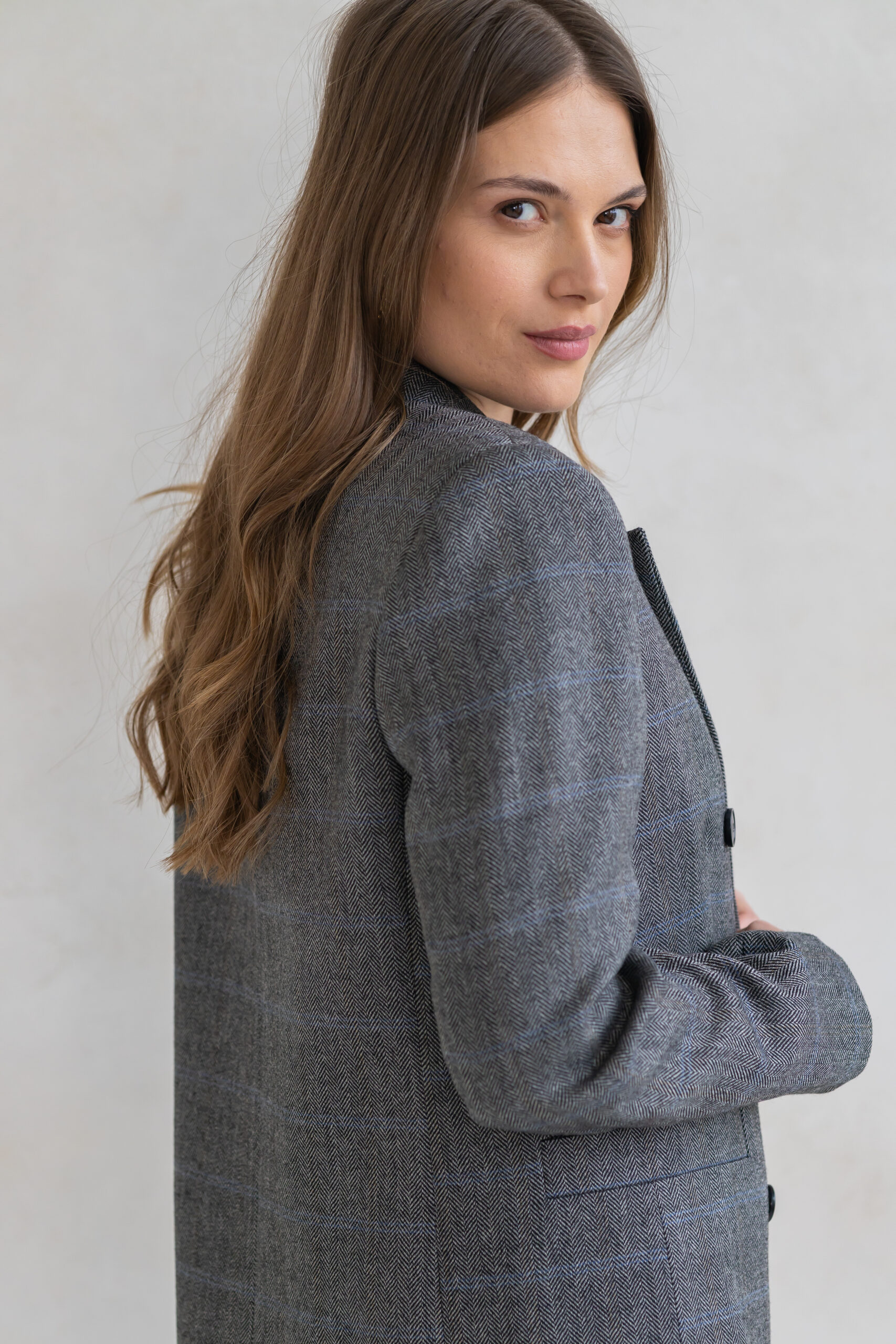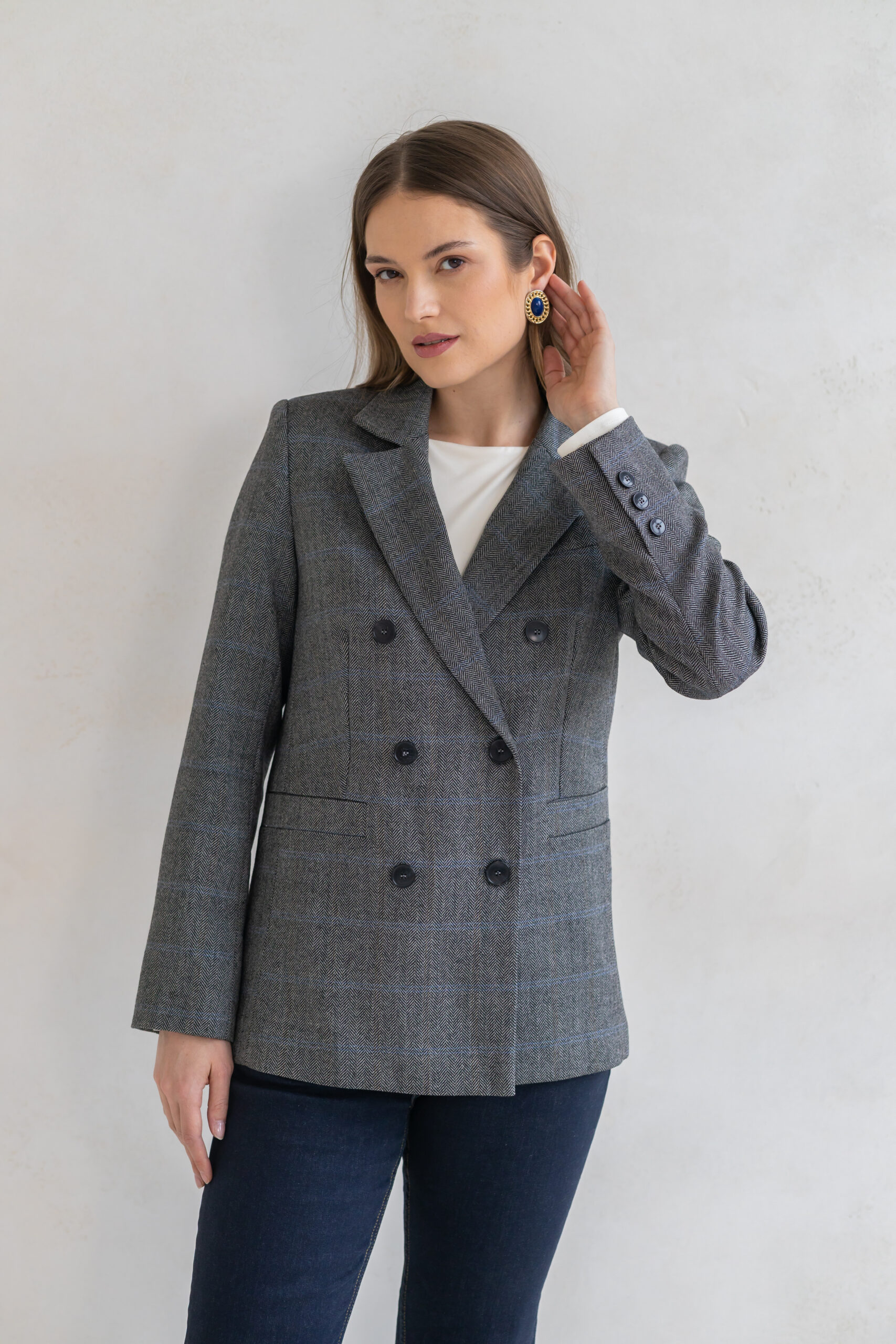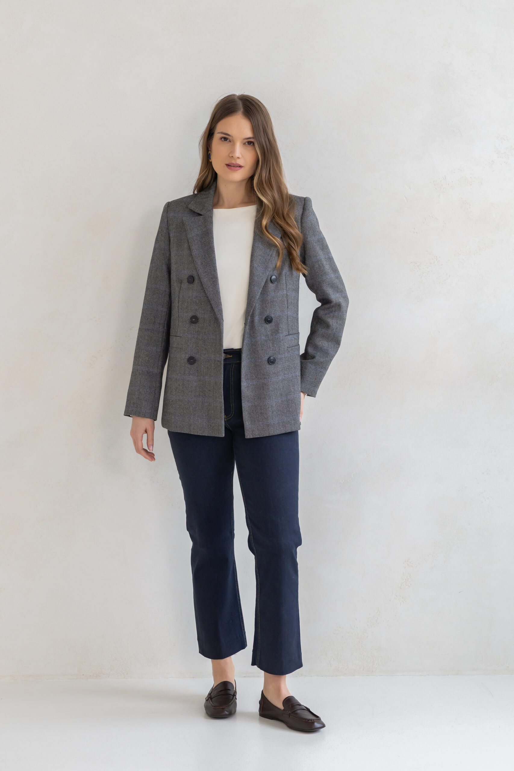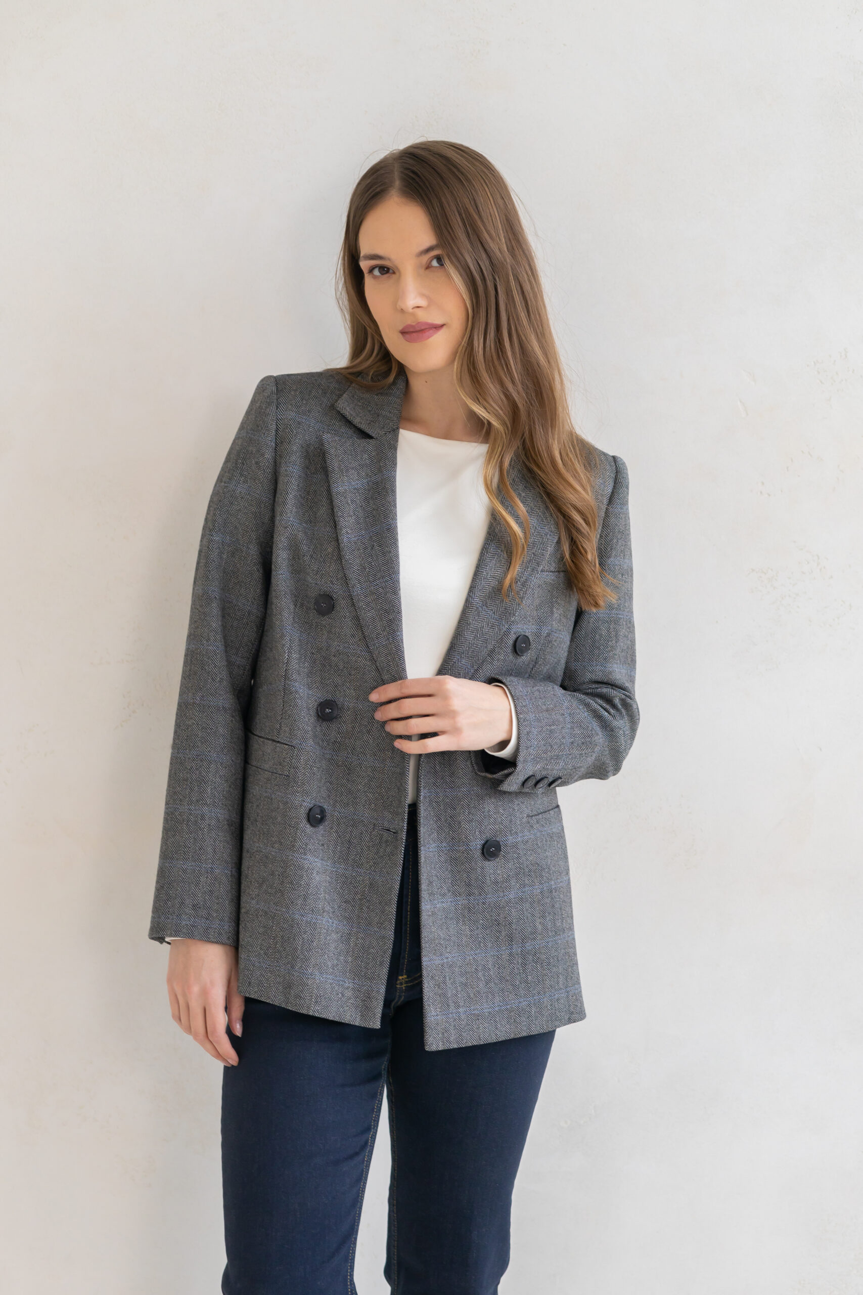 Dwurzędowy fason z subtelnie podkreśloną linią talii oraz precyzyjnie skrojonymi ramionami nadaje jej wyrafinowanego, ponadczasowego charakteru. Klasyczna brązowa krata dodaje stylizacji elegancji i modowej pewności – to wzór, który nigdy nie wychodzi z mody.