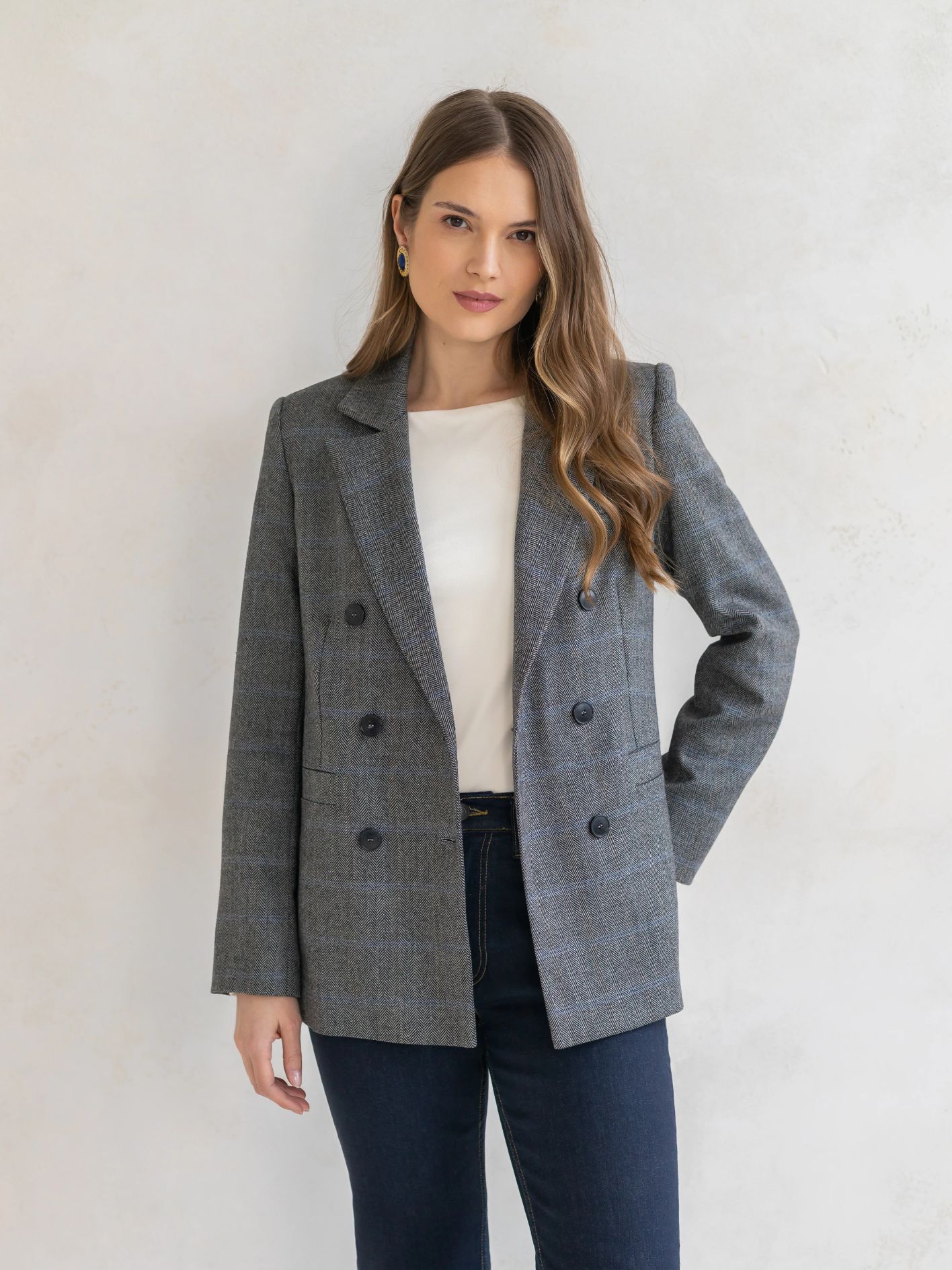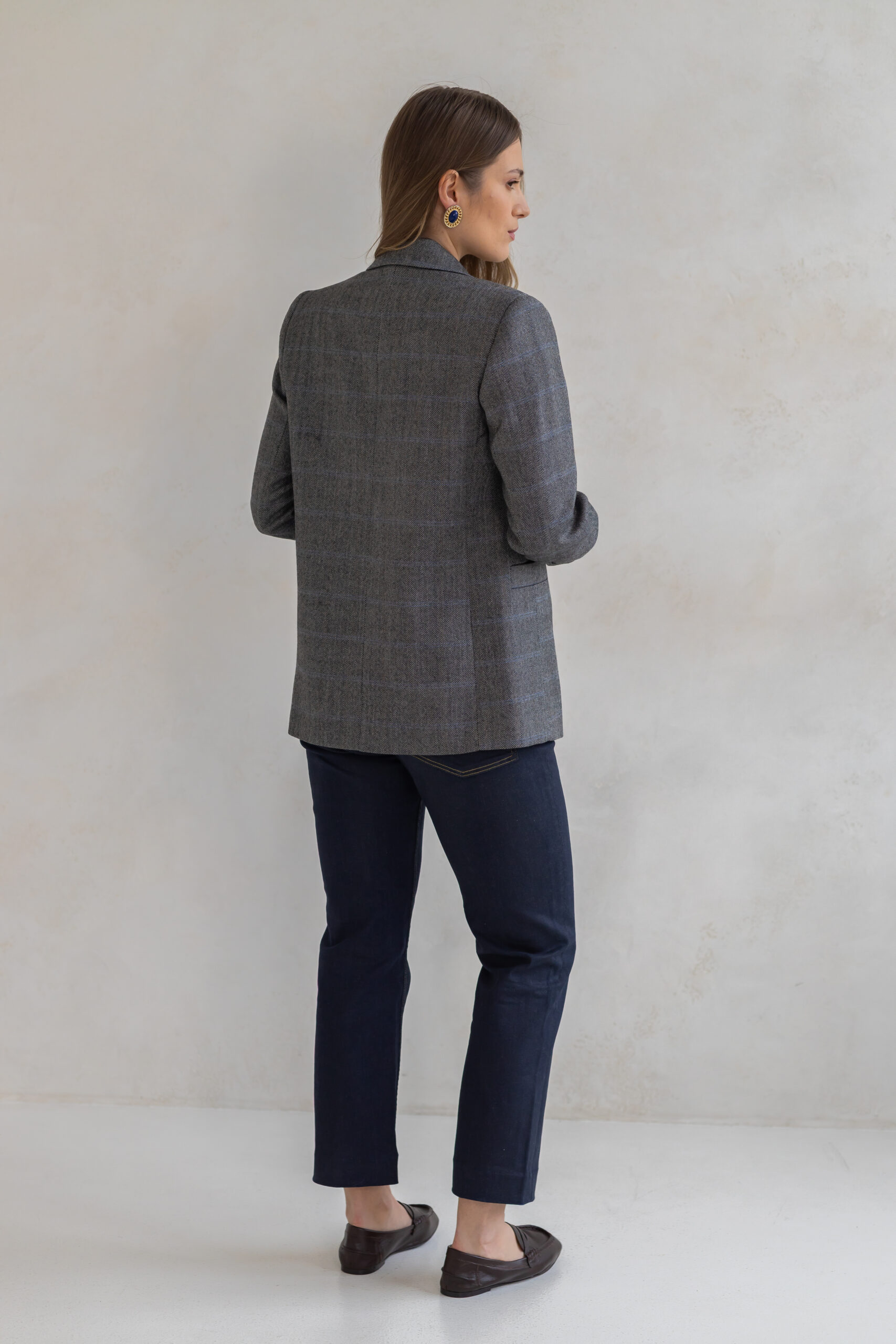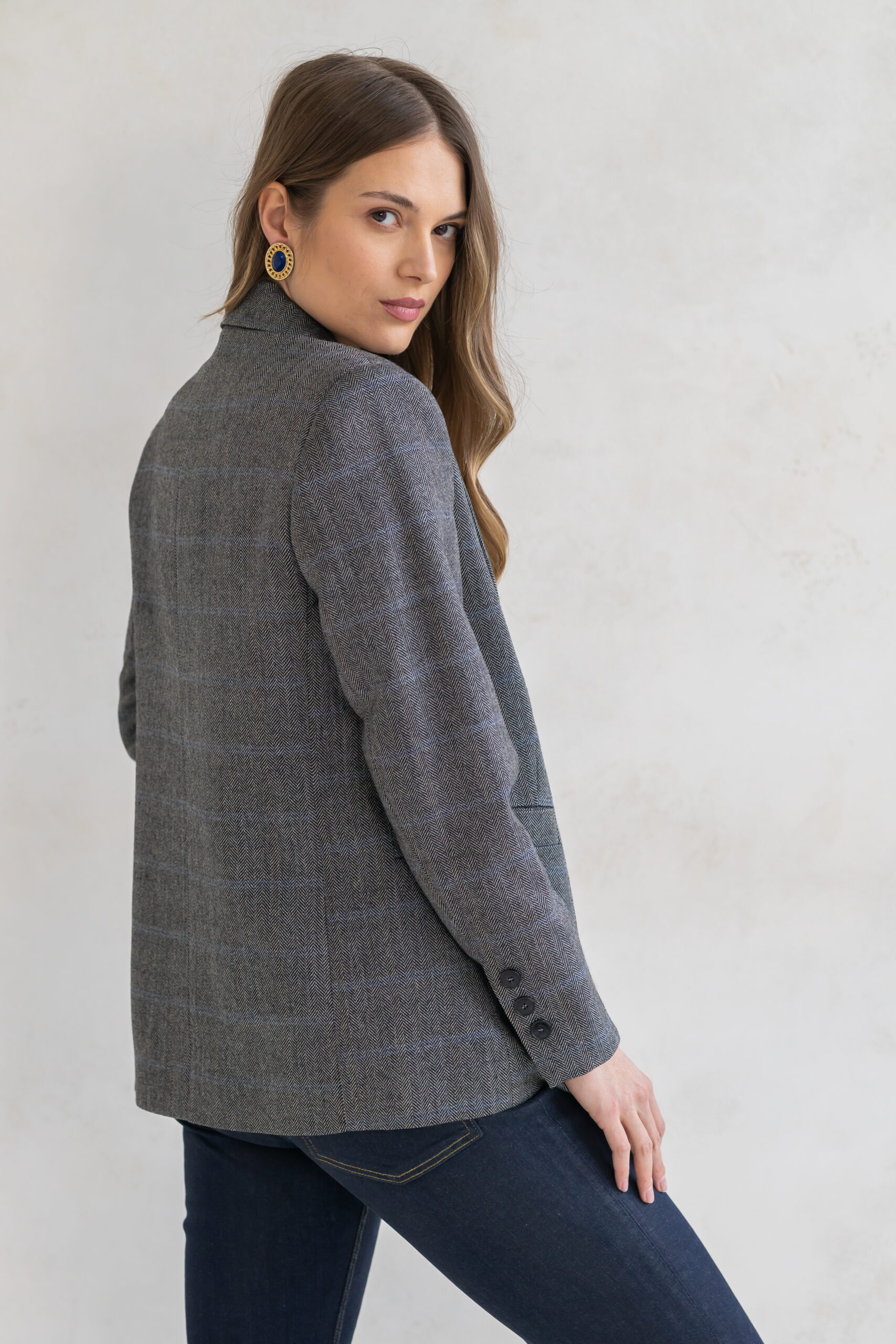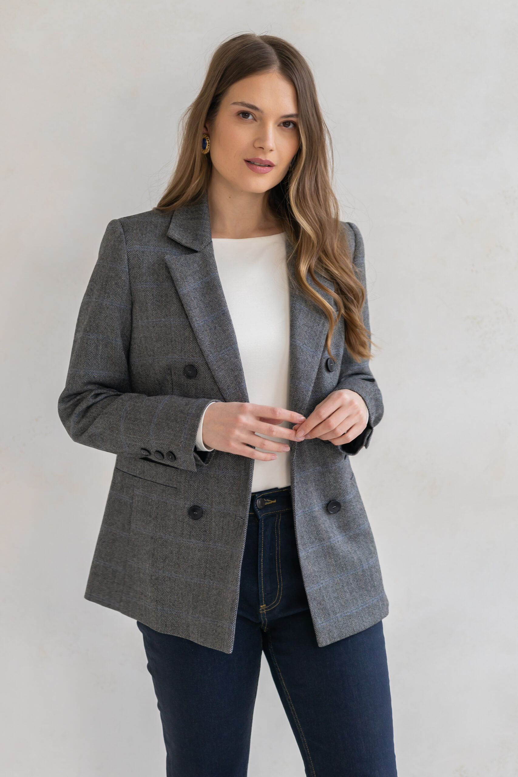 Dwurzędowy fason z subtelnie podkreśloną linią talii oraz precyzyjnie skrojonymi ramionami nadaje jej wyrafinowanego, ponadczasowego charakteru. Klasyczna brązowa krata dodaje stylizacji elegancji i modowej pewności – to wzór, który nigdy nie wychodzi z mody.