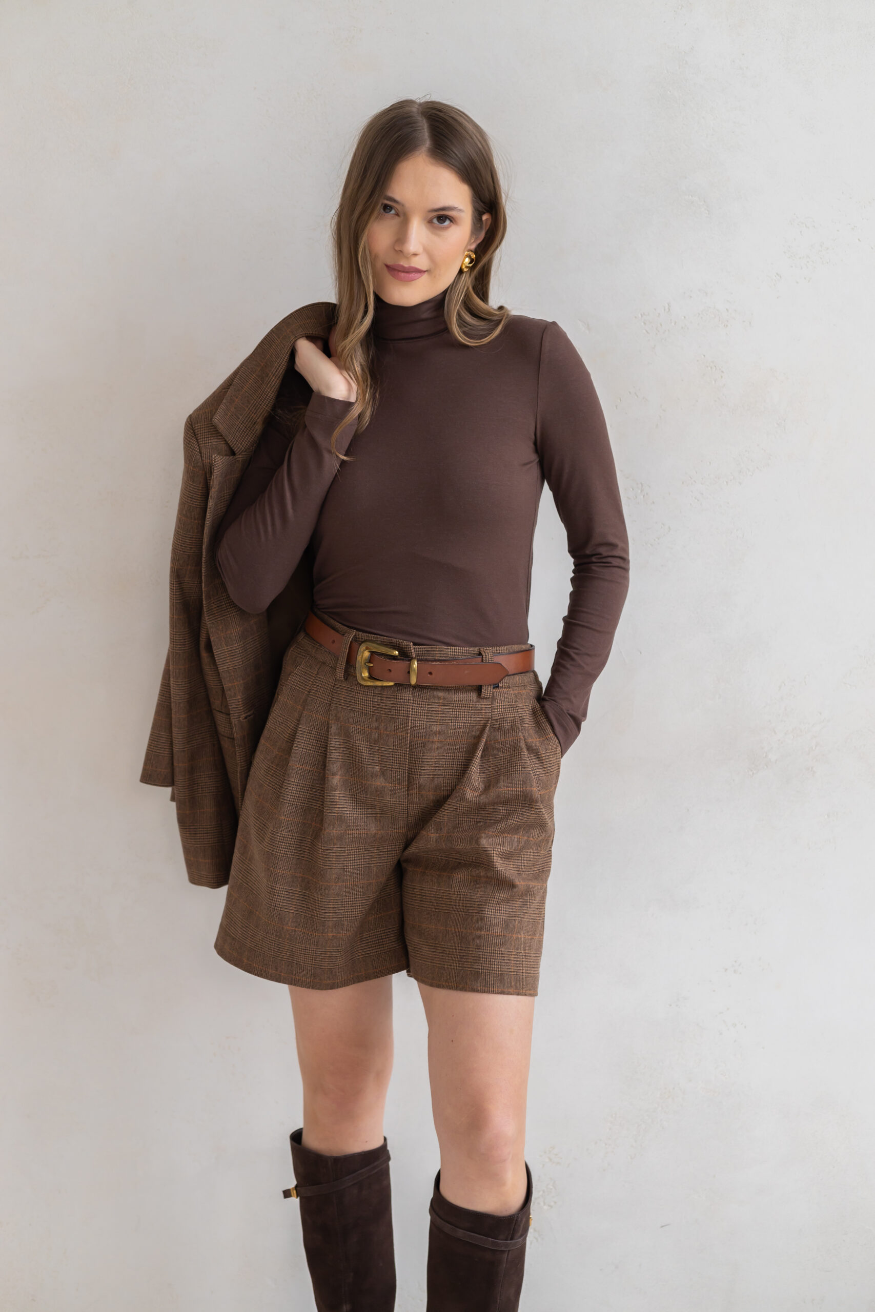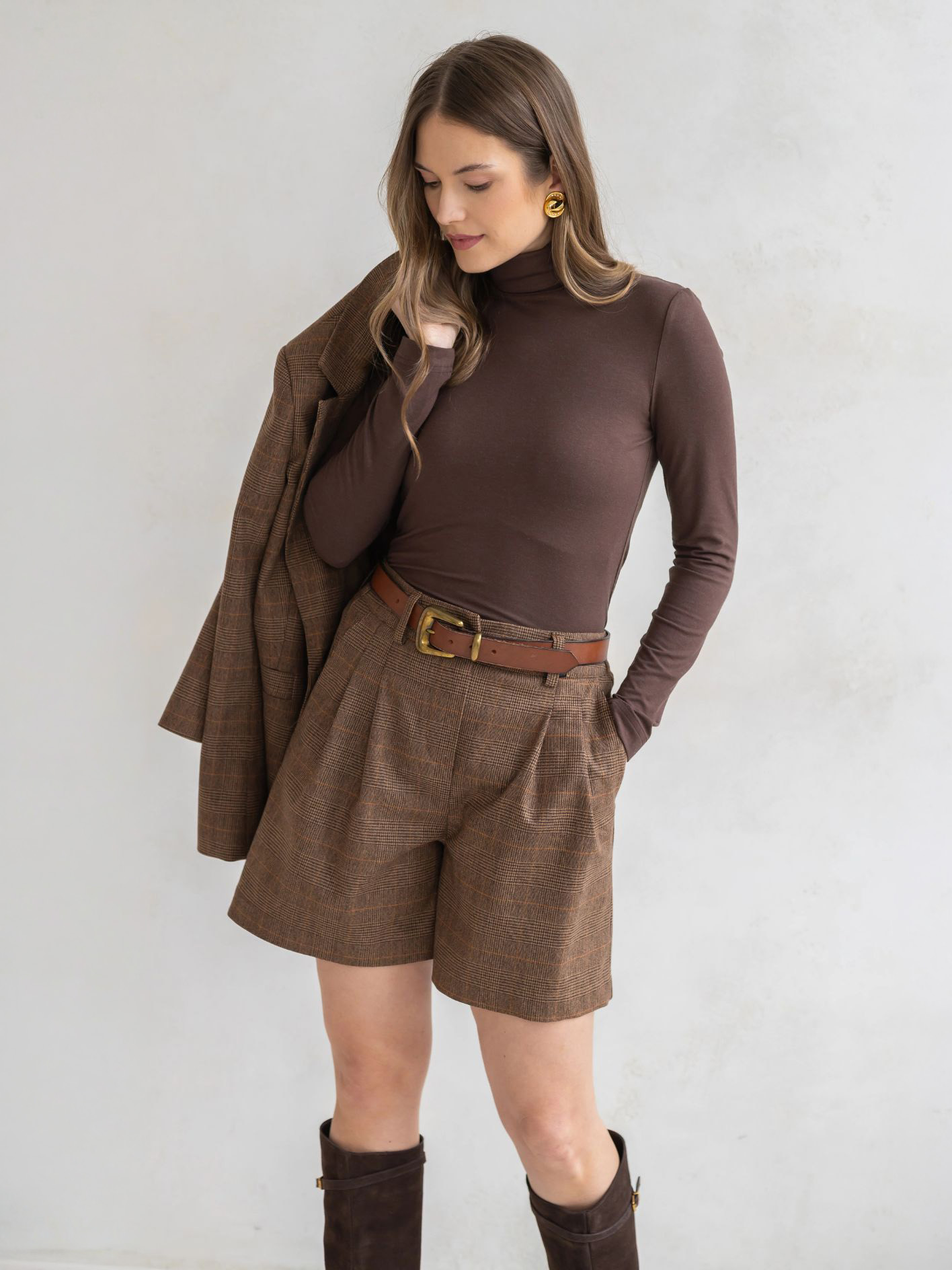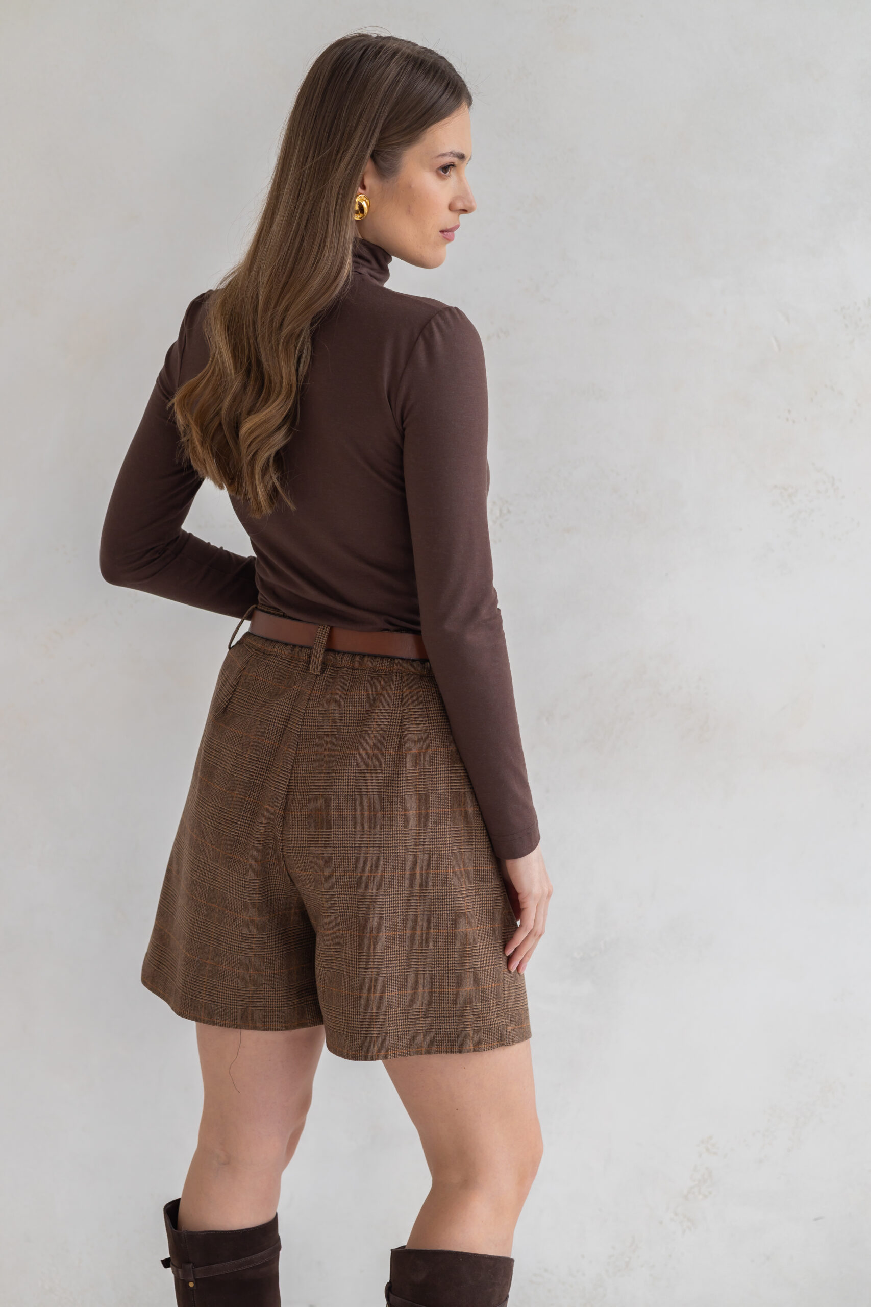 Wełniane szorty LILY w brązową kratę to kwintesencja elegancji i komfortu. Uszyte z mieszanki wełny i jedwabiu, zapewniają doskonałą termoizolację, przewiewność i miękkość, co sprawia, że są idealne na każdą porę roku.