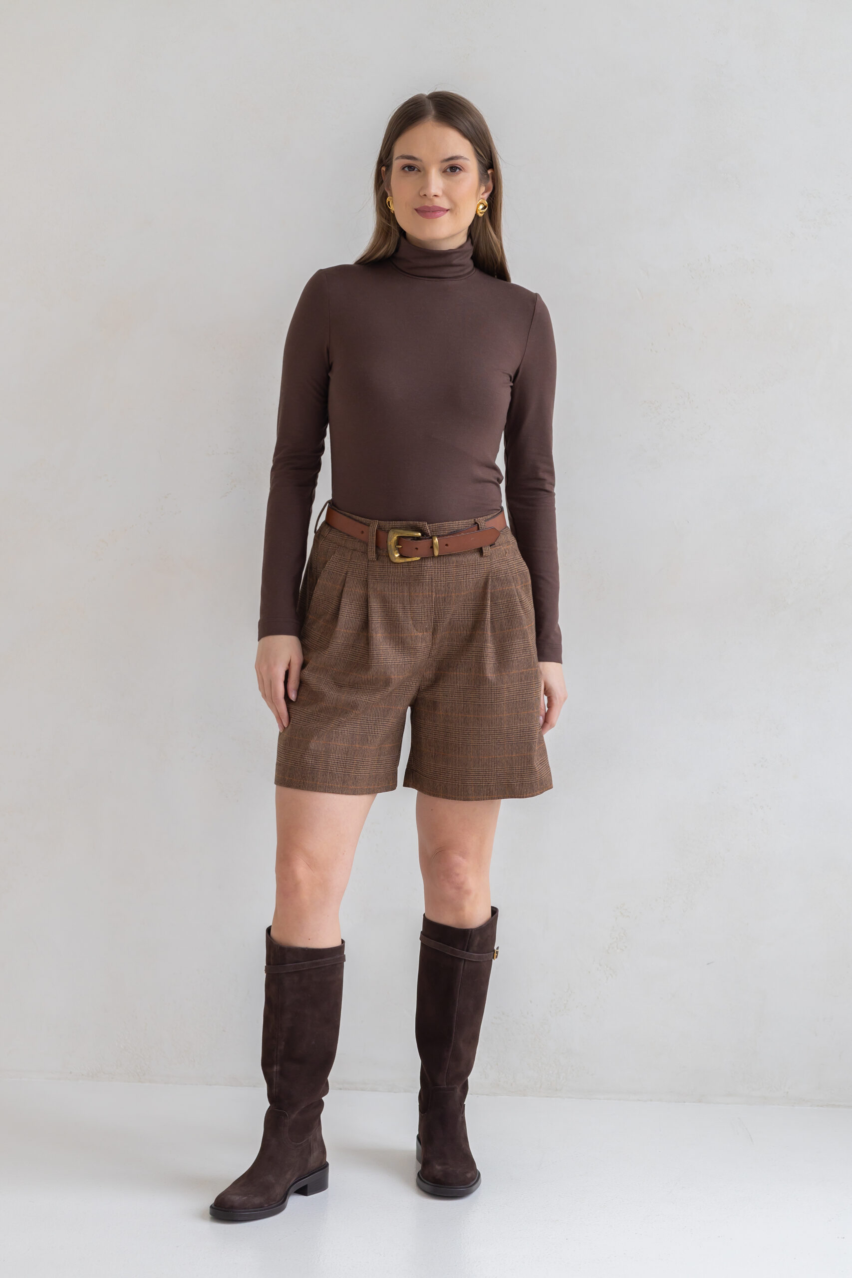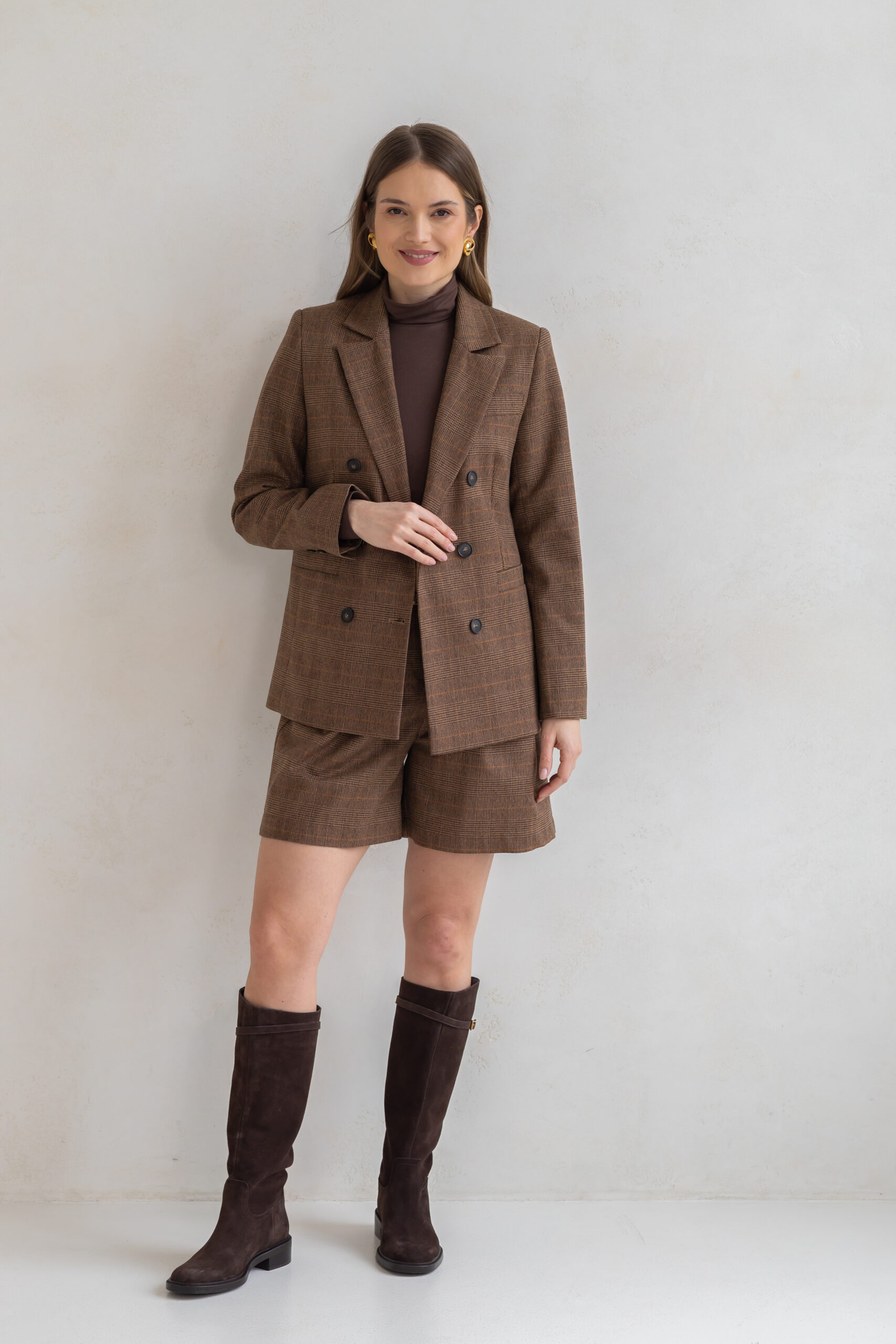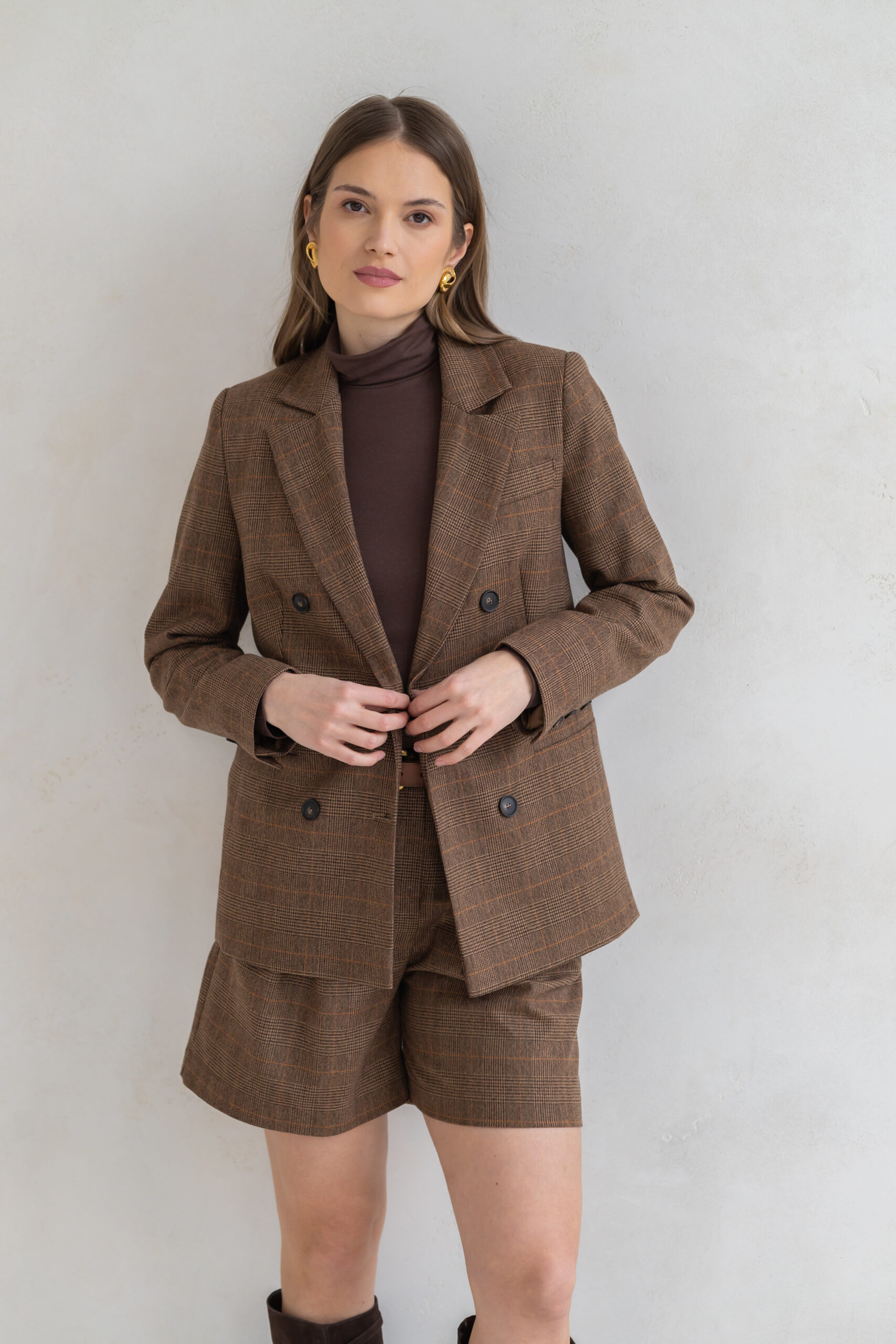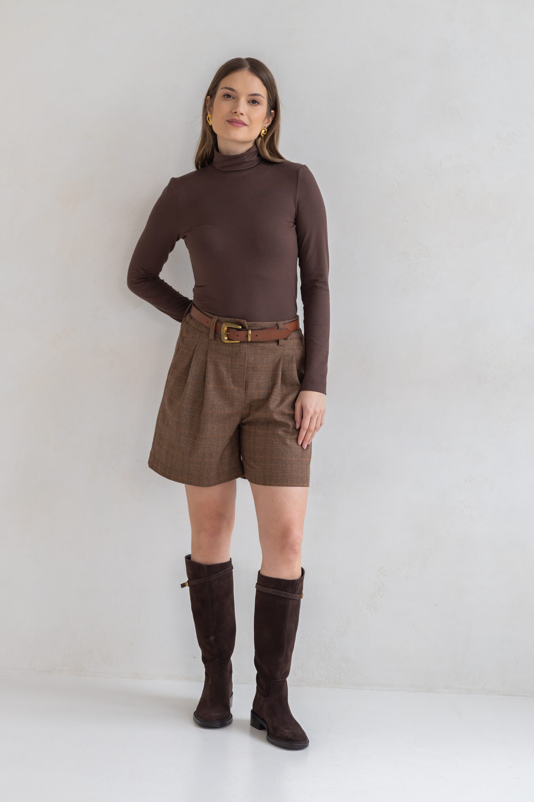 Wełniane szorty LILY w brązową kratę to kwintesencja elegancji i komfortu. Uszyte z mieszanki wełny i jedwabiu, zapewniają doskonałą termoizolację, przewiewność i miękkość, co sprawia, że są idealne na każdą porę roku.