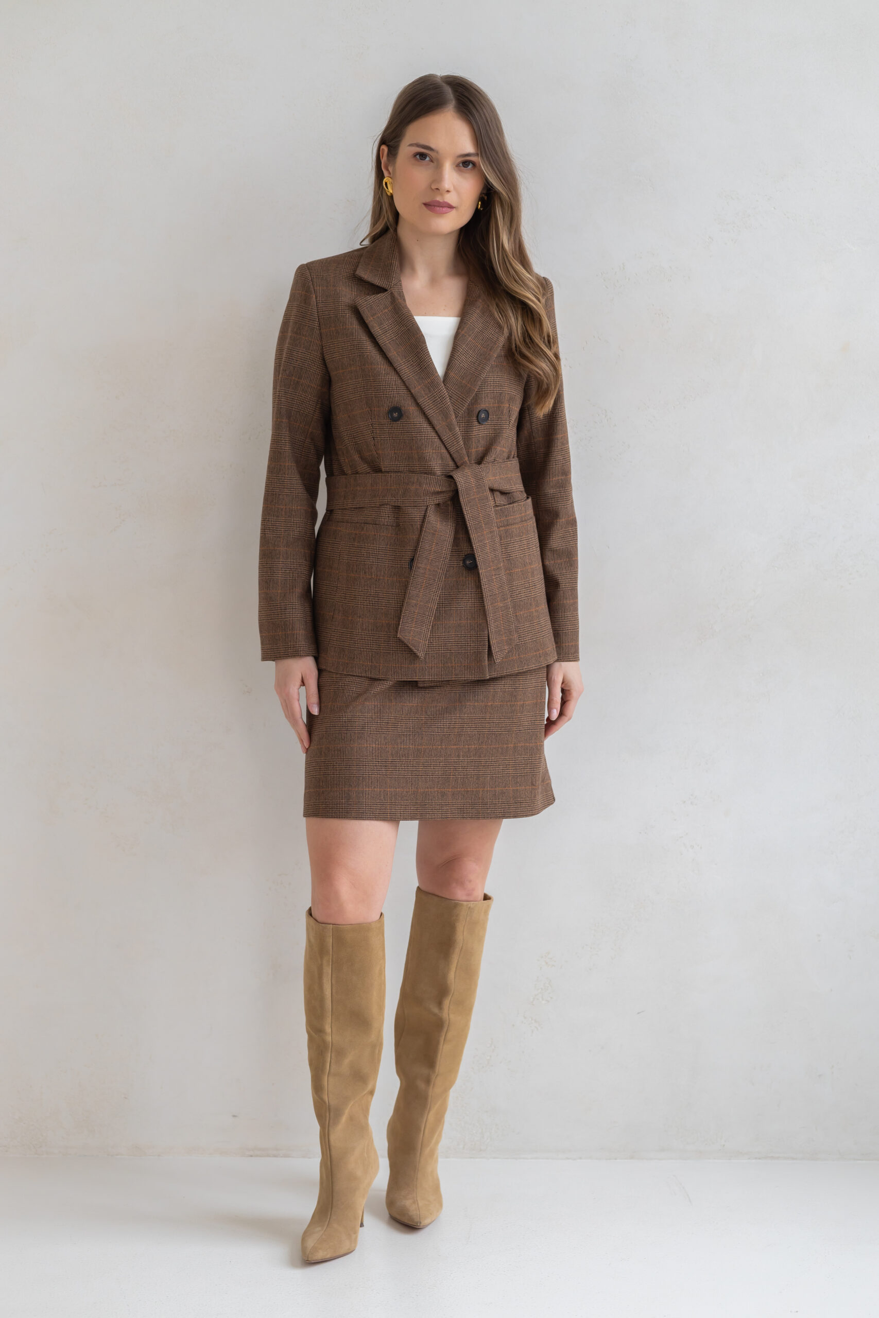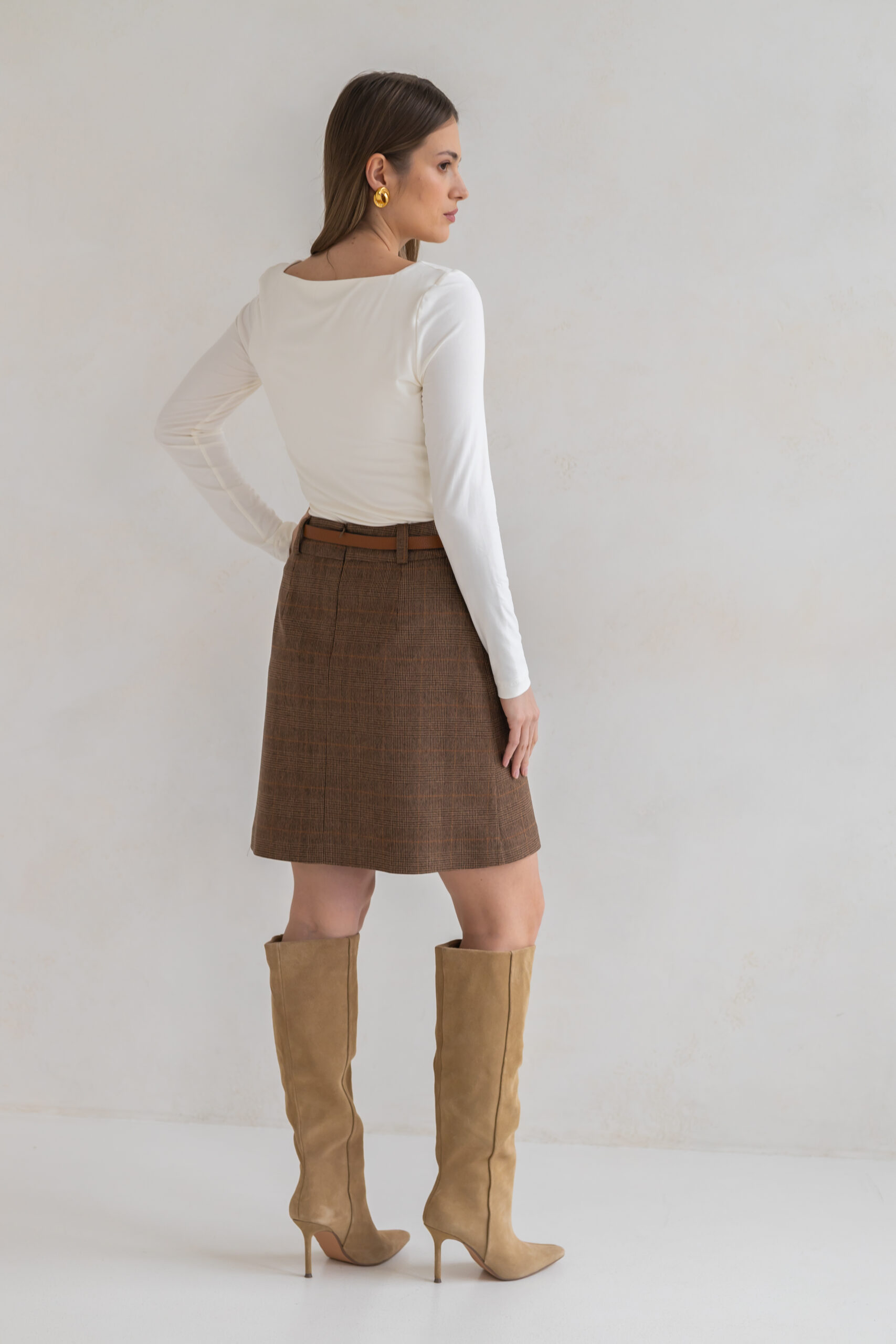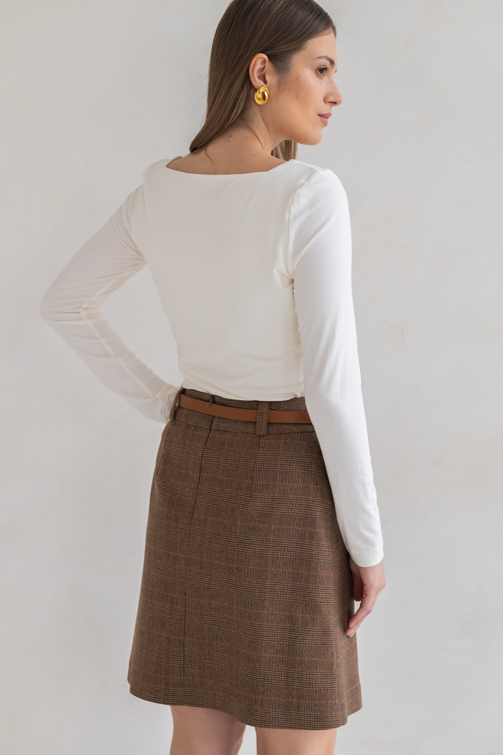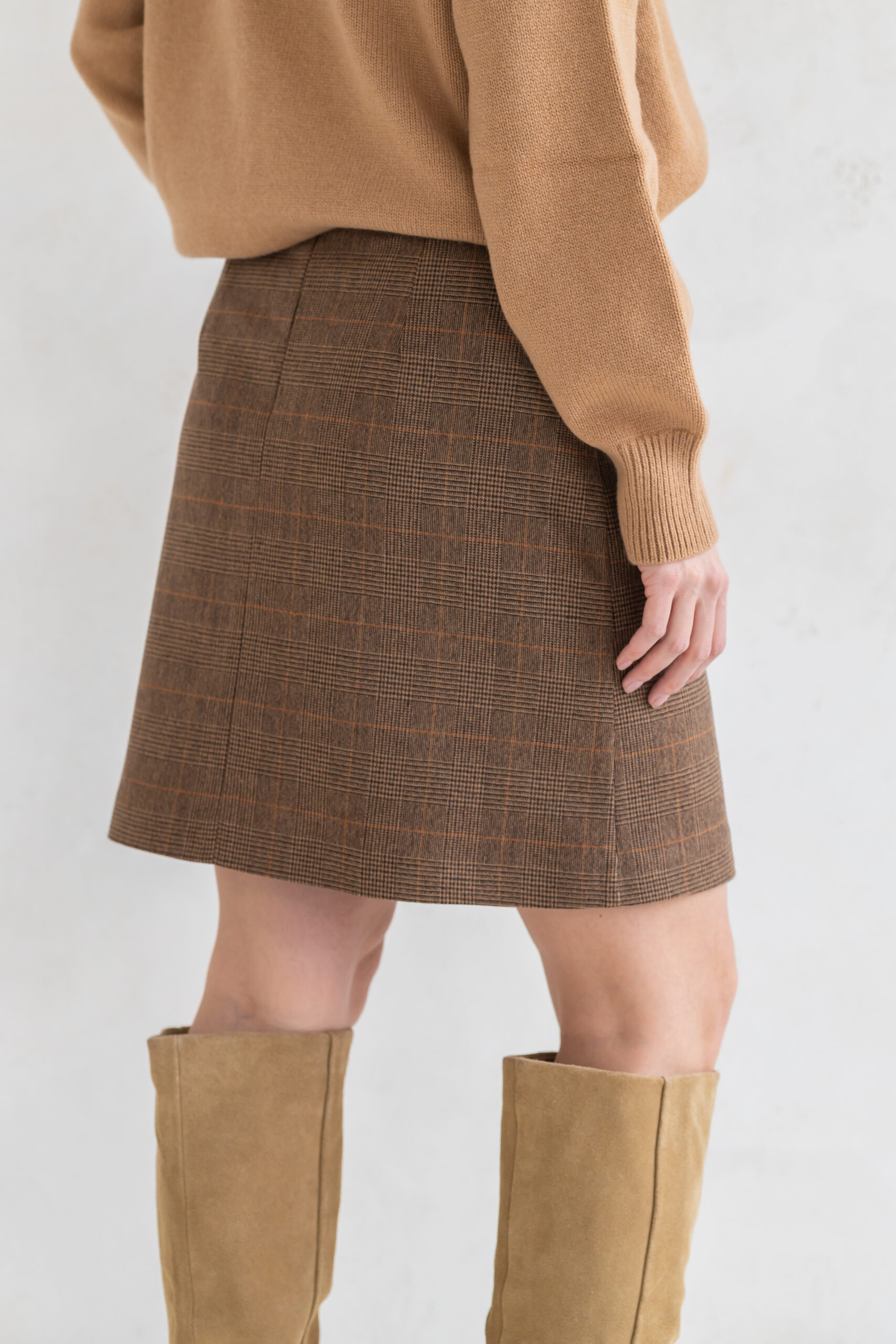 Spódnica Lily o kroju litery A w klasyczną brązową kratę to połączenie ponadczasowej formy i szlachetnej tkaniny.