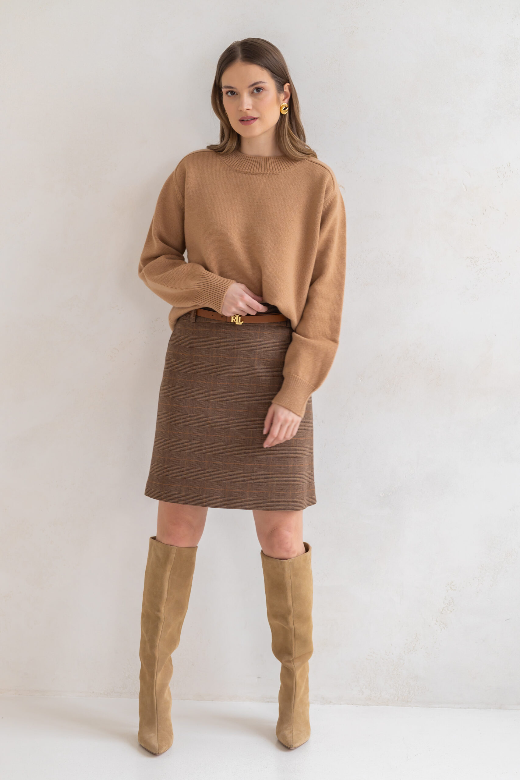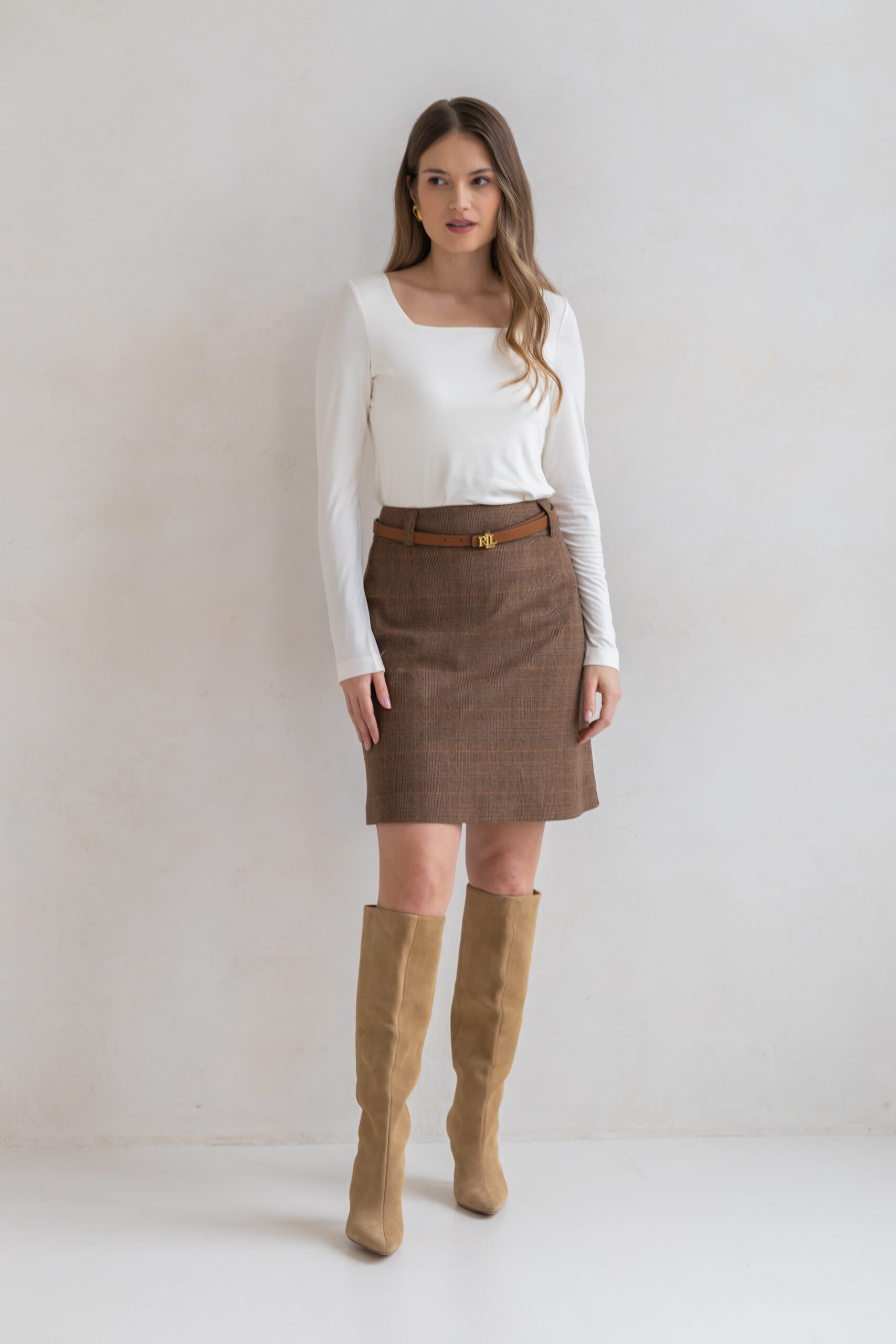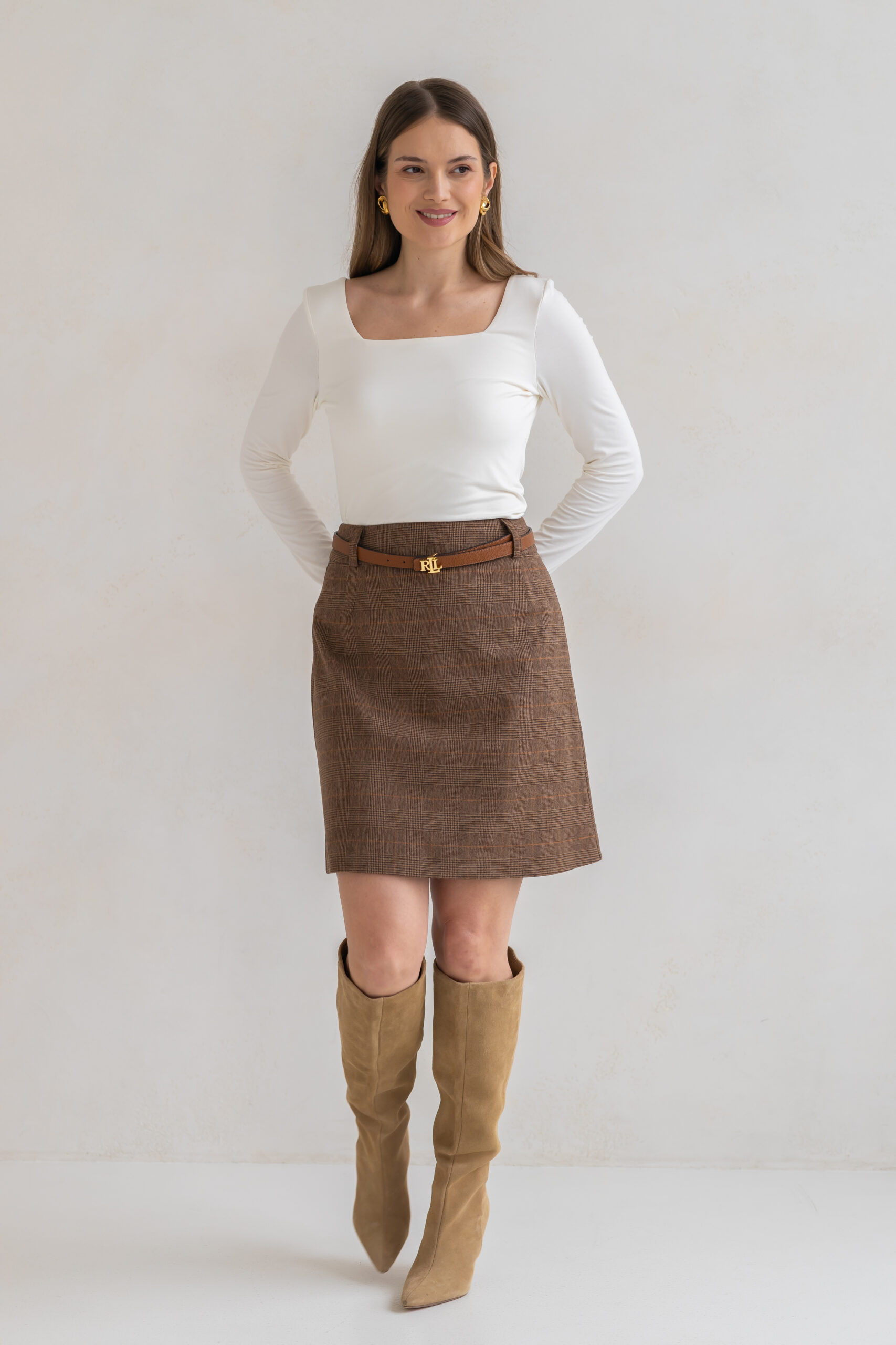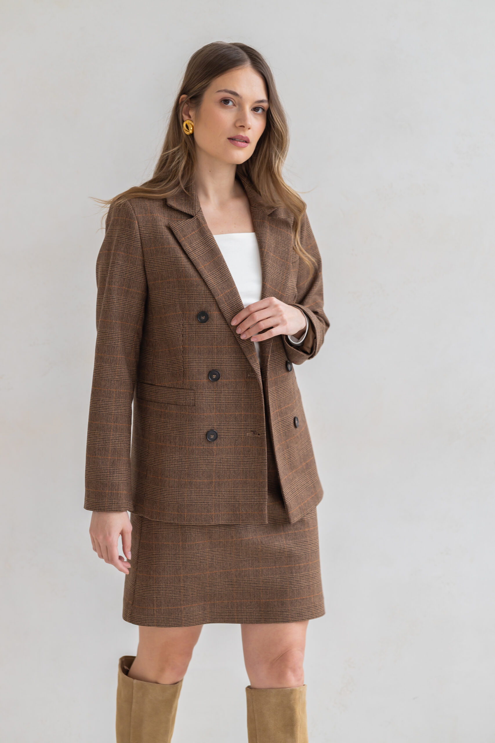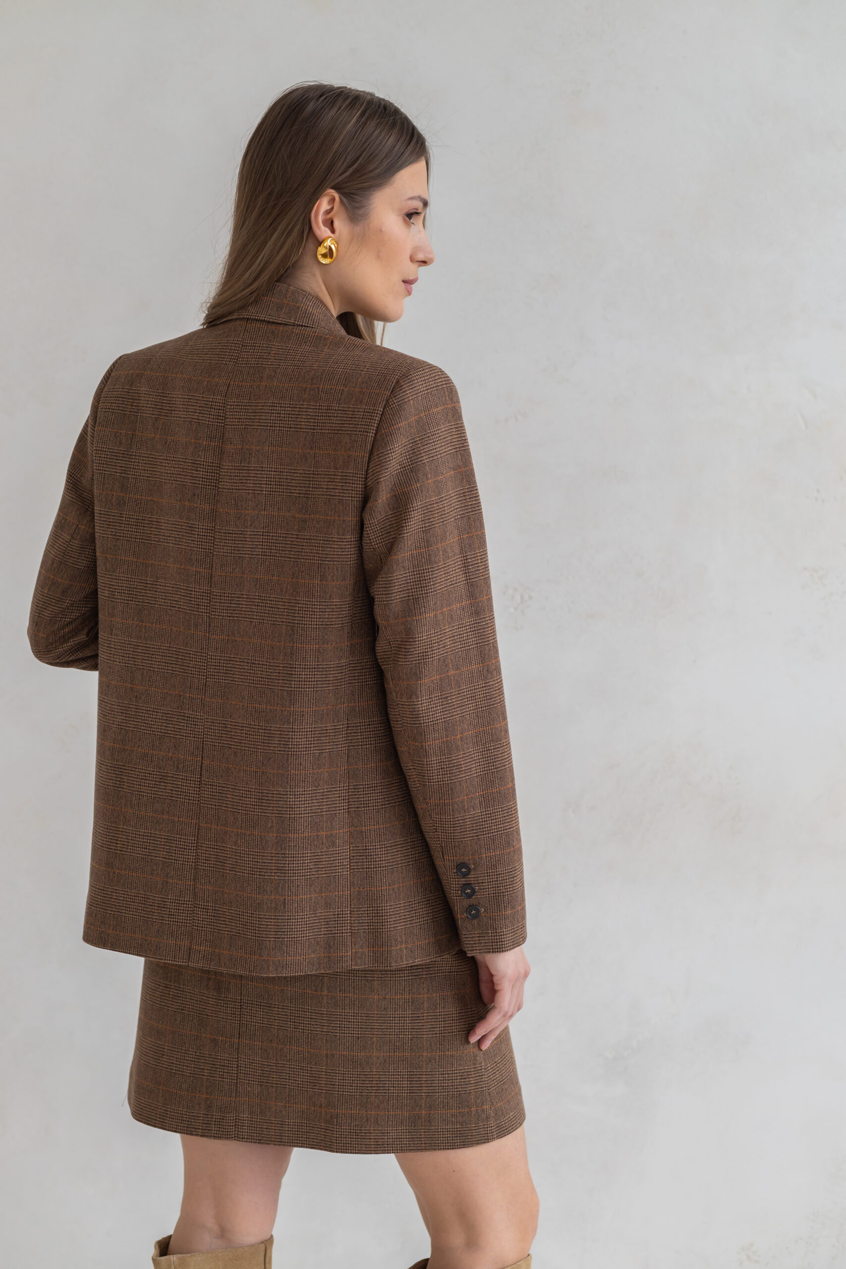 Spódnica Lily o kroju litery A w klasyczną brązową kratę to połączenie ponadczasowej formy i szlachetnej tkaniny.