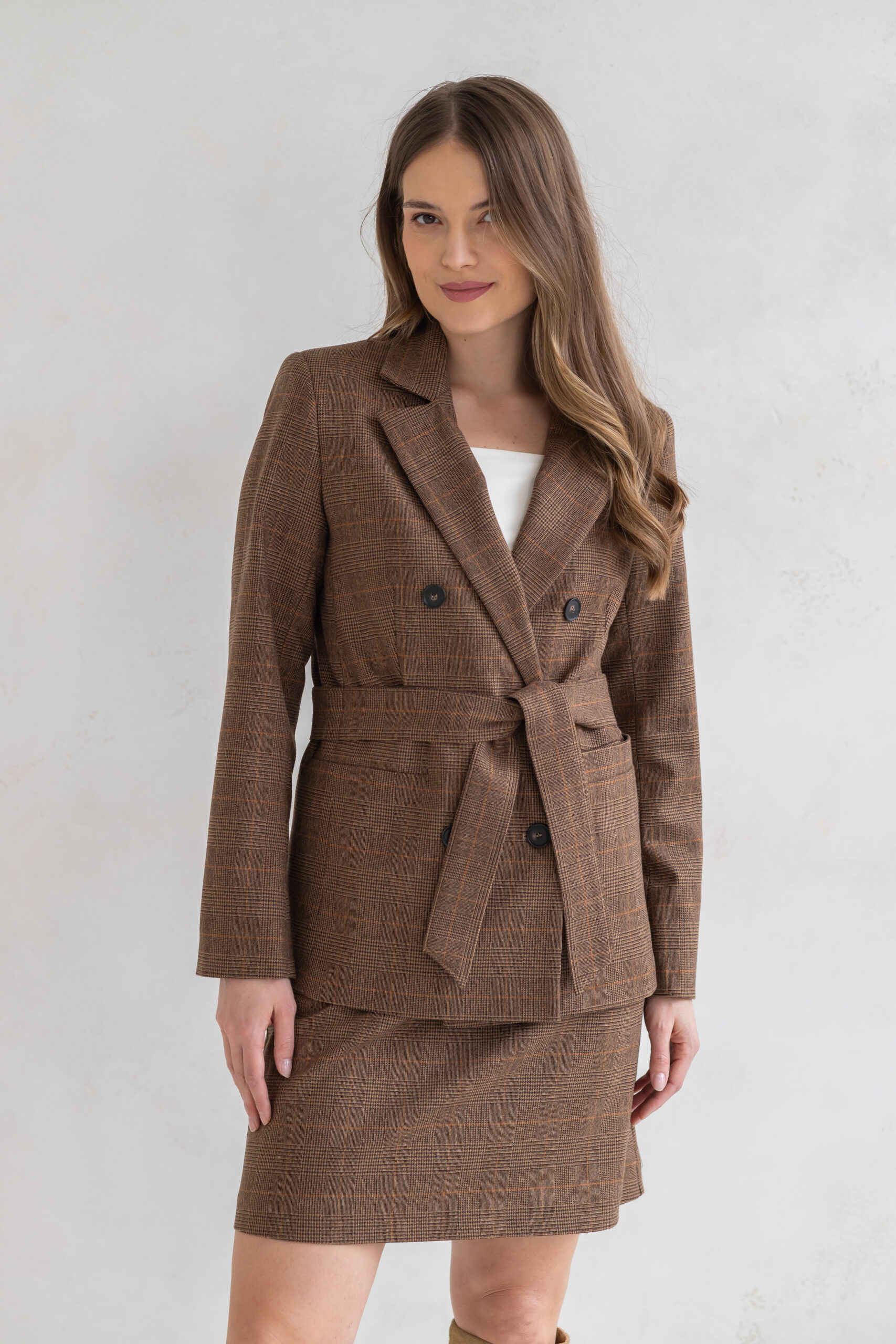Trapezowy fason pięknie podkreśla talię i delikatnie rozszerza się ku dołowi, optycznie wydłużając nogi i nadając sylwetce harmonijnych proporcji. Brązowa krata w ciepłej, szlachetnej tonacji sprawia, że model doskonale wpisuje się w estetykę sezonu przejściowego, pozostając jednocześnie inwestycją na lata.