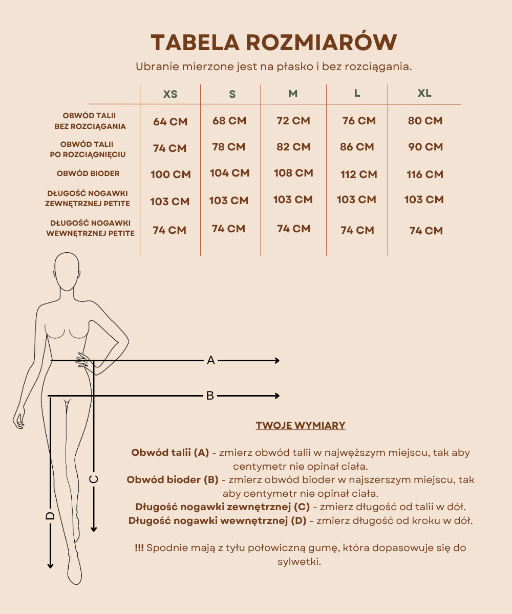Dopasowanie: dwie zaszewki z przodu + guma w tylnej części pasa dla idealnego dopasowania