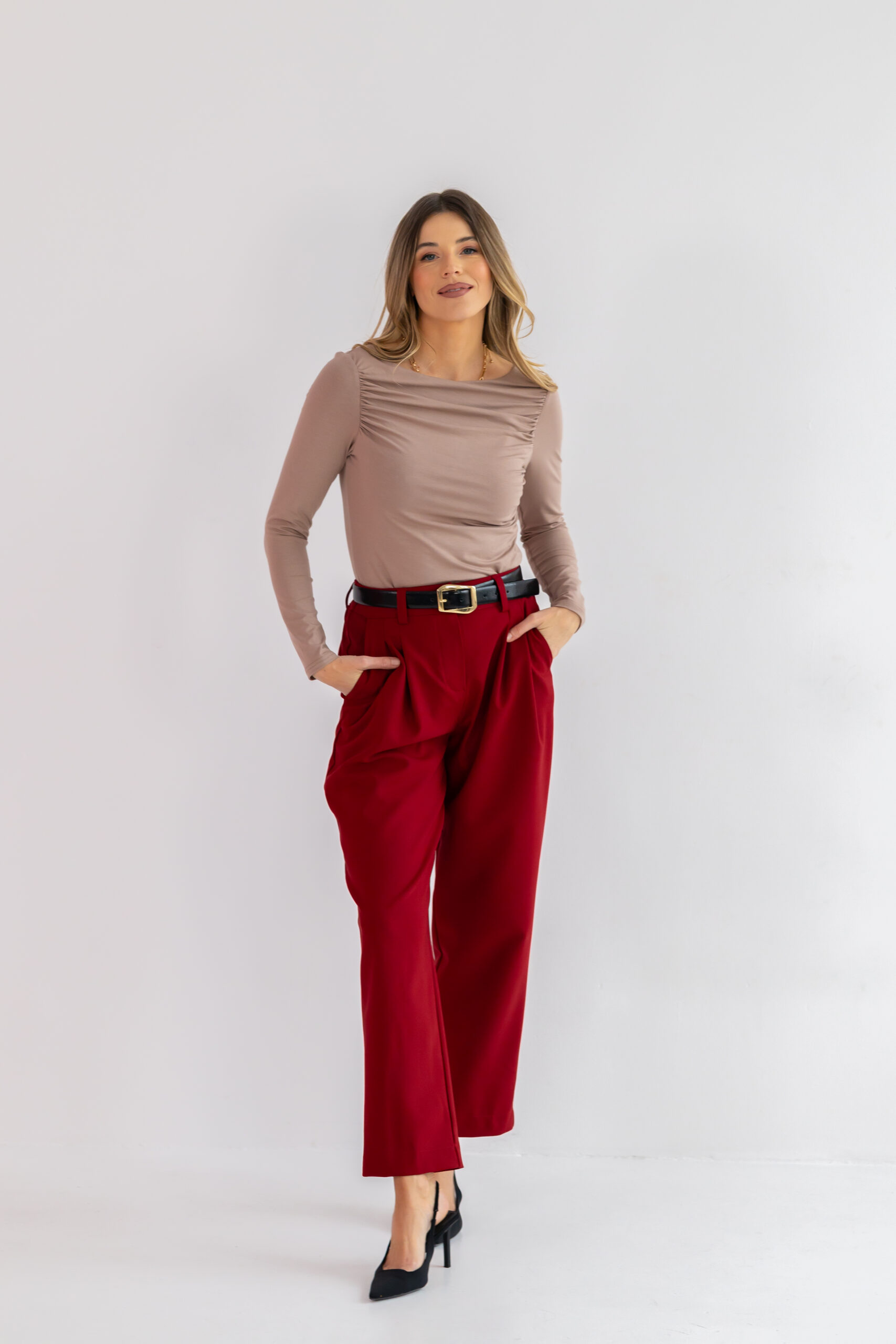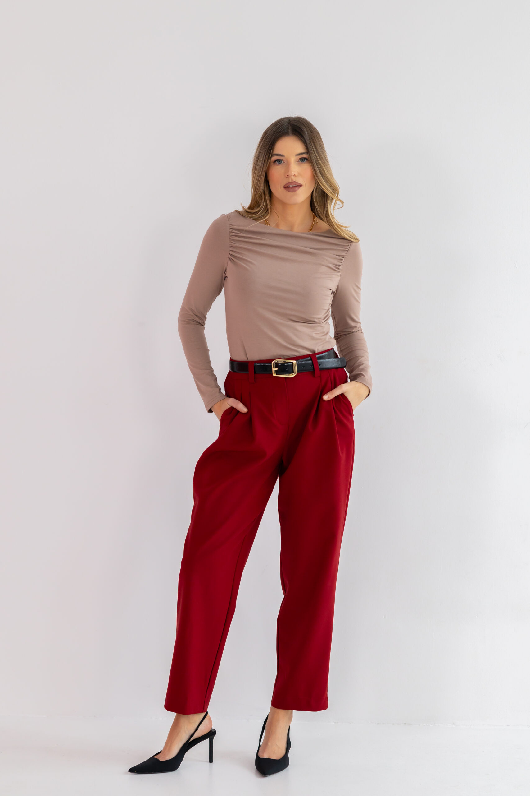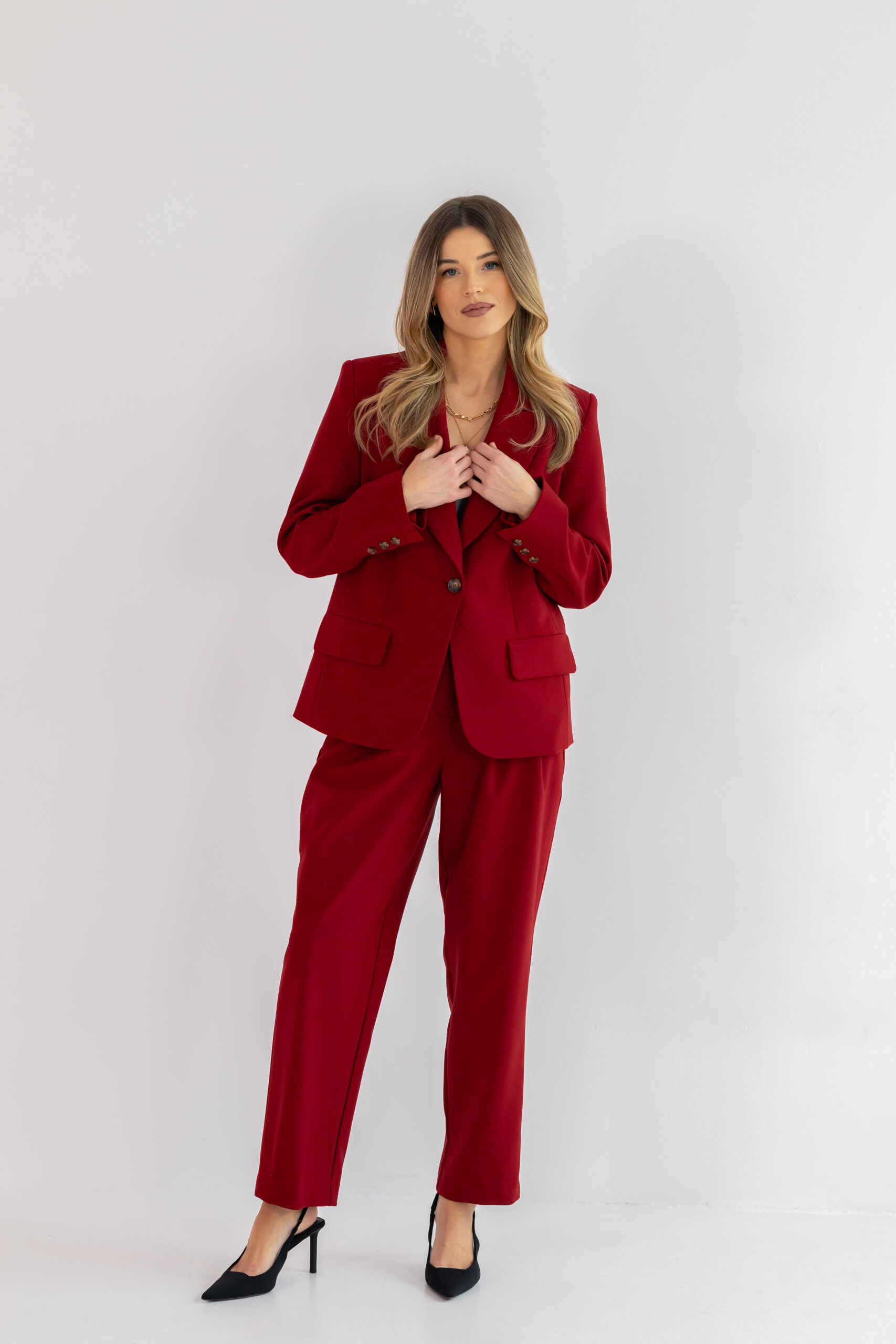 Nogawka jest delikatnie zwężana i lekko skrócona, co nadaje spodniom nowoczesnego charakteru i sprawia, że świetnie prezentują się zarówno z botkami, jak i z kozakami czy szpilkami. Głęboki bordowy kolor dodaje im wyjątkowej szlachetności i sprawia, że stają się niezwykle wyrazistą, a jednocześnie uniwersalną bazą w jesienno-zimowej garderobie.