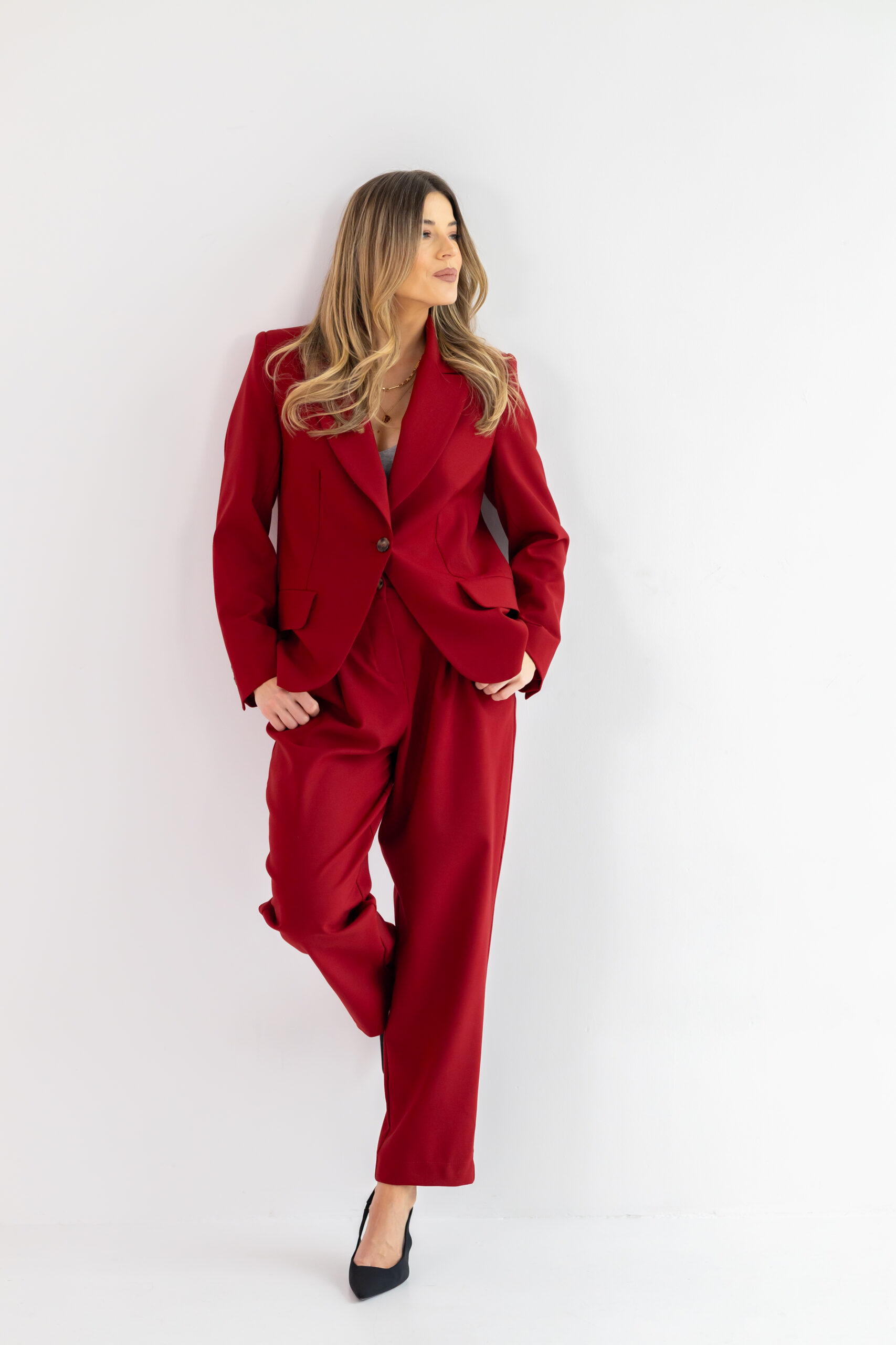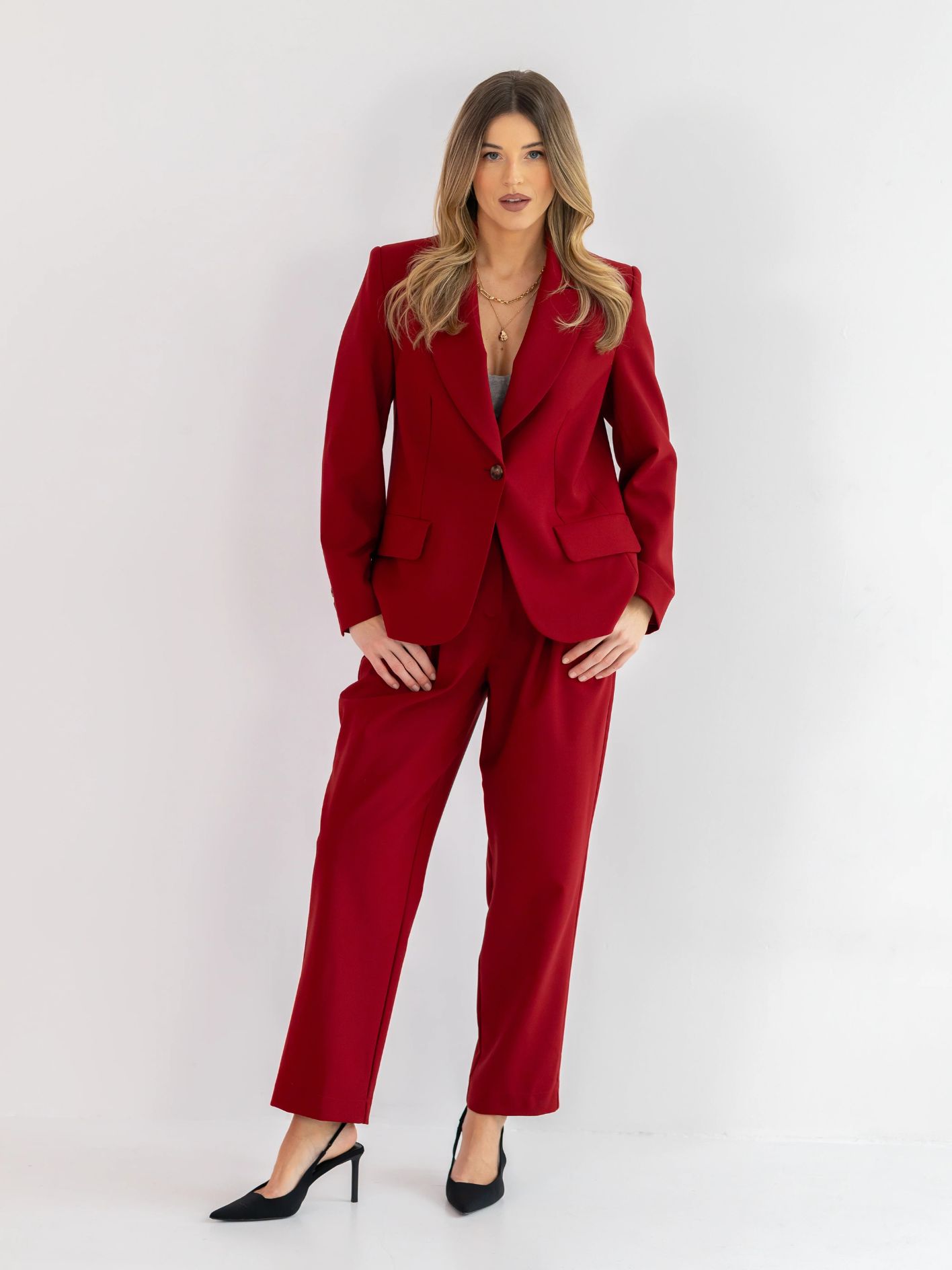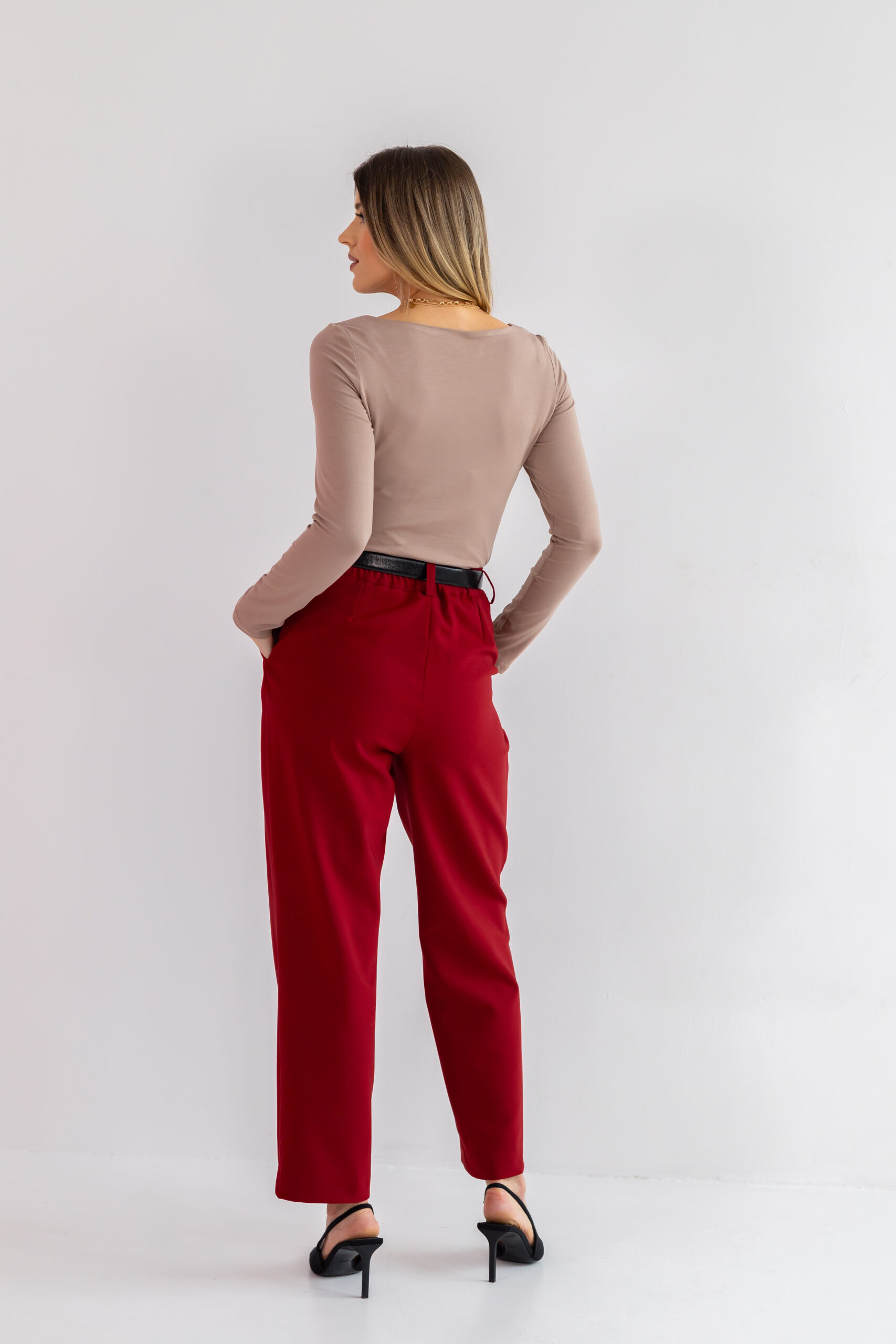 Nogawka jest delikatnie zwężana i lekko skrócona, co nadaje spodniom nowoczesnego charakteru i sprawia, że świetnie prezentują się zarówno z botkami, jak i z kozakami czy szpilkami. Głęboki bordowy kolor dodaje im wyjątkowej szlachetności i sprawia, że stają się niezwykle wyrazistą, a jednocześnie uniwersalną bazą w jesienno-zimowej garderobie.
